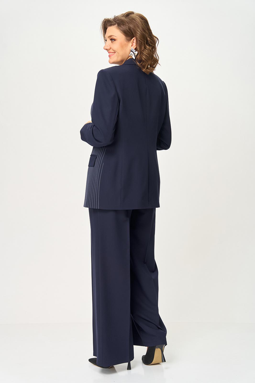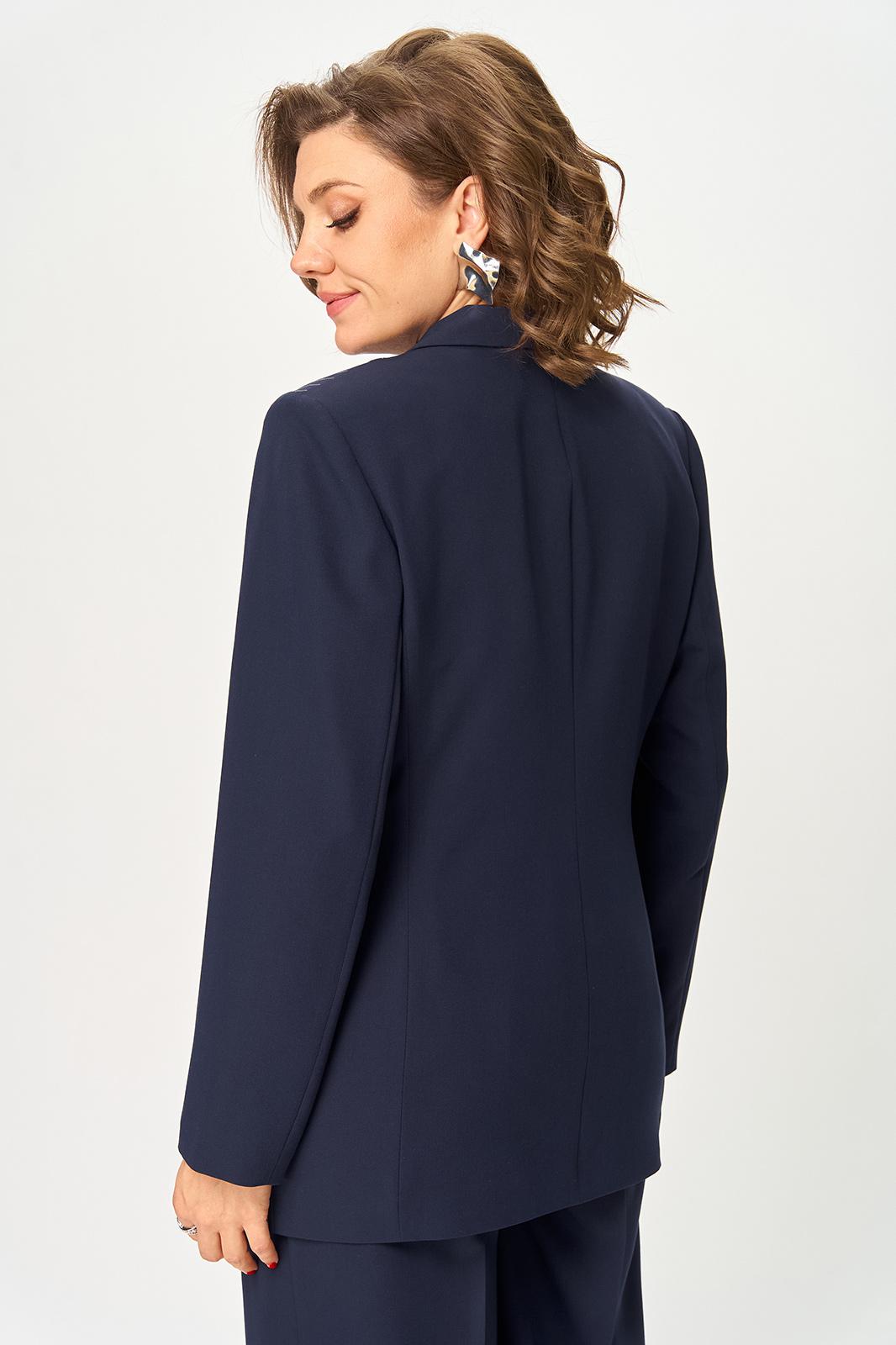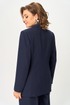 Полочка жакета с двубортной застежкой-трансформер на петли и пуговицы, вертикальными рельефами и прорезным карманом с клапаном. Левая полочка и лацкан правой полочки выполнены из отделочной ткани в полоску. Горловина V-образной формы, с отложными лацканами и воротником пиджачного типа. Спинка со средним швом и вертикальными рельефами. Рукав длинный, двухшовный, втачной.