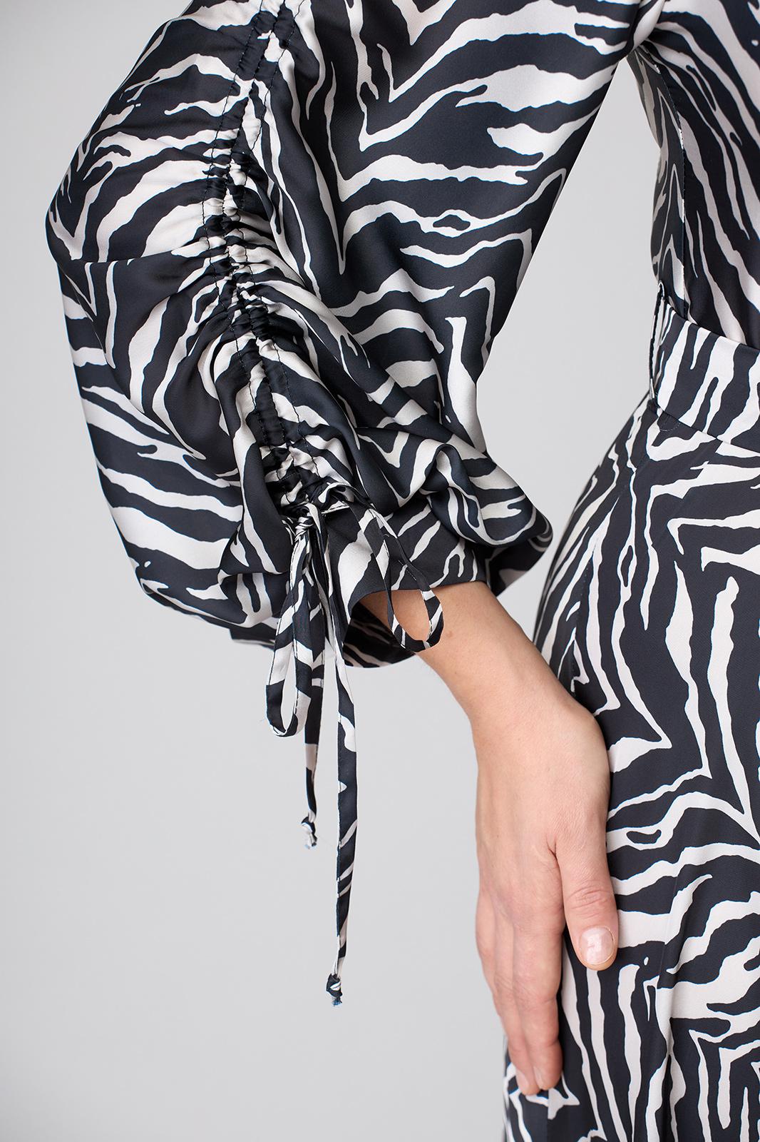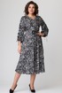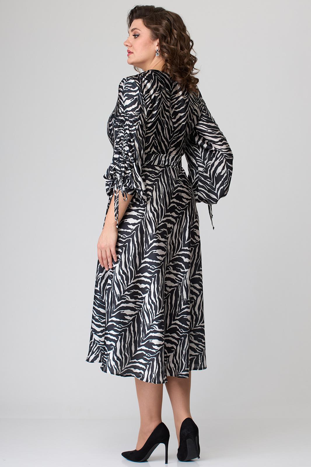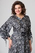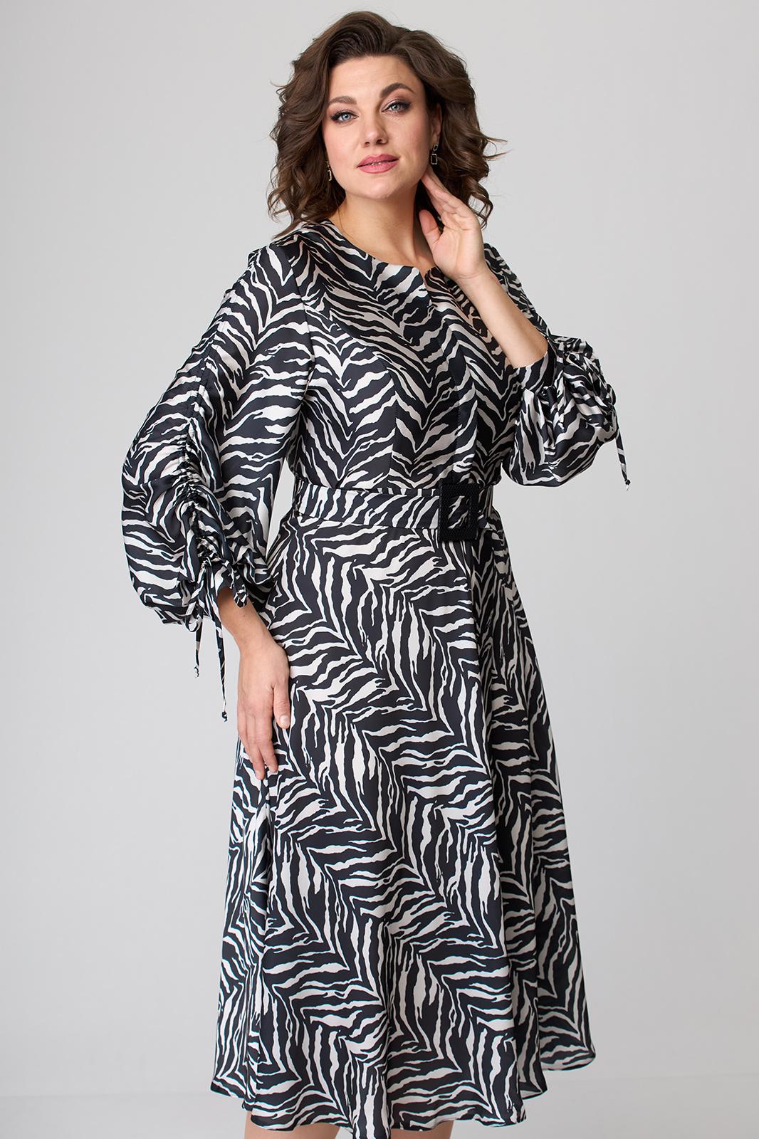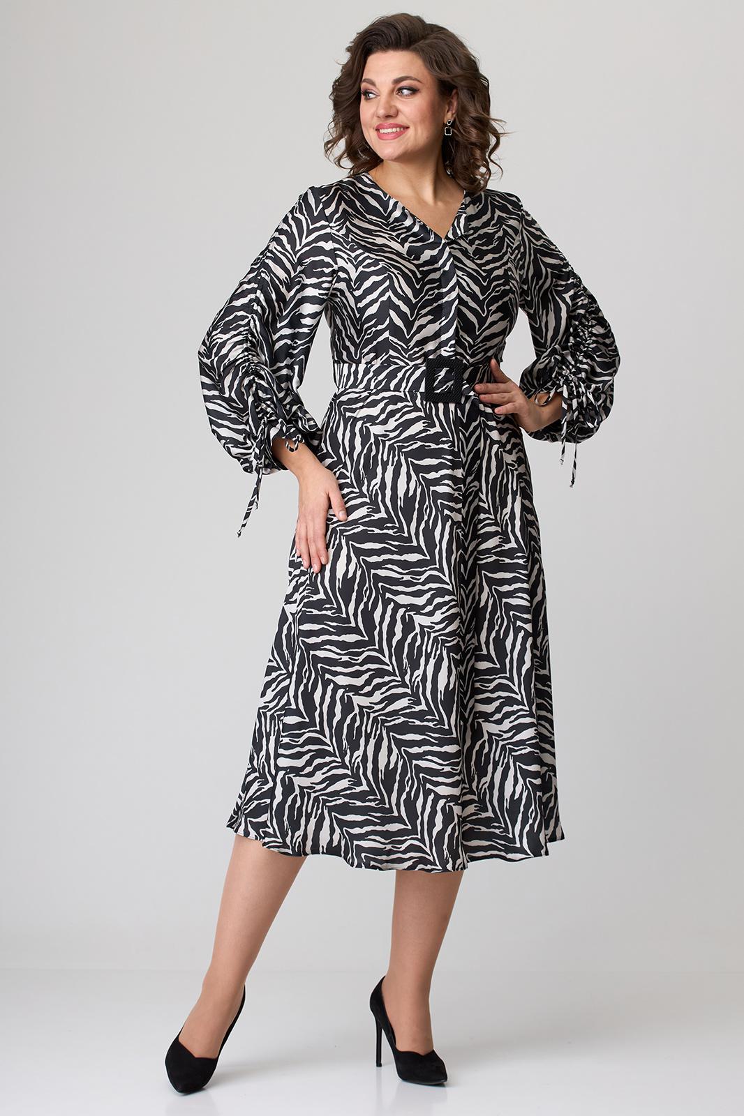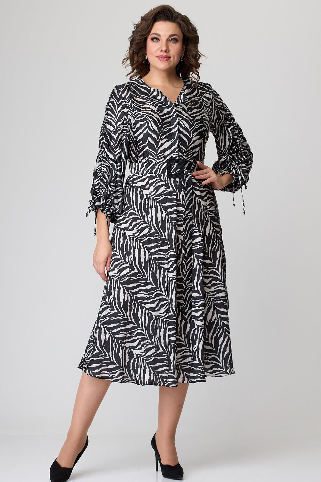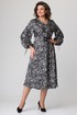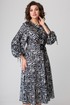 Платье длиной за колено, выполнено из ткани с набивным рисунком. Лиф платья отрезной по линии талии. Полочка лифа с вертикальными рельефами, супатной застежкой по центру. Горловина круглой формы. Спинка лифа с вертикальными рельефами. Юбка лифа притачная, А-образного силуэта. В левом боковом шве обработана потайная молния. По боковым швам в области талии настрочены шлевки, через которые продет пояс с пряжкой. Рукав втачной, двухшовный, по низу на притачной манжете. По верхнему шву рукава обработана кулиса. Съемный пояс в комплекте.