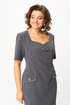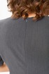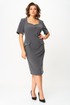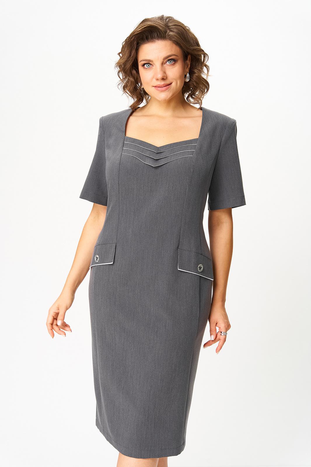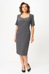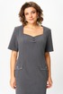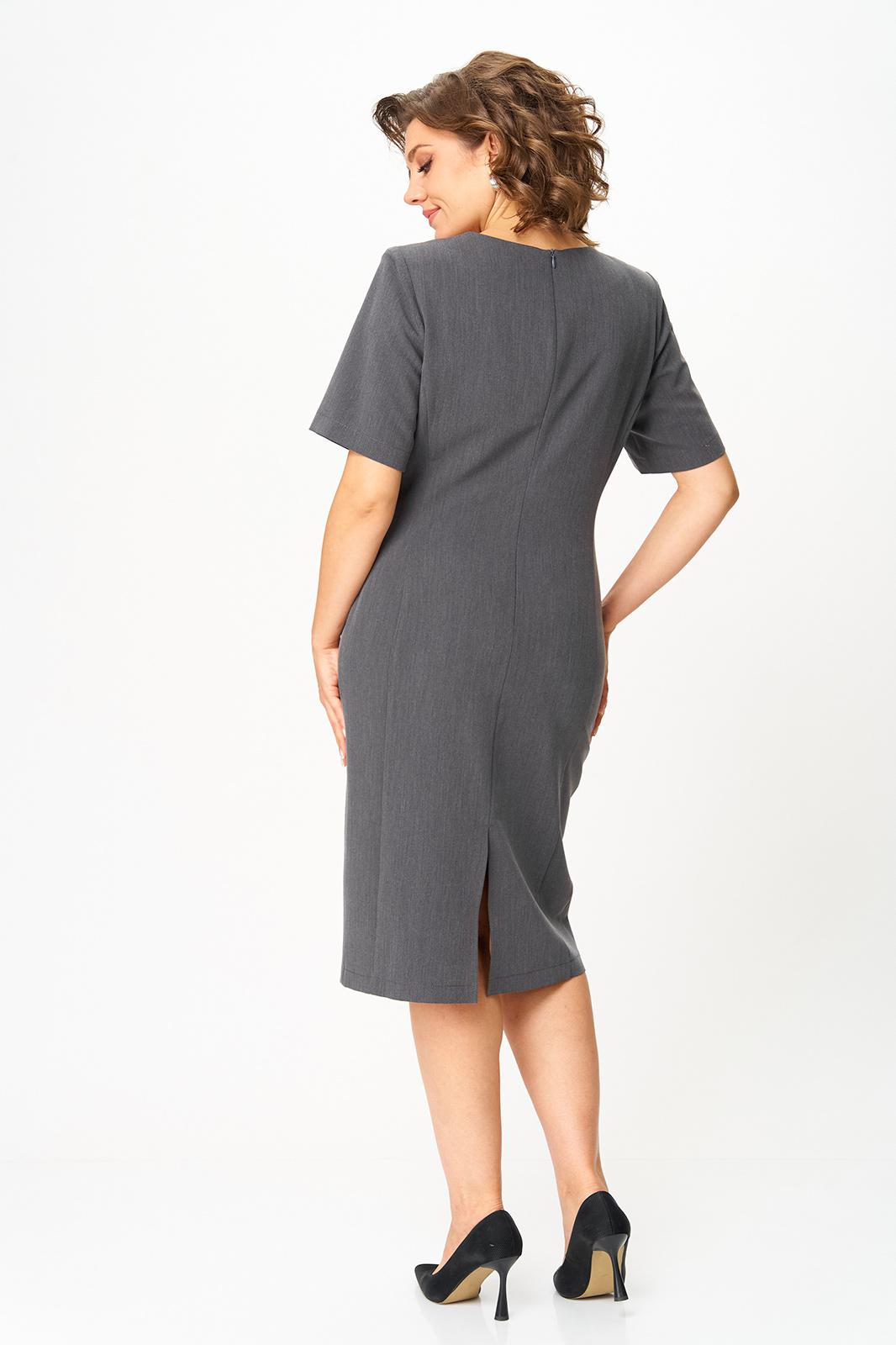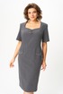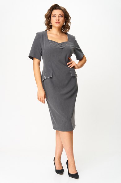 Полочка платья с вертикальными рельефами, горловина формы “каре”с декором в виде планок с отделкой. Ниже линии талии обработаны декоративные клапаны с отделкой и пуговицами. Спинка со средним швом, в нижней части которого обработан разрез, в верхней части потайная молния. Рукав длиной до локтя , одношовный, втачной.