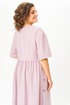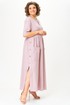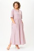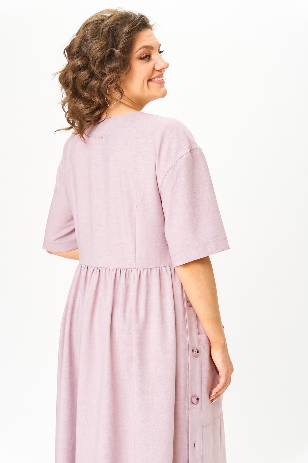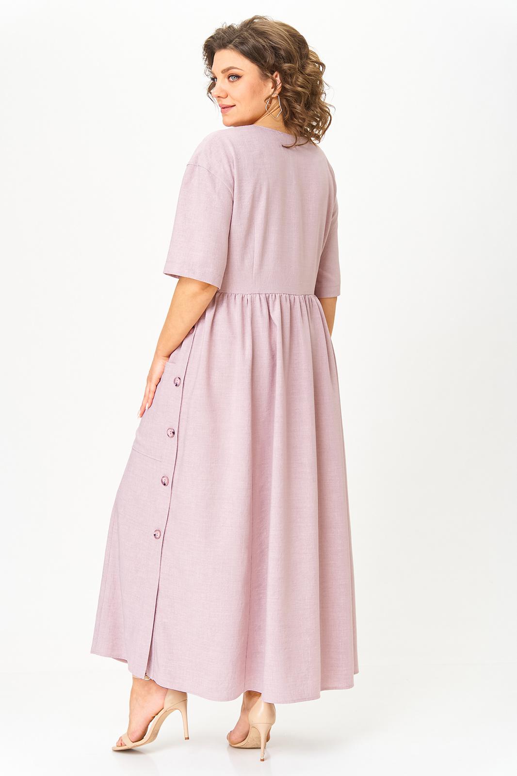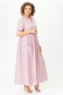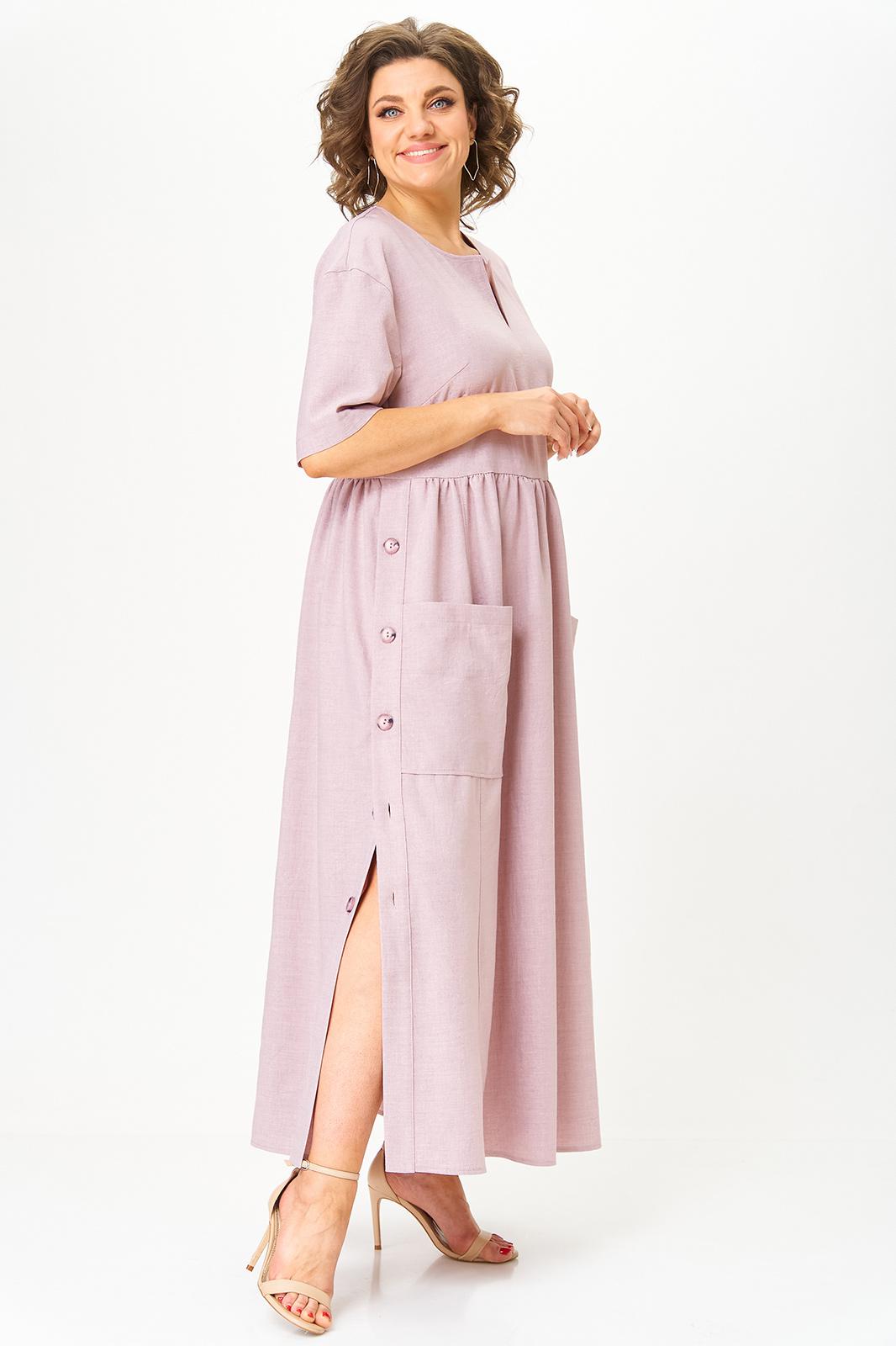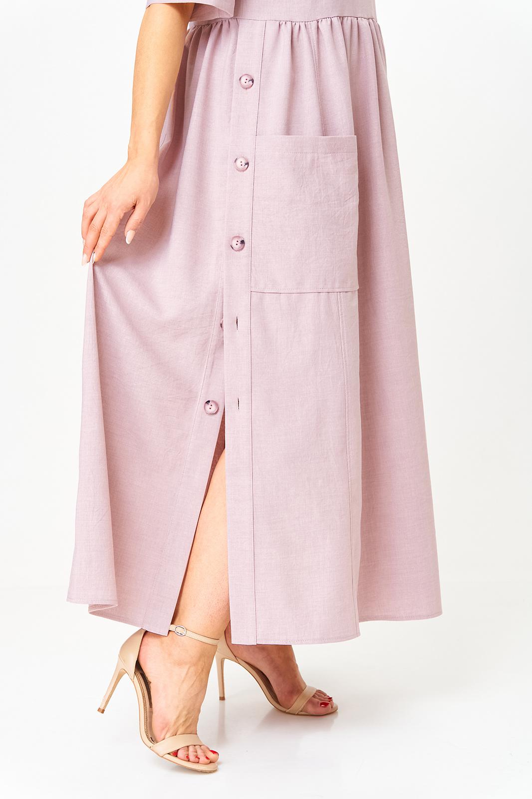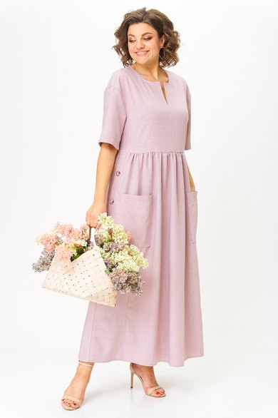 Платье свободного силуэта, длиной макси. Платье выполнено из однотонной ткани с легким эффектом “крэш”. Лиф платья отрезной по линии талии. Полочка лифа с нагрудными вытачками и средним швом в верхней части которого обработан разрез. Спинка лифа цельная с талиевыми вытачками. Горловина круглой формы. Пройма углубленной формы. Рукав одношовный, длиной до локтя. Юбка со сборкой по шву притачивания к лифу. По боковым швам обработаны притачные планки с застежкой на петли и пуговицы. На передней части юбки обработаны накладные карманы.