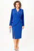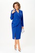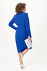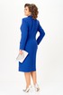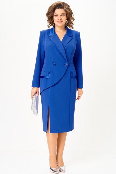 Платье полуприлегающего силуэта, длиной за колено, выполнено из однотонной ткани. В качестве отделки использована однотонная ткань с атласным эффектом. Полочка платья с вертикальными рельефами и ассиметричной отлетной правой частью, с двубортной застежкой на петли и пуговицы. По бочкам обработаны декоративные клапаны. Горловина V-образной формы с отложными лацканами и воротником . Спинка платья со средним швом и вертикальными рельефами. В левом боковом шве обработана потайная молния. В нижней части полочки, с правой стороны в рельефе обработан разрез. Рукав втачной, двухшовный, длинный. Платье на плечиках.