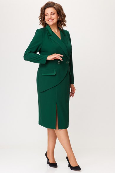 Платье полуприлегающего силуэта, длиной за колено, выполнено из однотонной ткани. В качестве отделки использована однотонная ткань с атласным эффектом. Полочка платья с вертикальными рельефами и ассиметричной отлетной правой частью, с двубортной застежкой на петли и пуговицы. По бочкам обработаны декоративные клапаны. Горловина V-образной формы с отложными лацканами и воротником . Спинка платья со средним швом и вертикальными рельефами. В левом боковом шве обработана потайная молния. В нижней части полочки, с правой стороны в рельефе обработан разрез. Рукав втачной, двухшовный, длинный. Платье на плечиках.