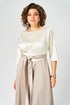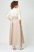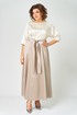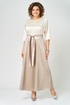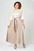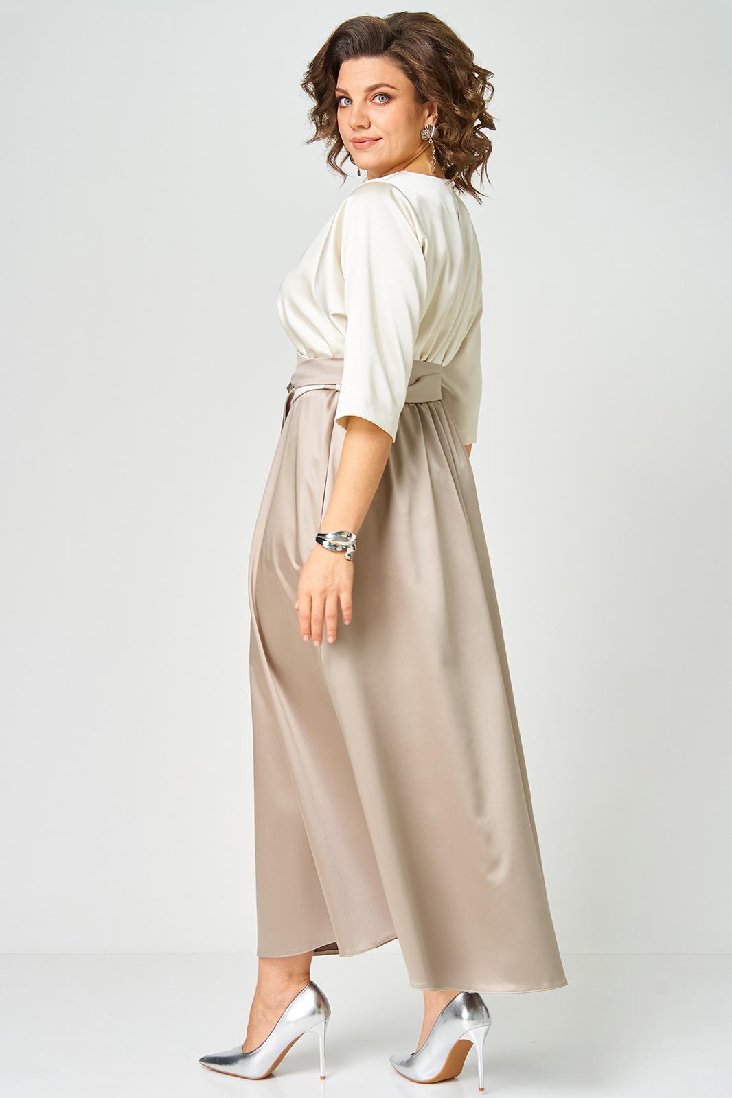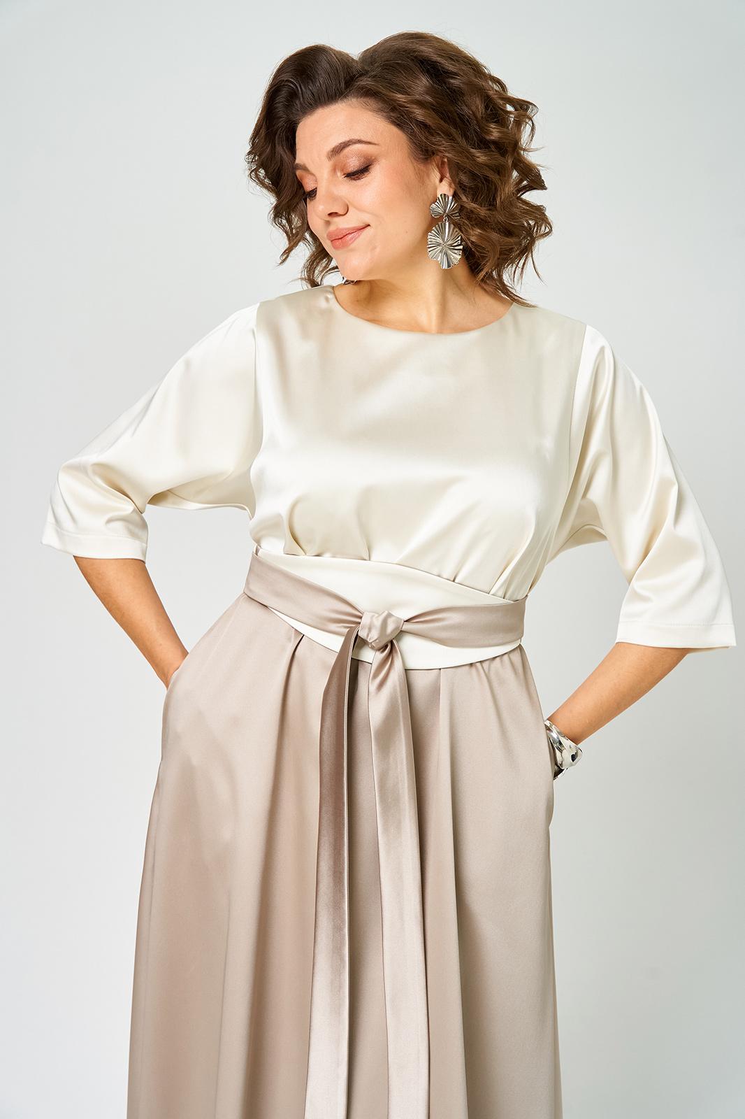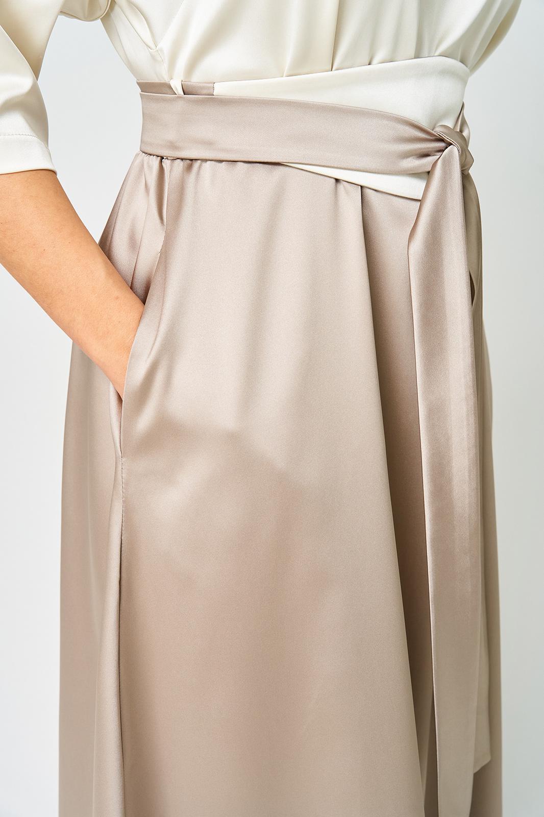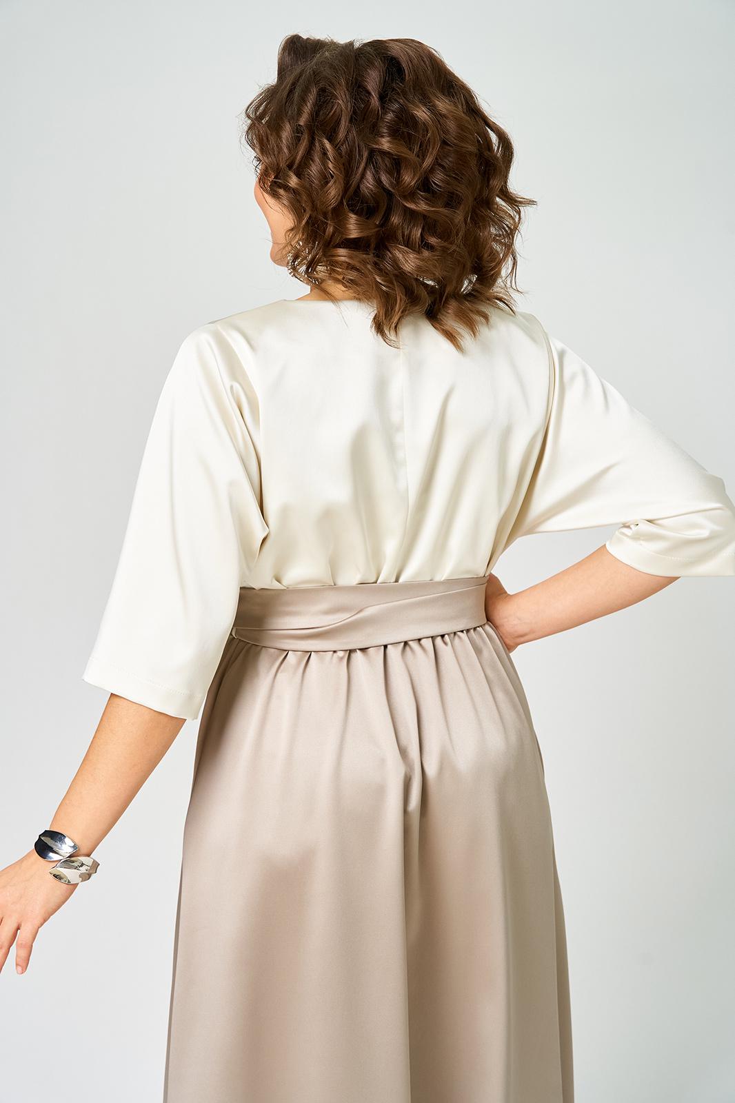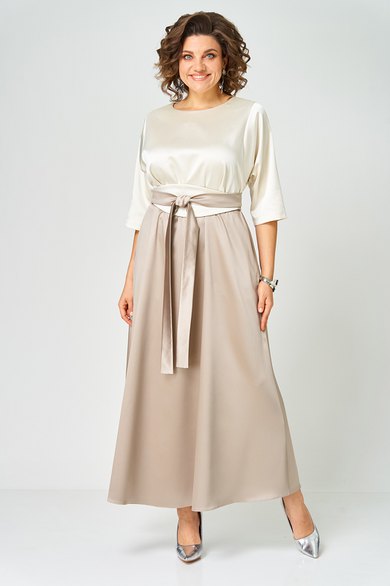 Платье выполнено из однотонной ткани с атласным эффектом в сочетании двух цветов. Платье длинной макси с акцентом в области талии в виде съемного пояса кушак. Платье отрезное по линии талии. Полочка с горловиной овальной формы. Спинка со средним швом, в верхней части которого обработана капля-разрез с застежкой на навесную петлю и пуговицу. Рукав одношовный длиной 3/4. Юбка формы колокол. В боковых швах юбки обработаны карманы. По талии платье с эластичной тесьмой. В боковых швах лифа обработаны шлёвки, через которые продевается пояс-кушак.