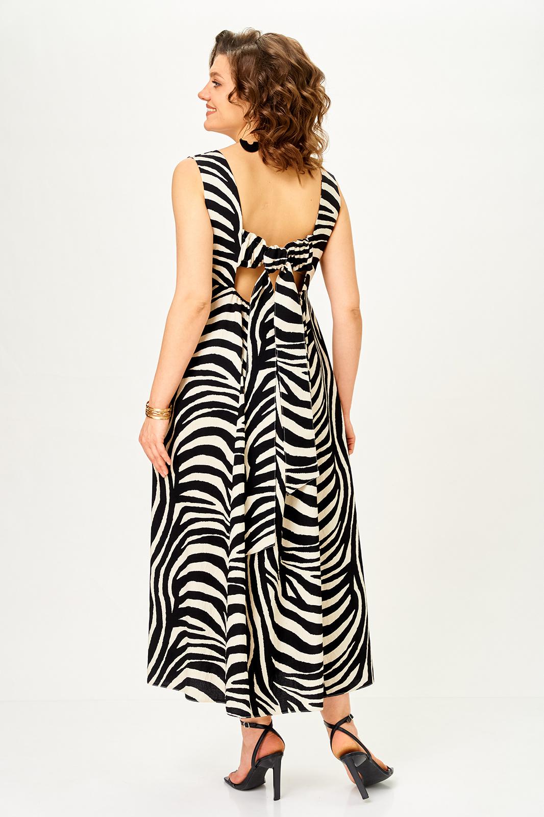 Сарафан с завышенной линией талии и отрезным лифом. Полочка лифа с вертикальными рельефами. Горловина формы “каре”. Лиф на бретелях. Спинка лифа по центральной части открытая, с элементом в виде горизонтальной планки с эластичной тесьмой и завязками. Бретели полочки лифа переходят в цельнокроеные бретели с бочком спинки. По вырезу спинки обработаны широкие завязки с эластичной тесьмой. Юбка сарафана состоит из шести клиньев. По задней центральной части в области талии обработана эластичная тесьма.