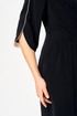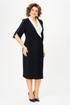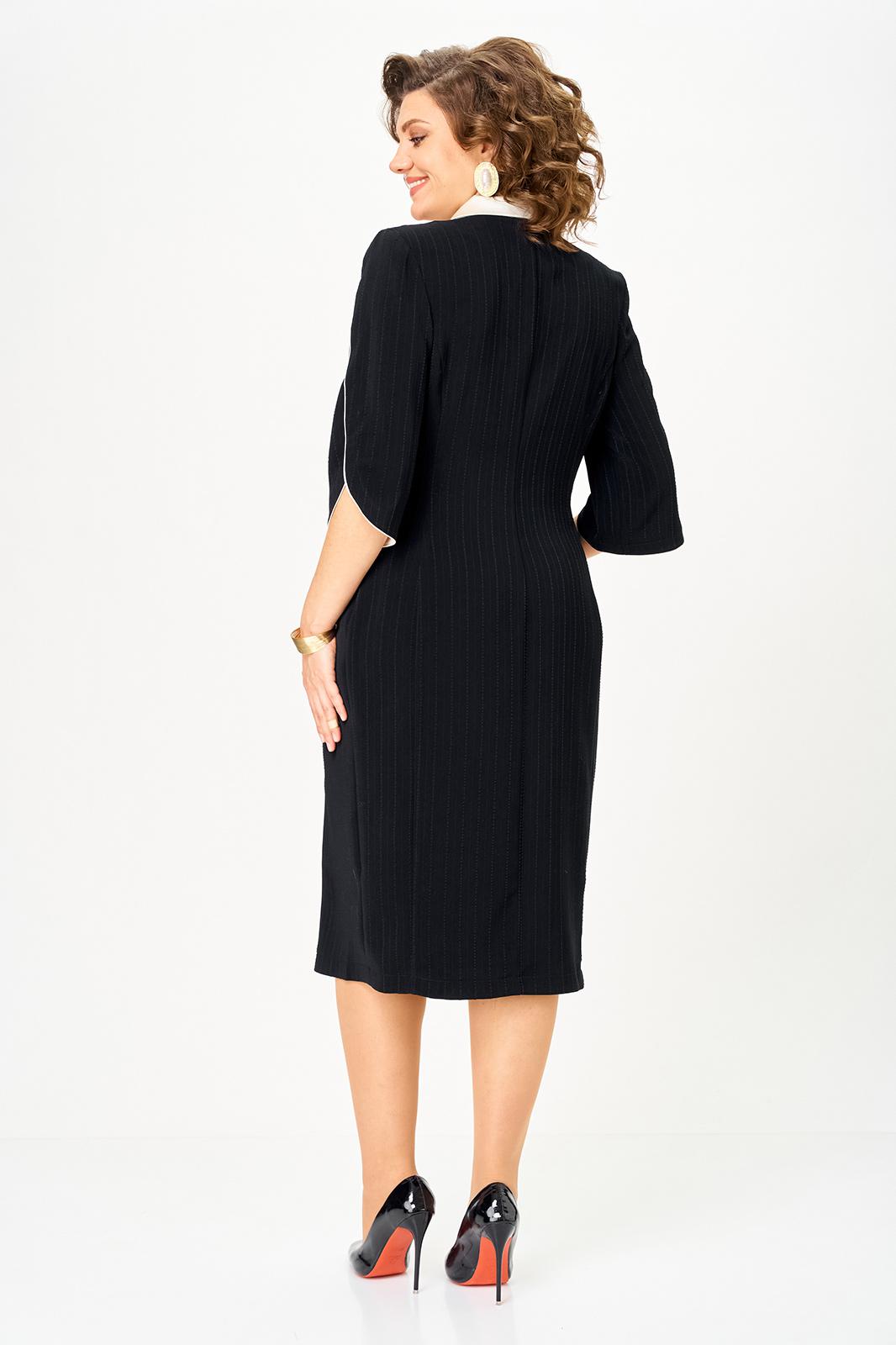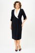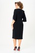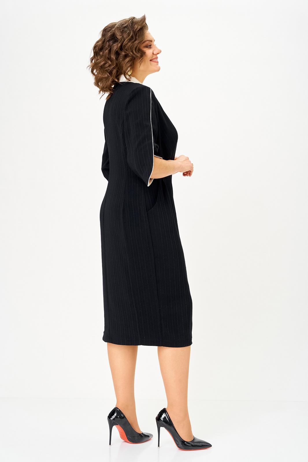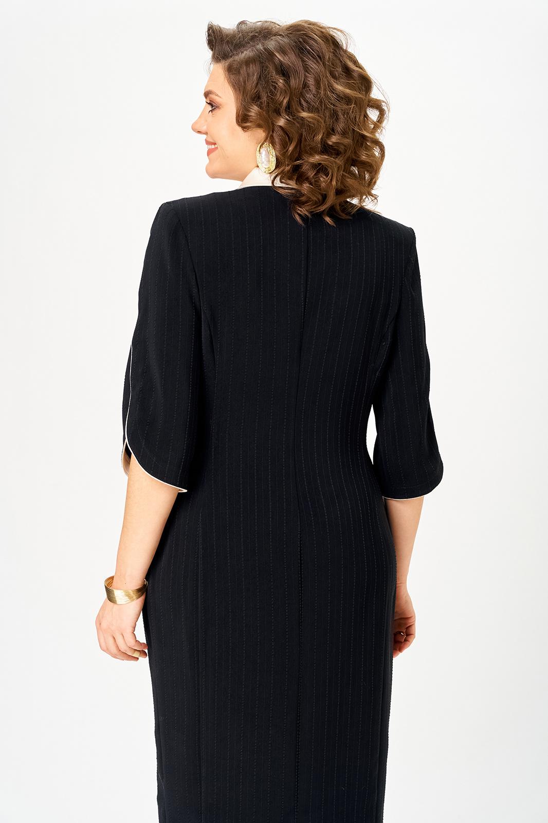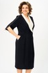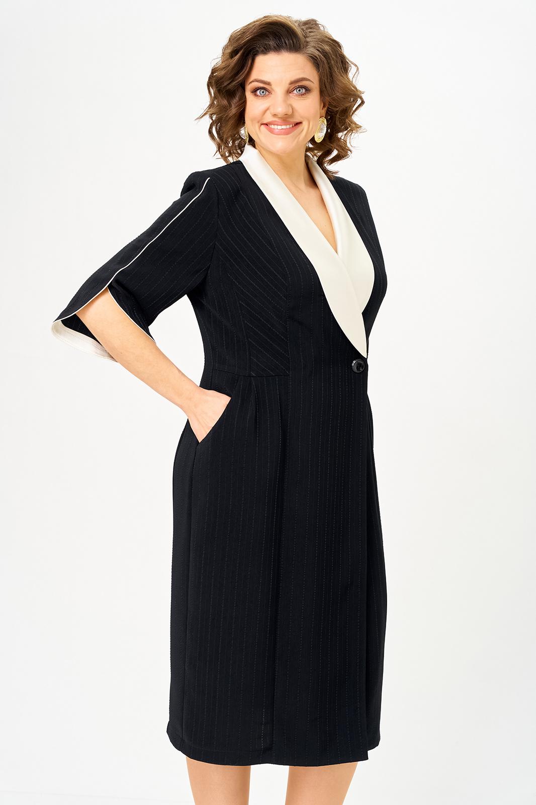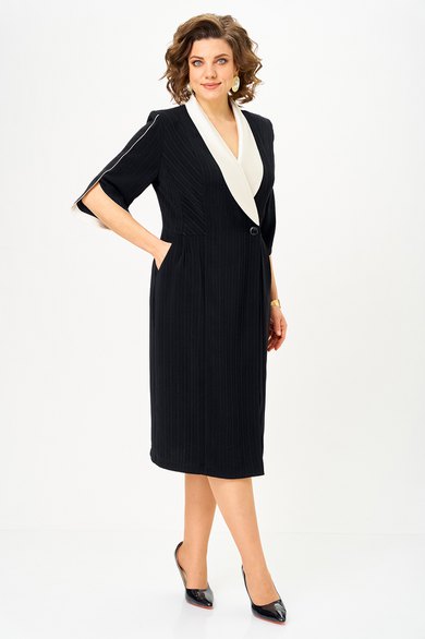 Полочка платья с вертикальными рельефами в верхней части и с отрезной боковой нижней частью, на которой выполнены карманы и складки в шве по талии. Застежка двубортная, на петлю и пуговицу. Горловина V-образной формы, обработана воротником типа “апаш” из отделочной ткани. Спинка со средним швом и вертикальными рельефами. Рукав длинной 3/4, втачной, двухшовный, с отделкой по краю.