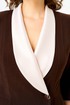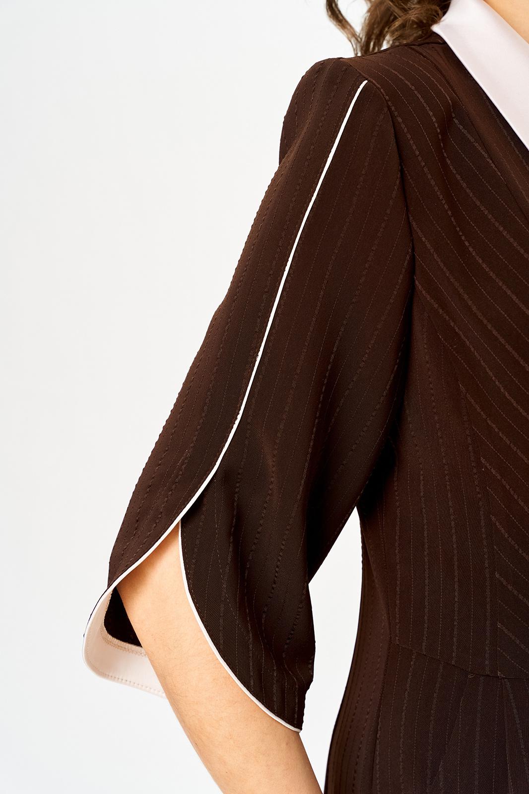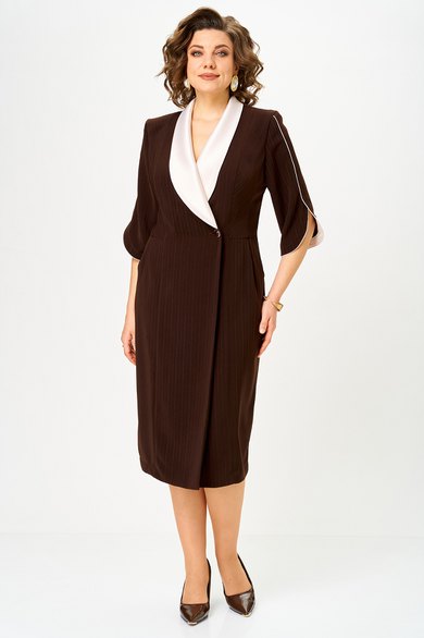 Полочка платья с вертикальными рельефами в верхней части и с отрезной боковой нижней частью, на которой выполнены карманы и складки в шве по талии. Застежка двубортная, на петлю и пуговицу. Горловина V-образной формы, обработана воротником типа “апаш” из отделочной ткани. Спинка со средним швом и вертикальными рельефами. Рукав длинной 3/4, втачной, двухшовный, с отделкой по краю.