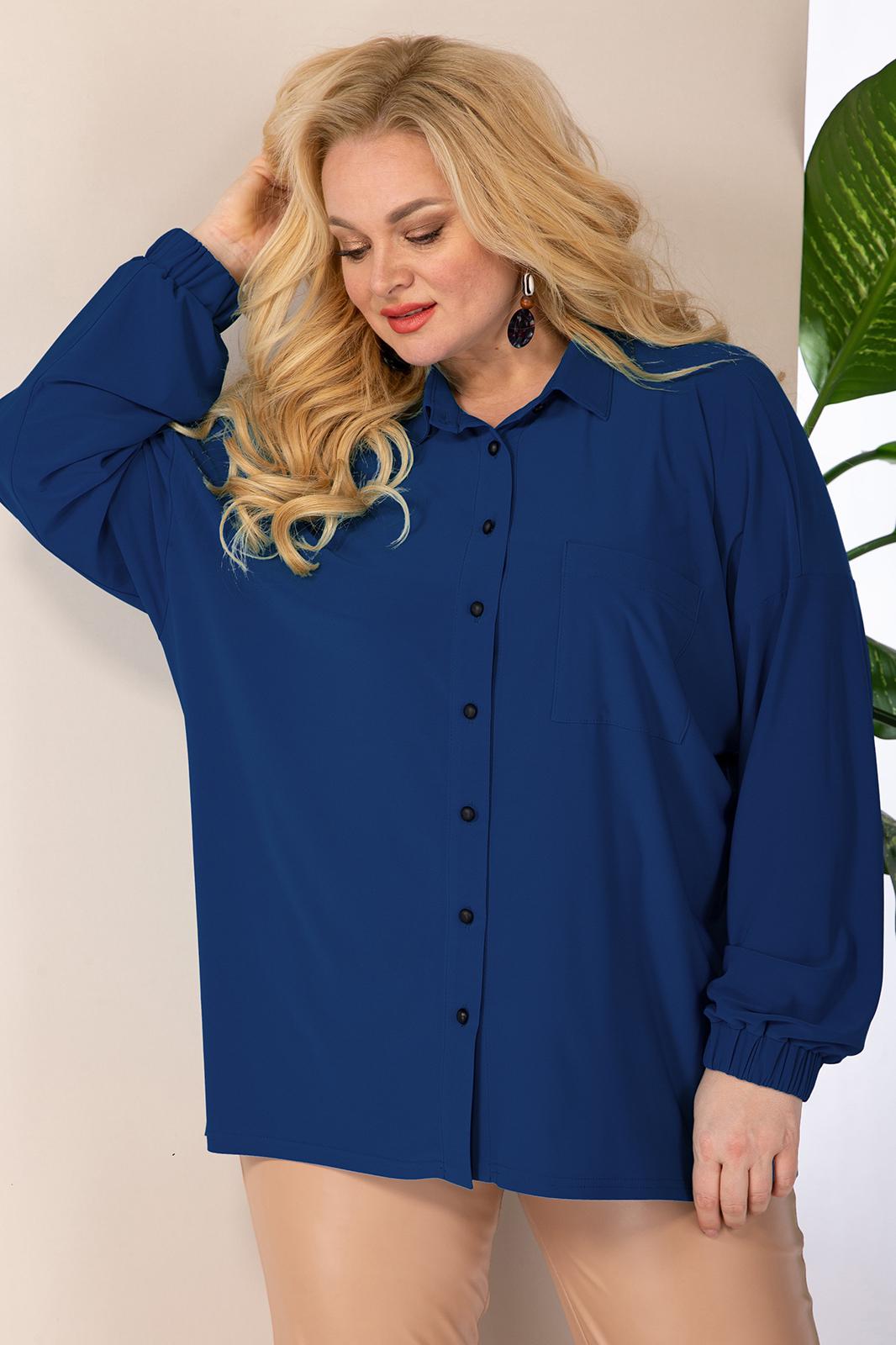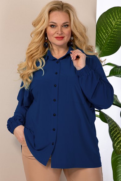 Блузка женская, прямого силуэта, из трикотажного полотна масло,со спущенным плечом. Застежка модели на планку и пуговицы, воротник на стойке, по полочке идет накладной карман, манжет рукава на резинке. Длина (по спинке): (46-50)-72см., (52-56)-74см., (58-62)-75см. Длина рукава (с манжетой): (46-62)-50см.