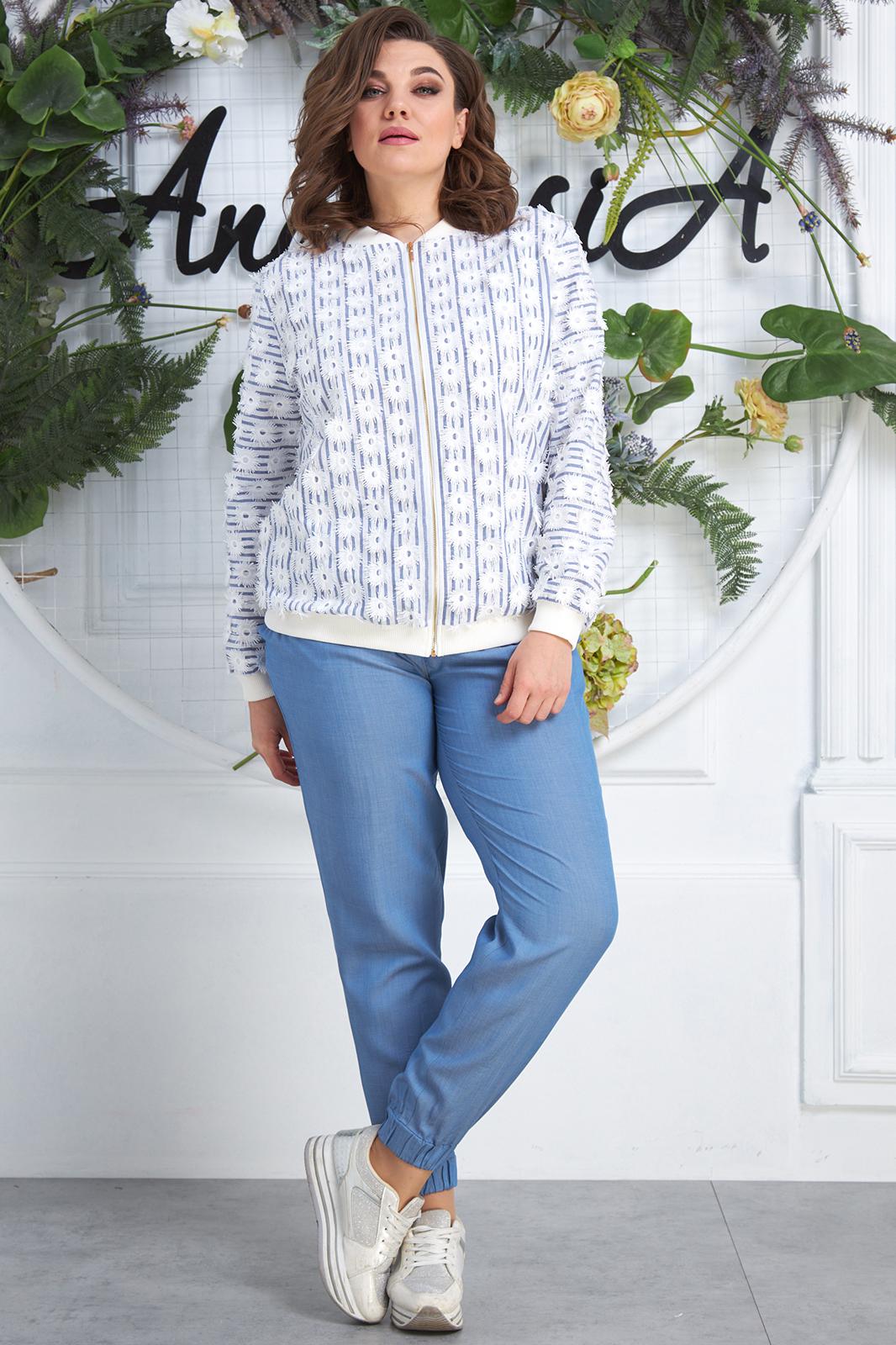 Комплект женский 2-х предметный: бомбер и брюки. Бомбер свободного силуэта из хлопковой ткани в полоску с вышивкой пушистая ромашка. Рукав одношовный, втачной. По горловине и низу бомбера и рукава идет трикотажный довяз, застежка на молнию. По низу брюк идет манжет на резинке. На передних половинках брюк боковые карманы. По боковым швам, по входу в карман, по переднему шву и шву сидения прострочена отделочная строчка на 0,2, пояс на резинке. Длина бомбера (с поясом):(50-54)-65см.,(56-60)-69см. Длина рукава (с манжетой):(50-54)-59см.,(56-60)-61см. Длина брюк( с поясом и манжетой) : (50-54)-98см., (56-60)-101см.