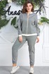 Комплект женский 2-х предметный: бомбер и брюки. Бомбер свободного силуэта из хлопковой ткани. Рукав одношовный, втачной. По горловине и низу бомбера и рукава идет трикотажный довяз, застежка на молнию. По низу брюк идет манжет на резинке. На передних половинках брюк боковые карманы. По боковым швам, по входу в карман, по переднему шву и шву сидения прострочена отделочная строчка на 0,2, пояс на резинке. Длина бомбера (с поясом):(50-54)-65см.,(56-60)-69см. Длина рукава (с манжетой):(50-54)-59см.,(56-60)-61см. Длина брюк( с поясом и манжетой) : (50-54)-98см., (56-60)-101см.