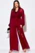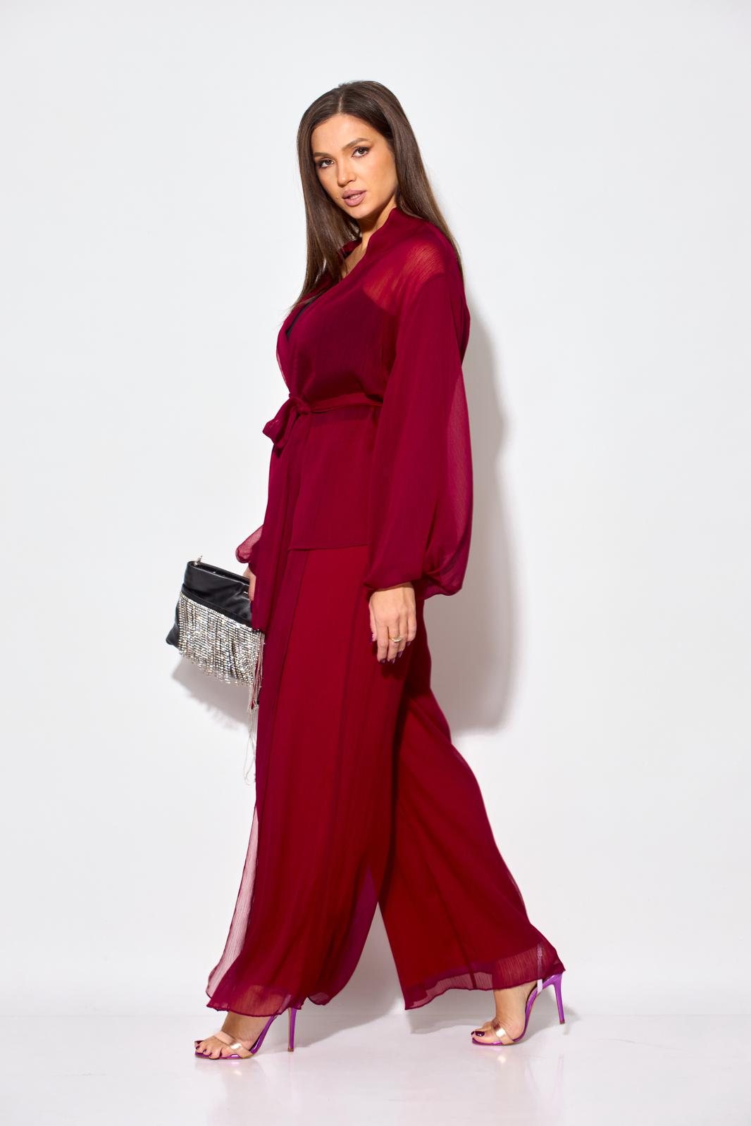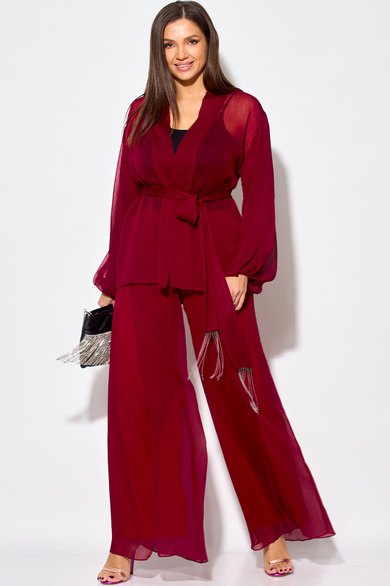 Элегантный вечерний костюм-двойка из шифона, состоящий из блузки свободного кроя и широких брюк на подкладке. Красивый и эффектный брючный костюм - это идеальный образ для особых случаев, вечерних выходов, праздничных и торжественных мероприятий, будь то корпоратив, свадьба, юбилей, выпускной, день рождения, Новый год. Блузка прямого силуэта из шифона со пущенной линией плеча. Рукав двойной, расширенный к низу со складками. По спинке и полочке идет планка. В комплекте с блузкой идет съемный пояс. На концах пояса металлизированная бахрома. Брюки прямые на трикотажной подкладке масло, с запахом по переду, пояс на резинке.Благодаря фасону и крою, костюм визуально вытянет силуэт, сделает фигуру стройнее, подчеркнет ее достоинства, скроет недостатки. Элегантный брючный костюм от Anastasia- комфорт и уверенность в себе! Длина блузки: (48-56)-61см. Длина рукава-52см. Длина брюк:(48-54)-105см., (56)-108см.