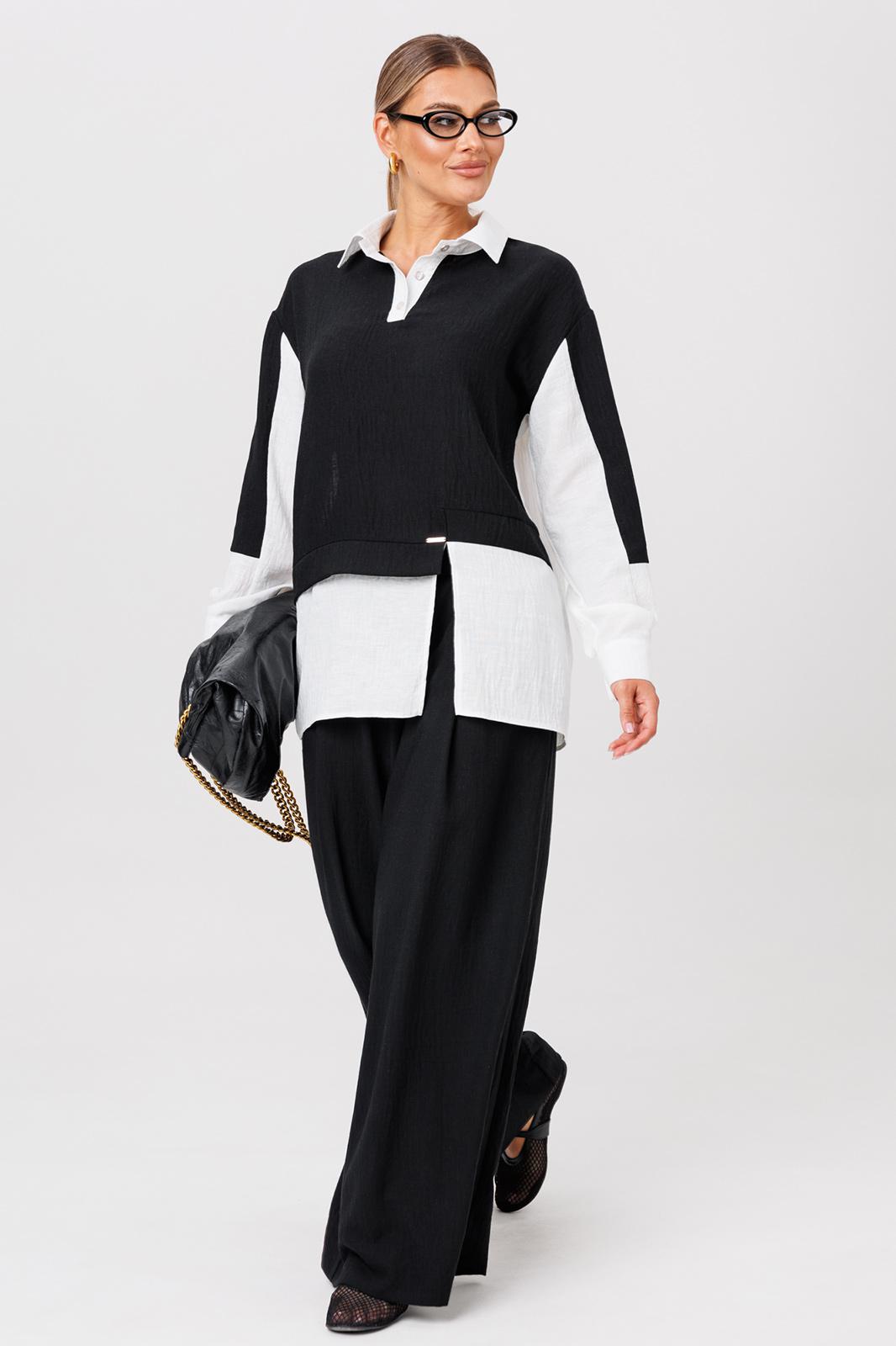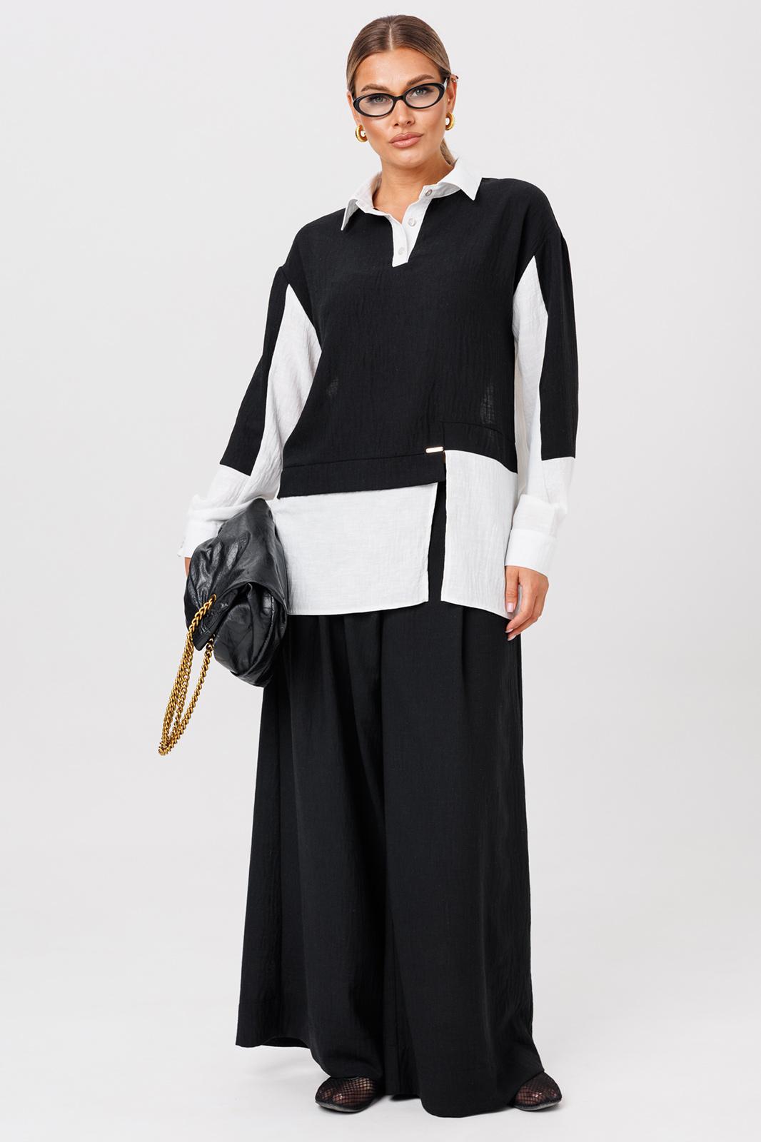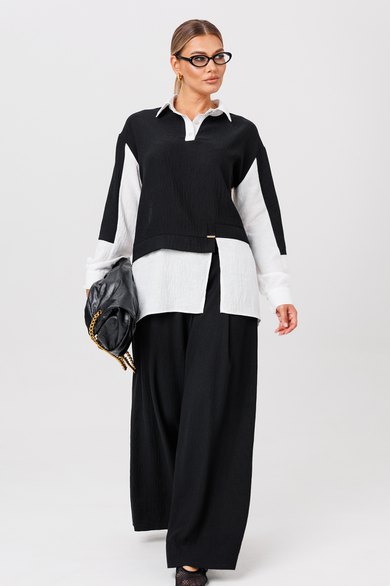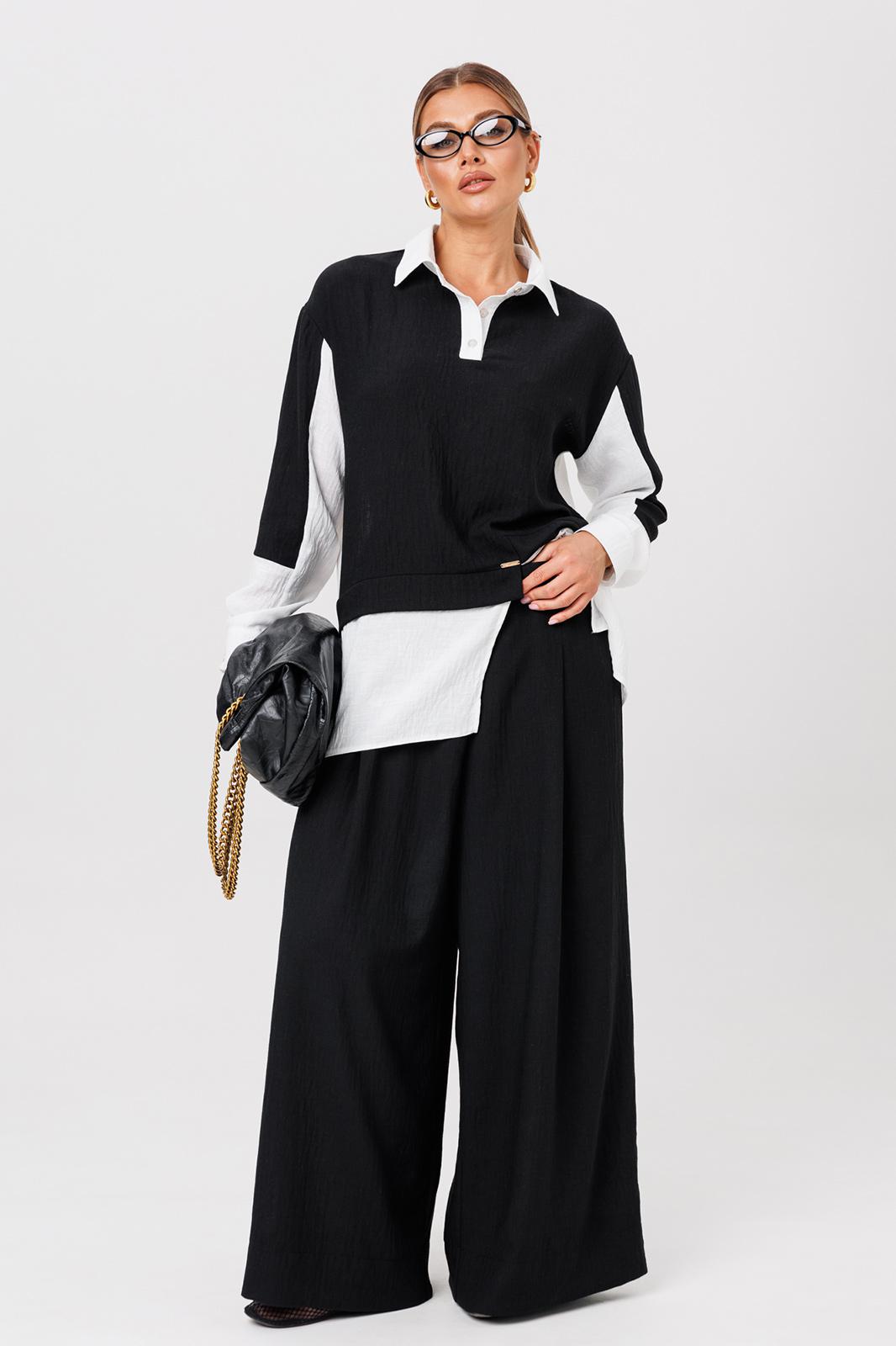 Комплект из костюмной ткани создан для тех, кто ценит комфорт и элегантность в каждой детали. В комплект входит блузка и штаны палаццо. Оверсайз крой придаёт костюму особый шарм и дает свободу движений. Высокая посадка и резинка по поясу подчёркивает талию и делает силуэт более изящным. Благодаря свободному крою костюм подойдёт для разных типов фигуры. Он подчеркнёт вашу индивидупльность. Блузка прямого силуэта, застежка на планку и пуговицы. Воротник на отрезной стойке. По полочке идет ассиметричный подрез со вставками из 2-х видов однотона и разрезом. Плечо спущенное, рукав длинный со вставками, на манжете. По спинке идет кокетка и встречная складка. Брюки полаццо , прямые с односторонней складкой и запахом по центру. По низу брюк широкая подгибка. Пояс на резинке . В качестве декора- брендированная металлическая нашивка по подрезу полочки. Длина по спинке (50-54) - 74 см, (56-60) - 76 см. Длина рукава (с манжетой): (50-54) - 57 см, (56-60)-59см. Длина брюк: (50-54) - 98 см, (56-60) - 99 см