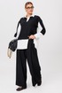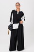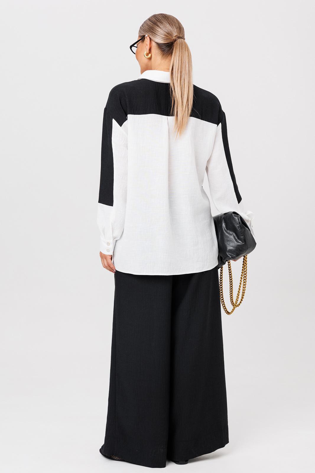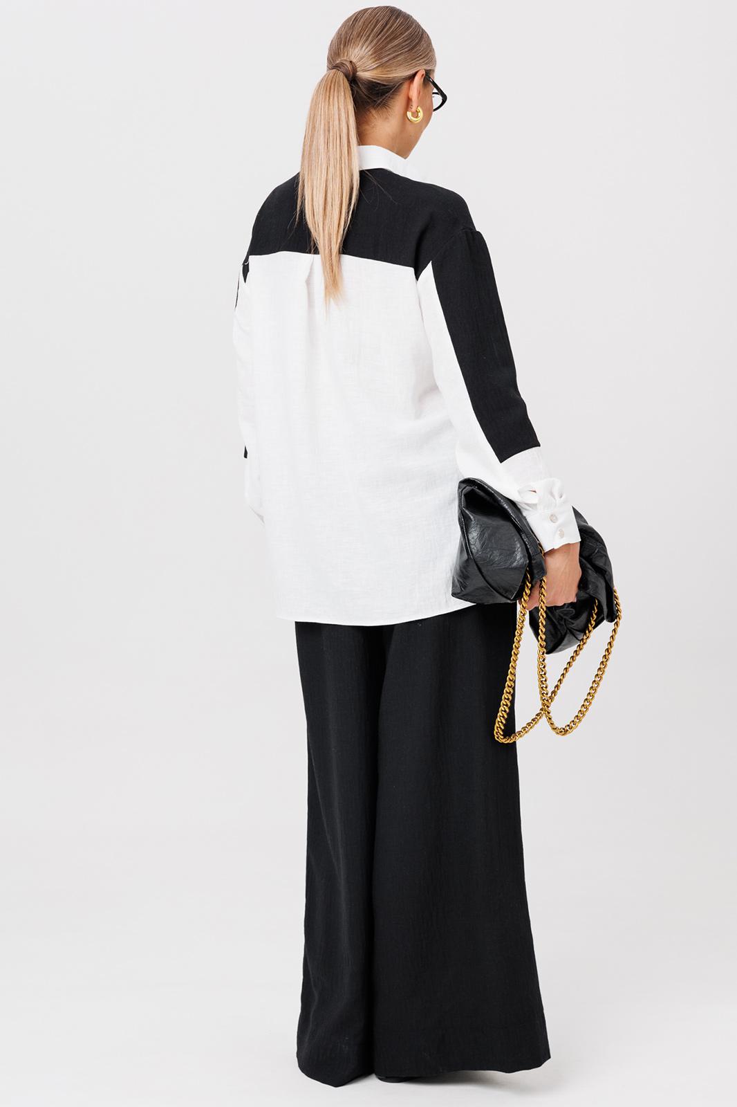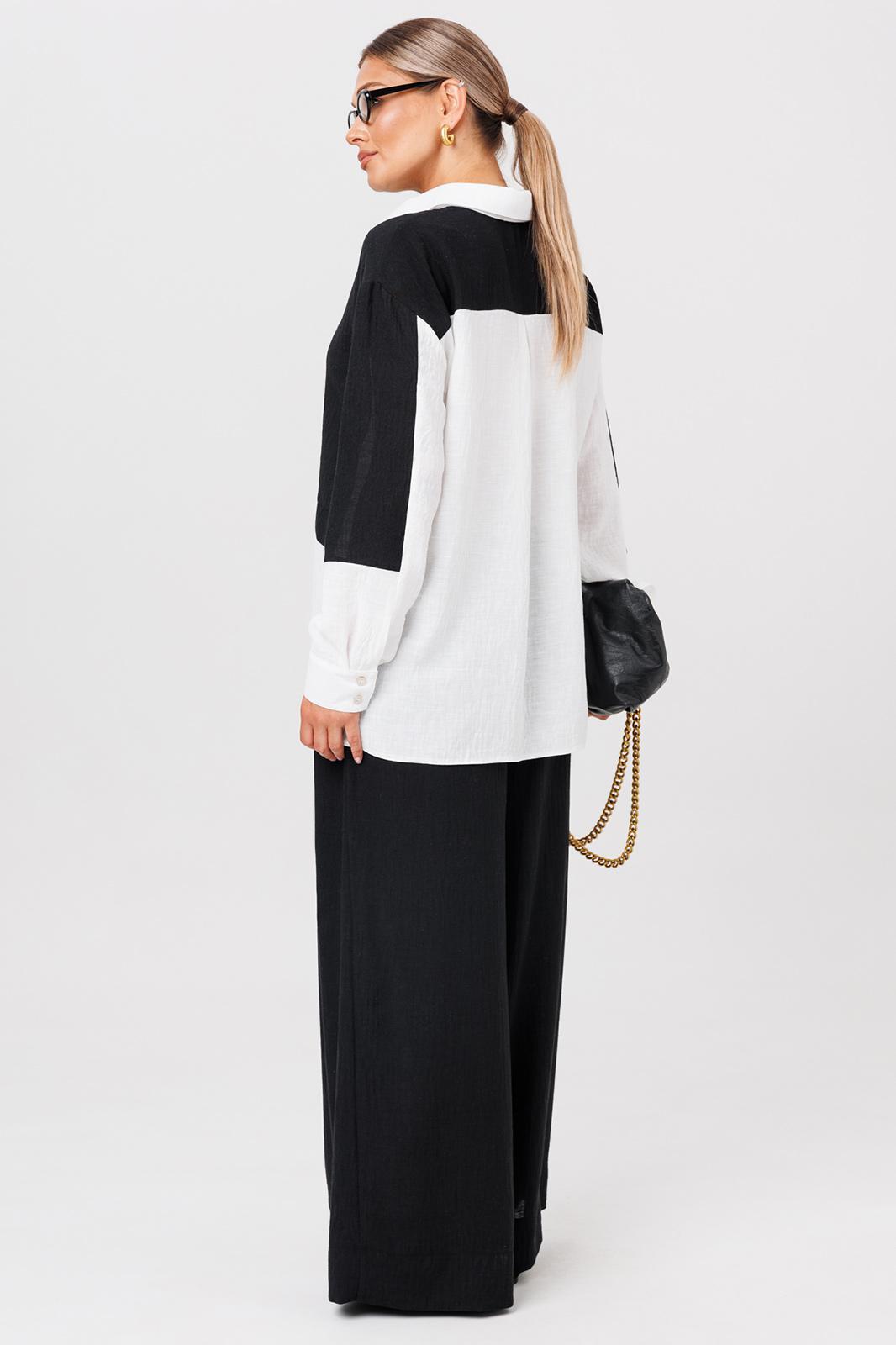 Комплект из костюмной ткани создан для тех, кто ценит комфорт и элегантность в каждой детали. В комплект входит блузка и штаны палаццо. Оверсайз крой придаёт костюму особый шарм и дает свободу движений. Высокая посадка и резинка по поясу подчёркивает талию и делает силуэт более изящным. Благодаря свободному крою костюм подойдёт для разных типов фигуры. Он подчеркнёт вашу индивидупльность. Блузка прямого силуэта, застежка на планку и пуговицы. Воротник на отрезной стойке. По полочке идет ассиметричный подрез со вставками из 2-х видов однотона и разрезом. Плечо спущенное, рукав длинный со вставками, на манжете. По спинке идет кокетка и встречная складка. Брюки полаццо , прямые с односторонней складкой и запахом по центру. По низу брюк широкая подгибка. Пояс на резинке . В качестве декора- брендированная металлическая нашивка по подрезу полочки. Длина по спинке (50-54) - 74 см, (56-60) - 76 см. Длина рукава (с манжетой): (50-54) - 57 см, (56-60)-59см. Длина брюк: (50-54) - 98 см, (56-60) - 99 см