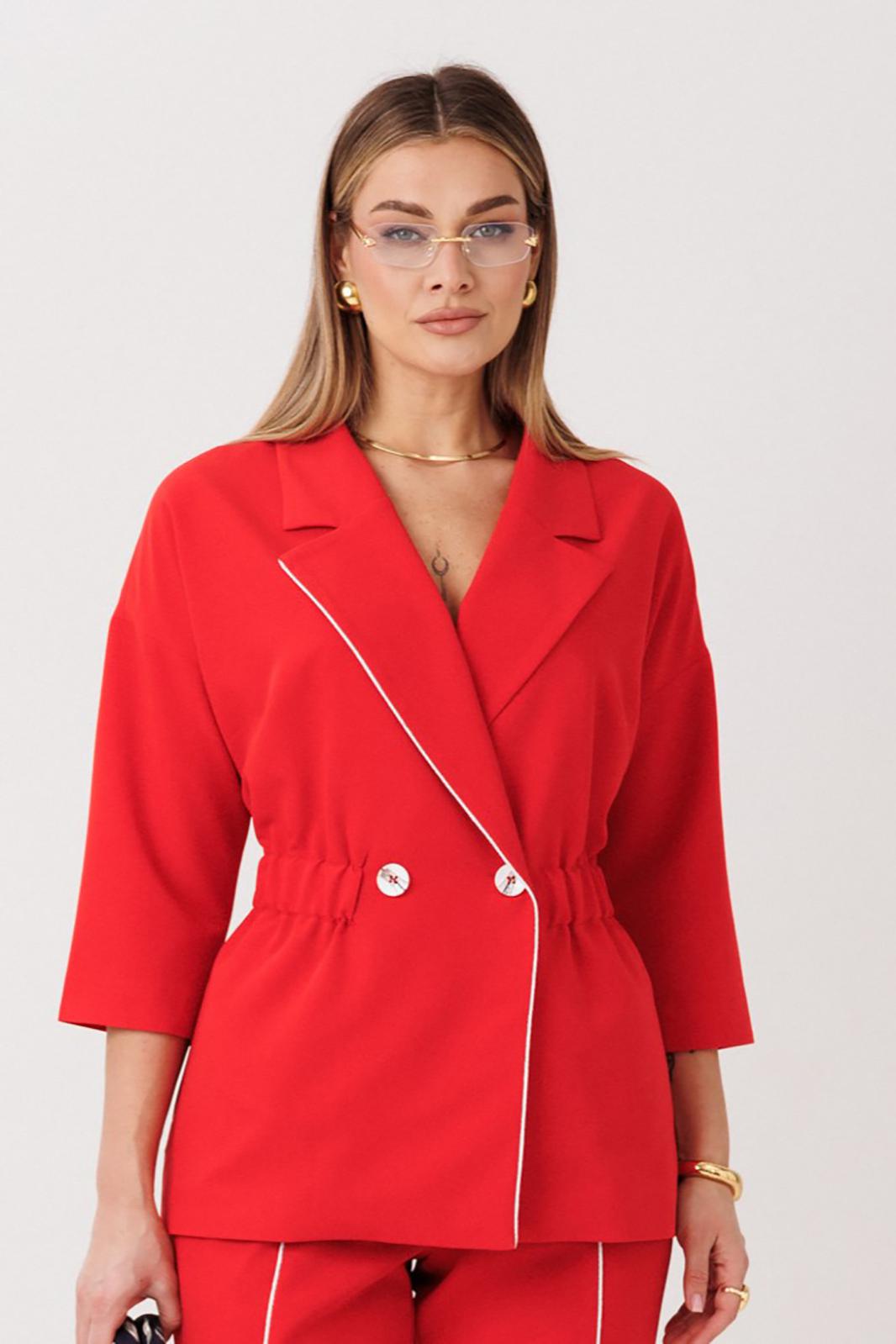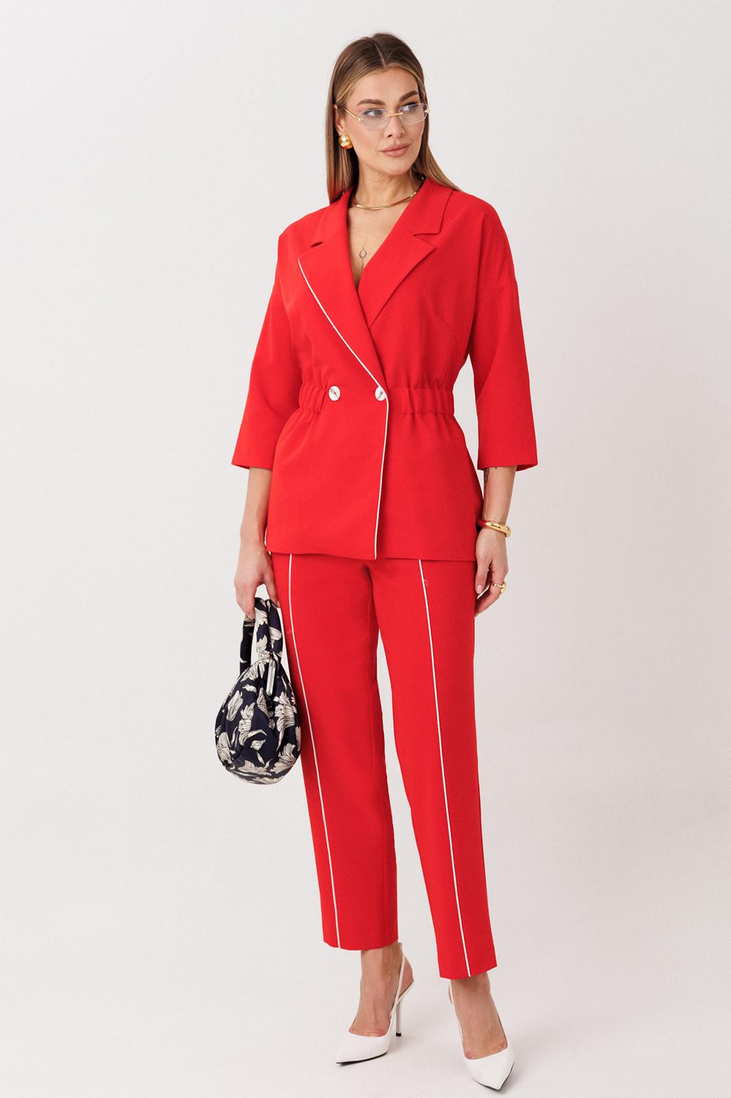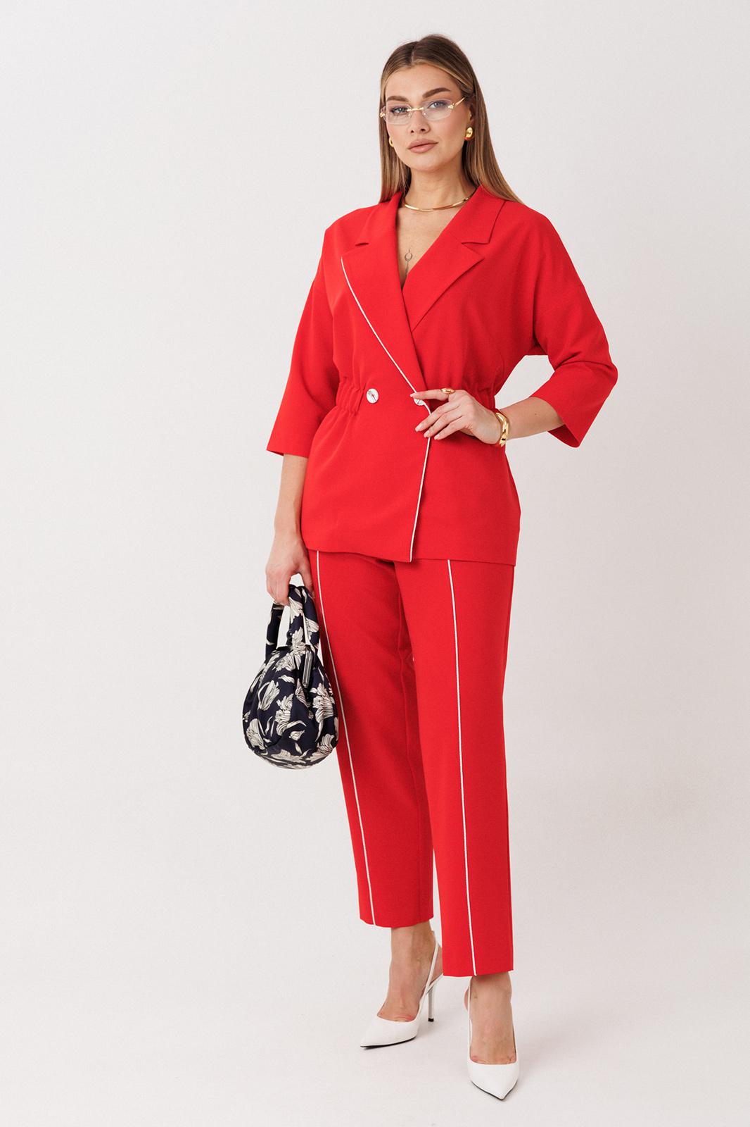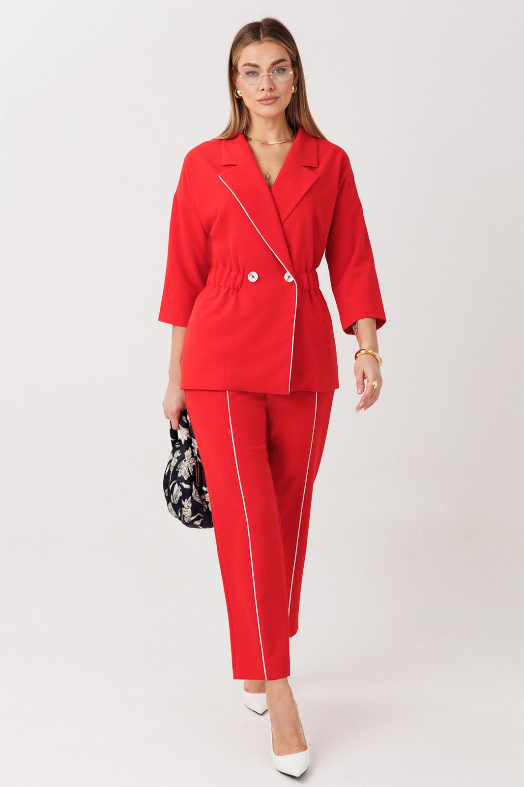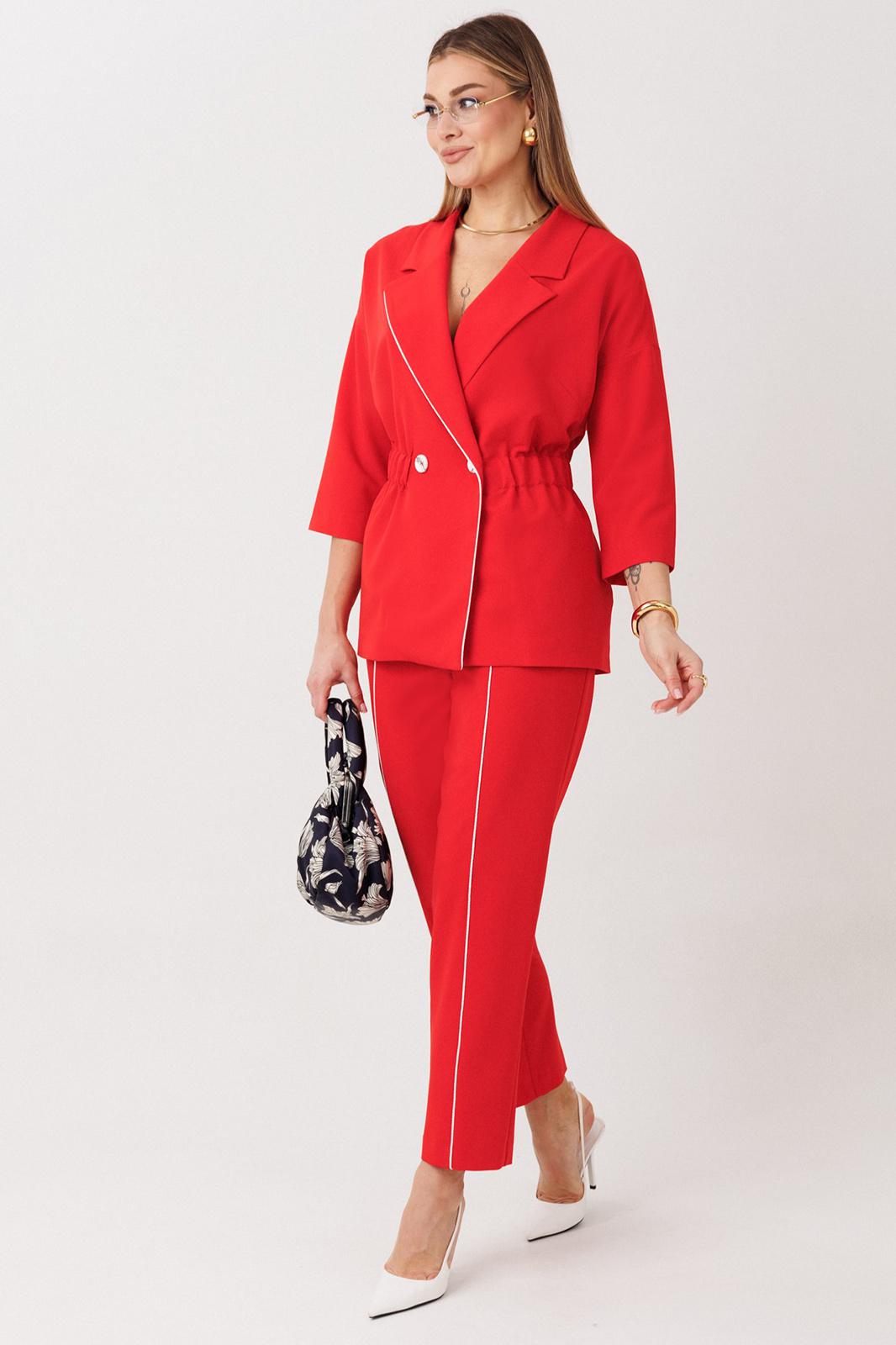 Стильный женский костюм от бренда Anastasia, идеальный для любого случая. Этот костюм сочетает в себе элегантность и комфорт, что делает его подходящим как для деловых встреч или прогулок. Комплект состоит из жакета и брюк. Костюм женский 2-хпредметный (жакет и брюки). Жакет на подкладке из текстильной ткани полуприлегающего силуэта со спущенным плечом. Приталивание по талии создается за счет кулиски с резинкой. По полочке идут грудовые выточки из бокового шва. Застежка двубортная. Воротник английского типа. По правому борту идет отделка- кант. По бокам карманы. По спинке средний шов. Рукав 3/4. Брюки, зауженные к низу. Пояс на резинке. По передней части – вставка кант. Стильный костюм отлично подойдет для долгих прогулок или для работы, для офиса. Отдельный части костюма легко будут сочетаться с вещами из Вашего гардероба. Модель можно отнести к стилю кэжуал. Костюм можно носить с туфлями, кроссовками или ботинками. Длина (по спинке):(50-52)- 69см, (54-58)-70 см, (60-64)-71см. Длина рукава: (50-64)- 32см. Длина брюк: (50-54):- 91см, (56-60)- 64см, (62-64)-96см