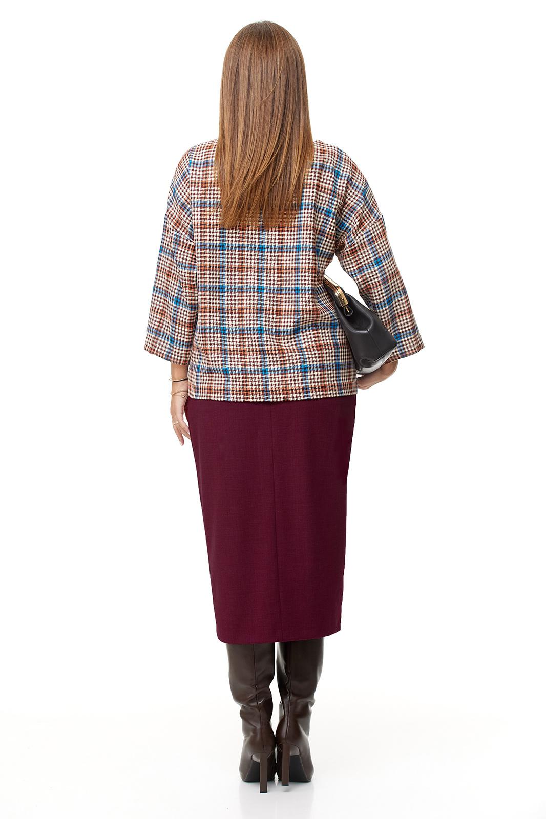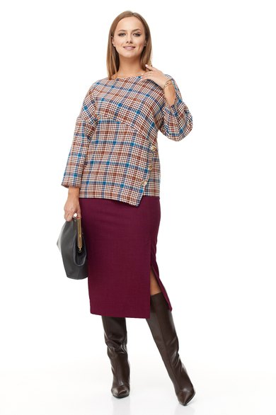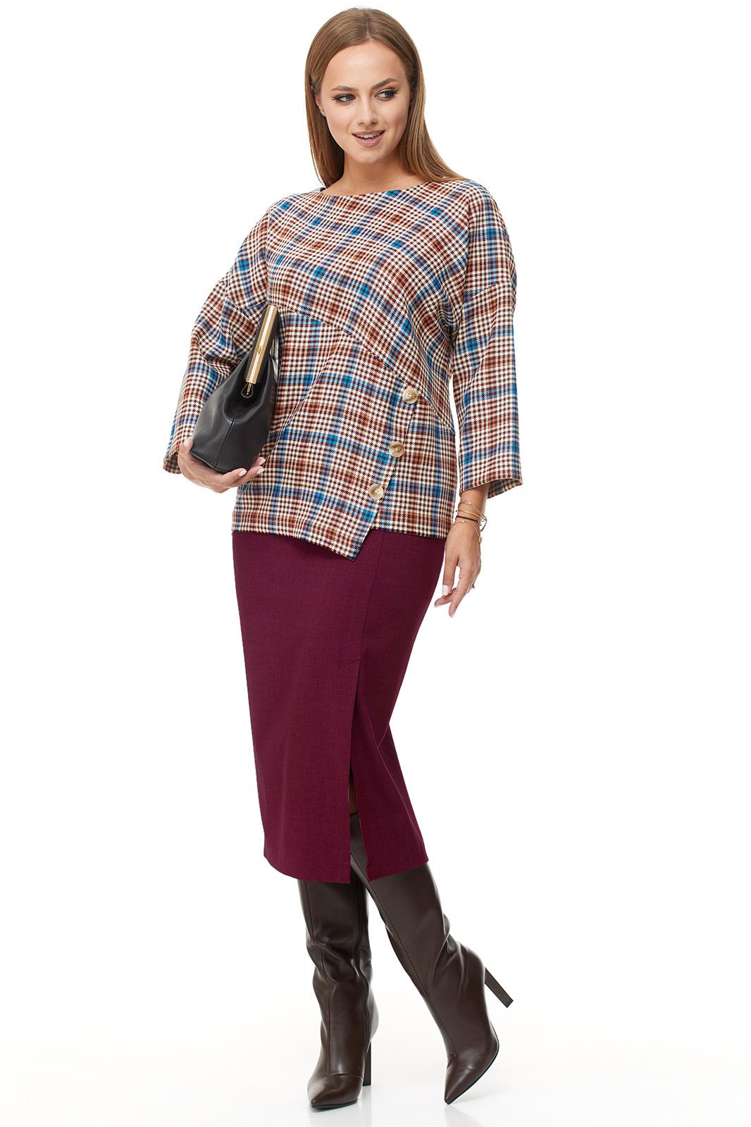 Комплект женский 2-хпредметный (блузка и юбка)из текстильной ткани. Блуза прямого силуэта со спущенным плечом, низ по полочке фигурный, асимметричный. По полочке идет кокетка в виде подреза, оттелка в виде пуговиц. Рукав 3/4 длины. Юбка-карандаш, зауженная к низу. По линии колена идет шлица, застежка молния по спинке. Длина блузы (по спинке): (50-54):-59см., (56-58)-62см. Длина рукава: (50-58)-33см. Длина юбки: 76 см.