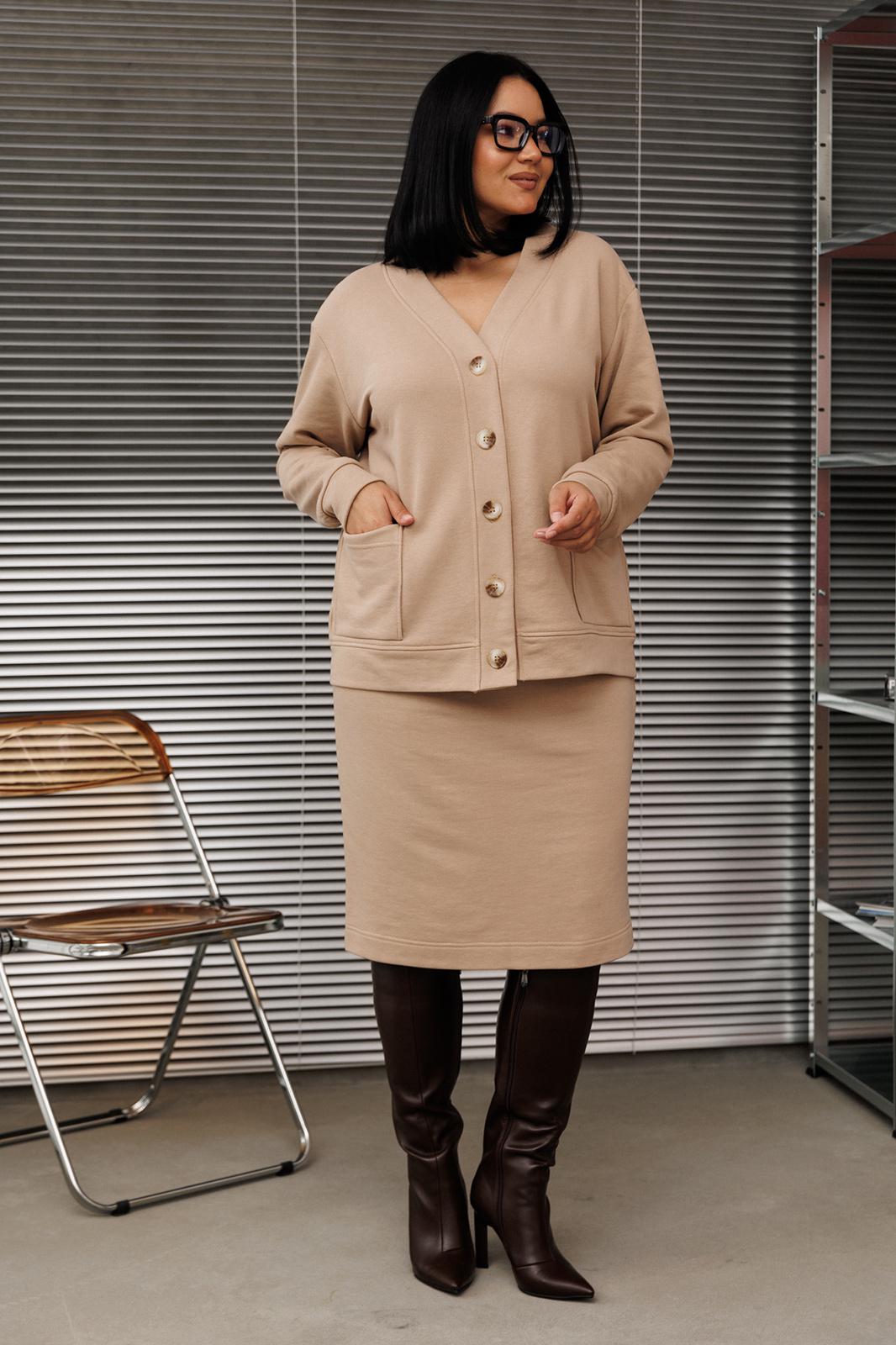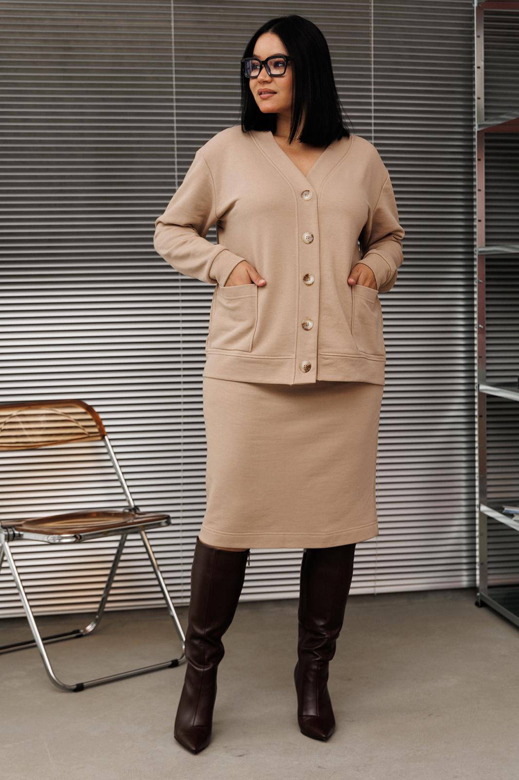 Шикарный трикотажный женский костюм от бренда Anastasia, идеальный для любого случая. Этот костюм сочетает в себе элегантность и комфорт, что делает его подходящим как для деловых встреч или прогулок. Комплект состоит из кардигана и юбки. Кардиган прямого силуэта со спущенным плечом. По низу спинки и полочки идет отрезной пояс. Застежка- планка с пуговицами. По полочке идут накладные карманы. По низу рукава- манжет. Юбка зауженная к низу по спинке идет разрез, пояс отрезной на резинке. Стильный костюм отлично подойдет для долгих прогулок или для работы, для офиса. Юбка -миди создает чувственный образ благодаря своей длине, придающей женственность и элегантность вашему образу. Отдельный части костюма легко будут сочетаться с вещами из Вашего гардероба. Модель можно отнести к стилю спортивный кэжуал, оверсайз, спортивный шик. Костюм можно носить с кроссовками, высокими сапогами или ботинками. Обязательно добавьте наш бренд в избранное и следите за новинками, распродажами, скидками и акциями! Хороших покупок от «Анастасия». Длина (по спинке):(50-54)- 56см, (56-60)-59 см. Длина рукава с манжетой: (50-54)-56см, (56-60)-58 см. Длина юбки: (50-54):-59см, (56-60)-62см.