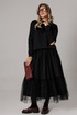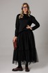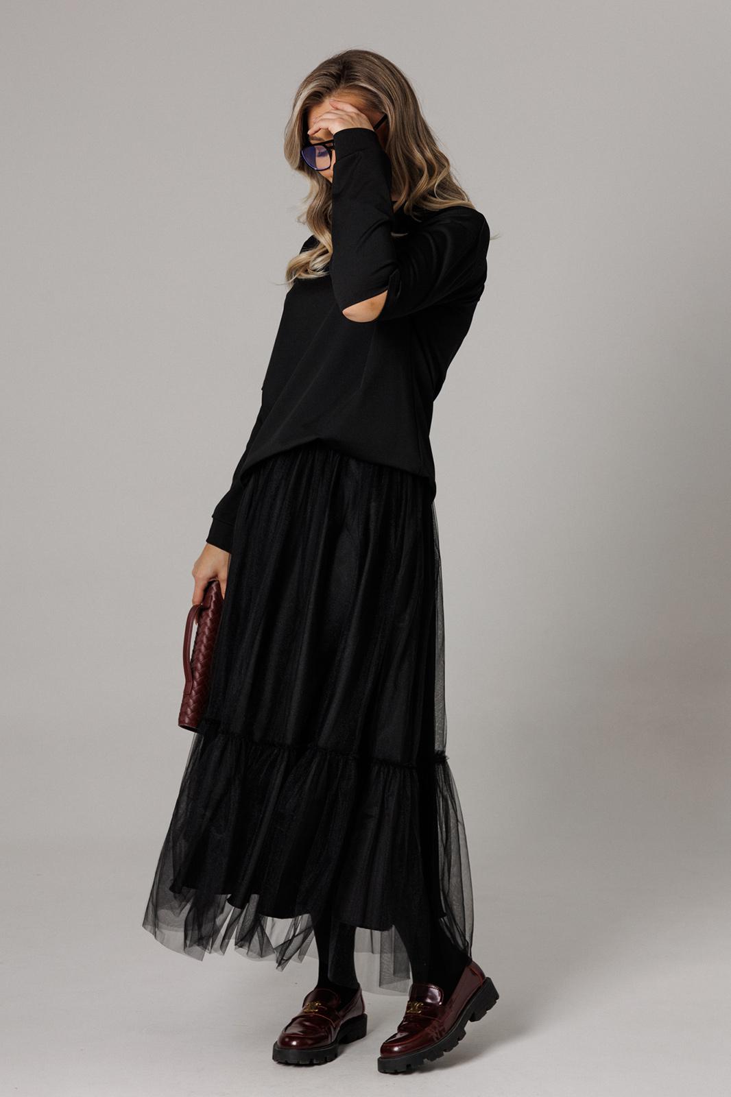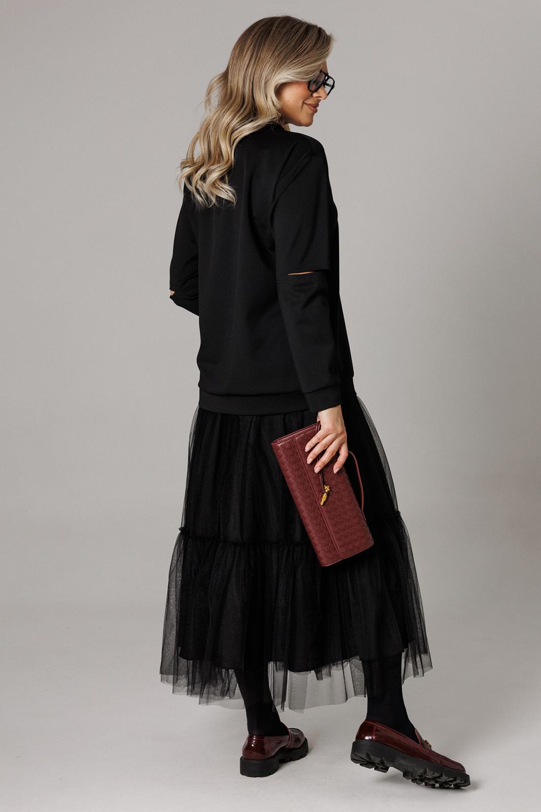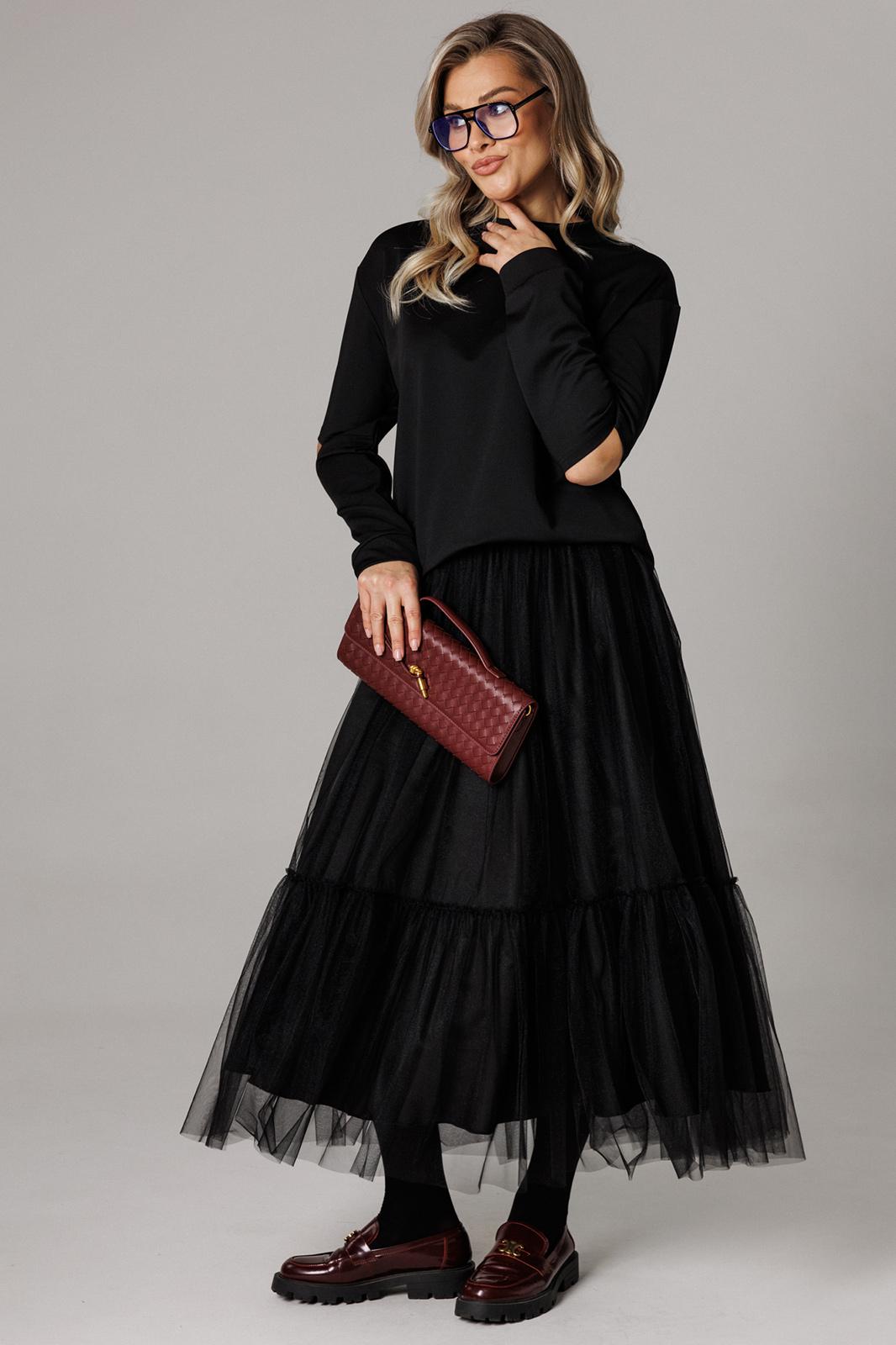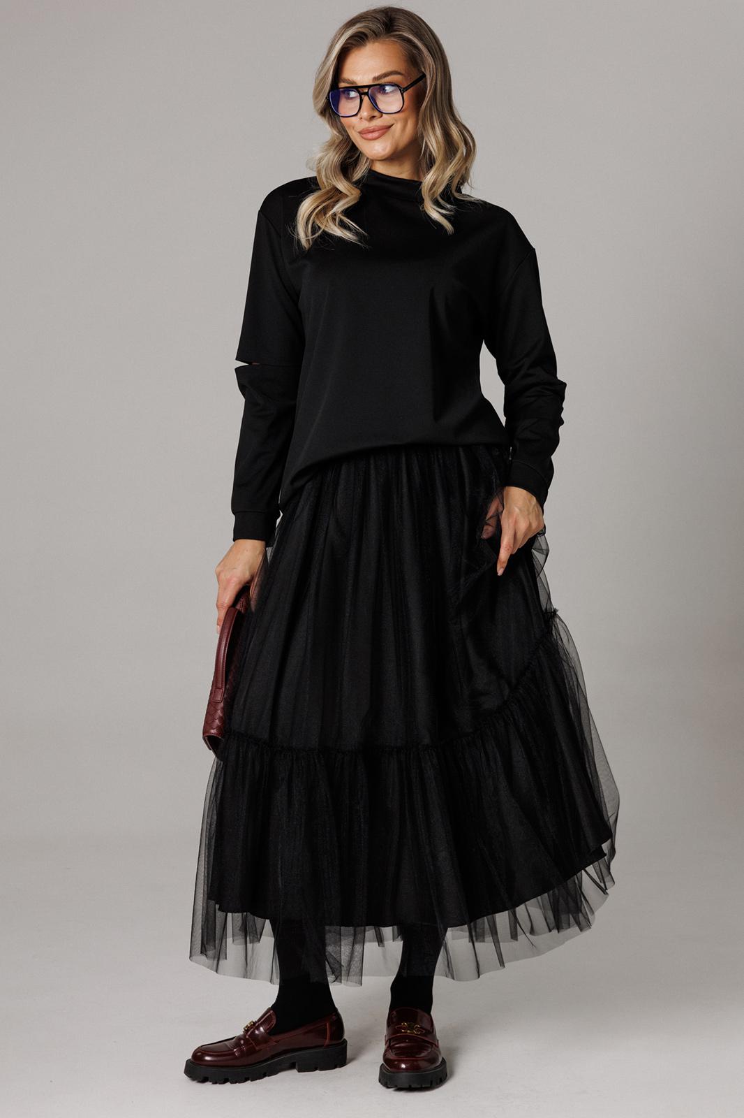 Оригинальный женский комплект от бренда Anastasia, идеальный для любого случая. Этот костюм сочетает в себе элегантность и комфорт, что делает его подходящим как для повседневной носки, так и для праздничных мероприятий. Джемпер оверсайз из трикотажного полотна. Прямого силуэта со спущенным плечом. Воротник-стойка. По рукаву идет подрез с разрезом. Низ рукава и низ джемпера - на манжете. Джемпер лекго сочетается с любыми низами: брюки, джинсы, юбка. Юбка макси из 2-х видов ткани: верх с отрезным валаном из фатина, подкладка юбка солнце из шифона. Пояс на декоративной резинке. Фасон универсален, а использование резинки на поясе повышает комфортность носки, позволяя юбке адаптироваться под индивидуальные особенности фигуры. Юбку легко сочетать с различными верхами: топ, блузка, футболка, кружевной жакет, свитер или жакет из тексиля - все это позволит создавать различные образы на разные случаи. Длина по спинке 68 см. Длина рукава (с манжетой): 60 см. Длина юбки: 90 см