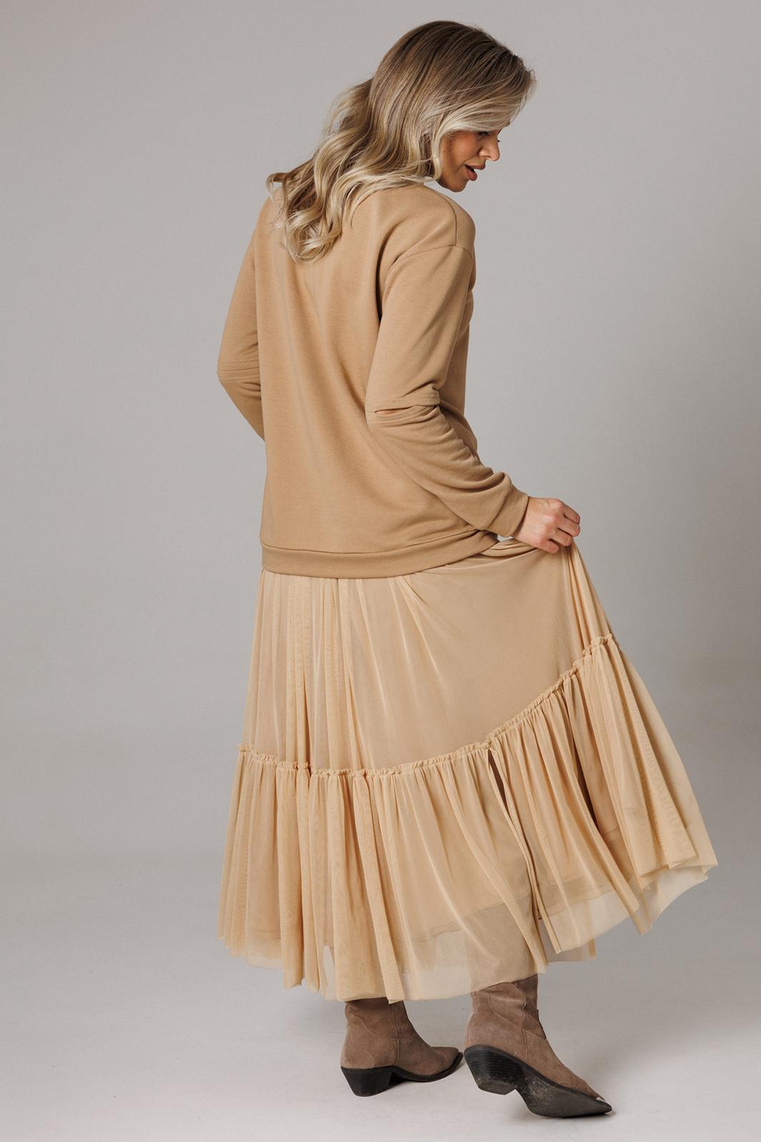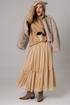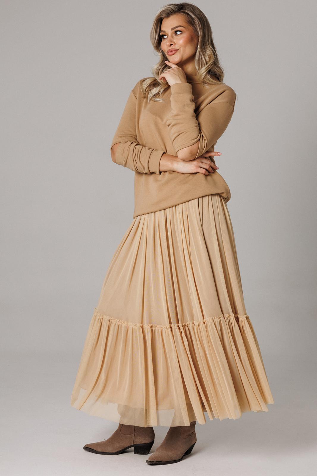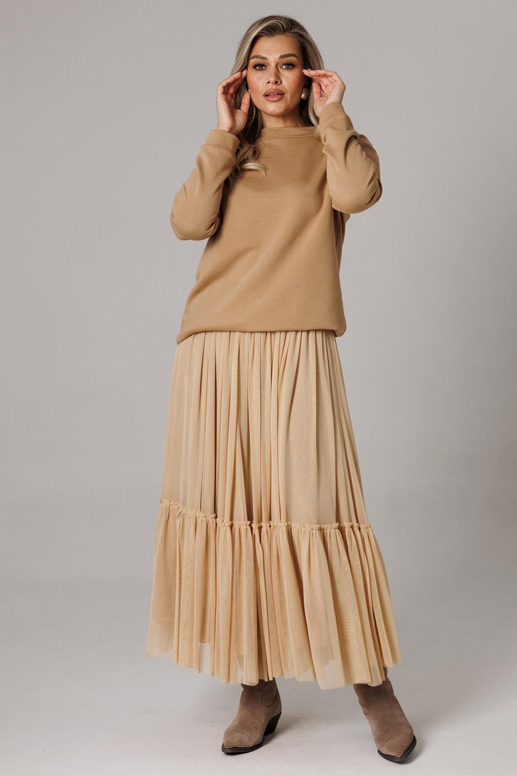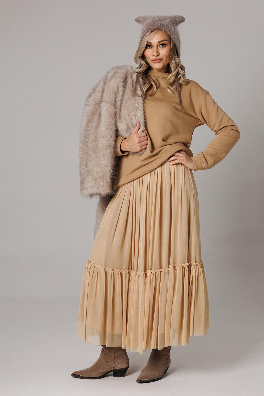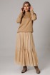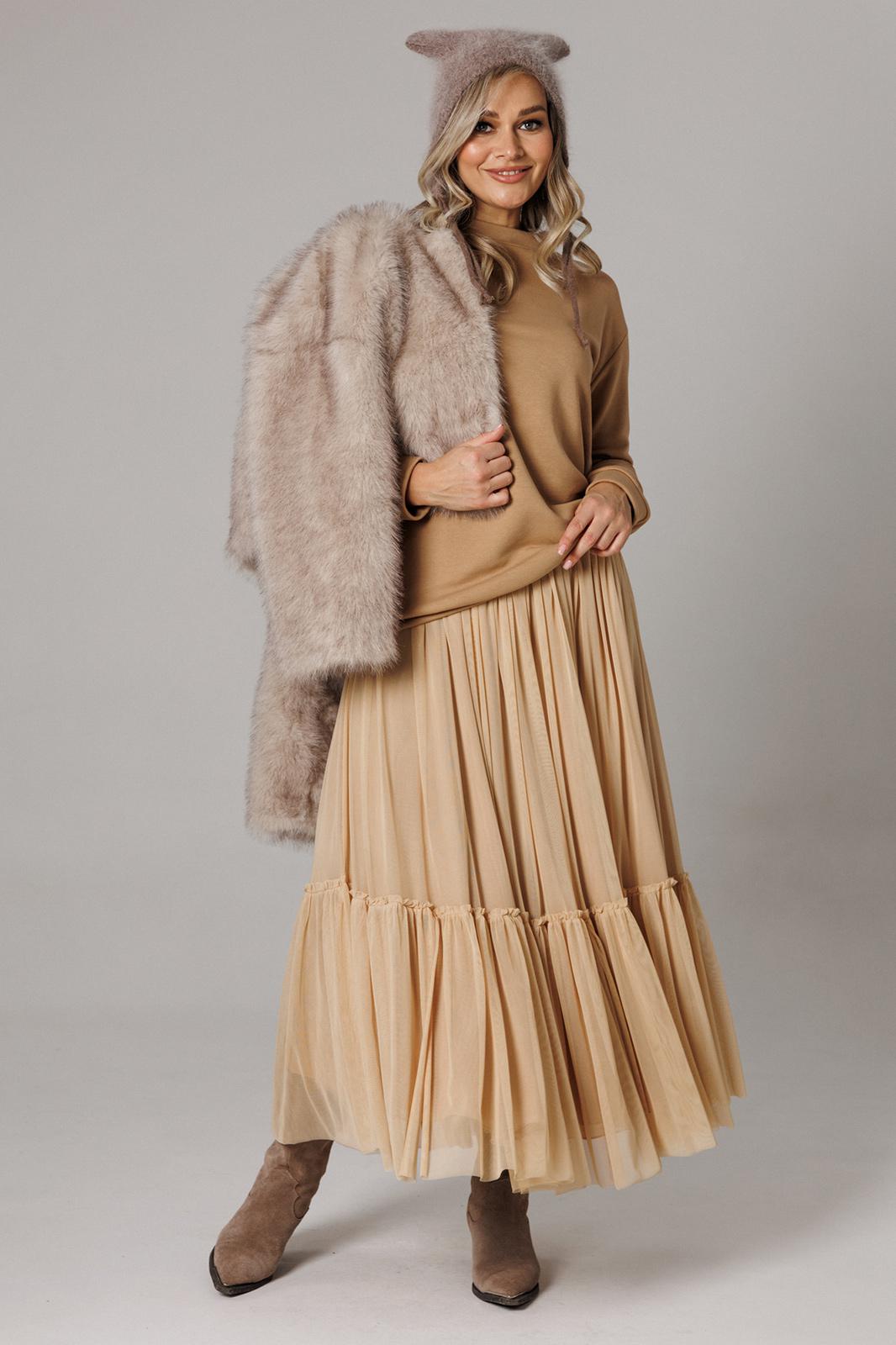 Оригинальный женский комплект от бренда Anastasia, идеальный для любого случая. Этот костюм сочетает в себе элегантность и комфорт, что делает его подходящим как для повседневной носки, так и для праздничных мероприятий. Джемпер оверсайз из трикотажного полотна. Прямого силуэта со спущенным плечом. Воротник-стойка. По рукаву идет подрез с разрезом. Низ рукава и низ джемпера - на манжете. Джемпер лекго сочетается с любыми низами: брюки, джинсы, юбка. Юбка макси из 2-х видов ткани: верх с отрезным валаном из стрейчевой сетки, подкладка юбка солце из шифона. Пояс на декоративной резинке. Фасон универсален, а использование резинки на поясе повышает комфортность носки, позволяя юбке адаптироваться под индивидуальные особенности фигуры. Юбку легко сочетать с различными верхами: топ, блузка, футболка, кружевной жакет, свитер или жакет из тексиля - все это позволит создавать различные образы на разные случаи. Длина по спинке 68см. Длина рукава (с манжетой): 60см. Длина юбки: 90 см