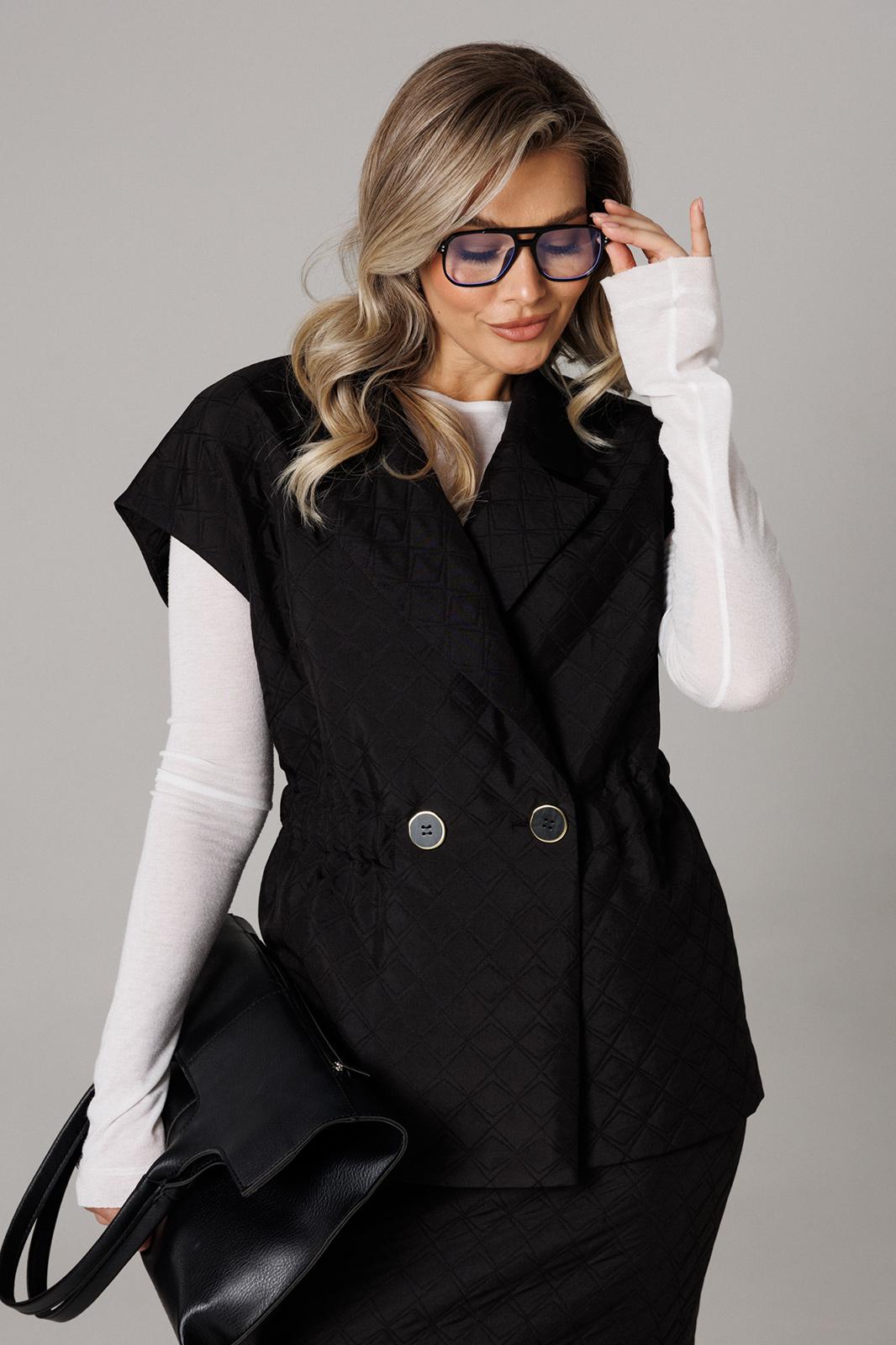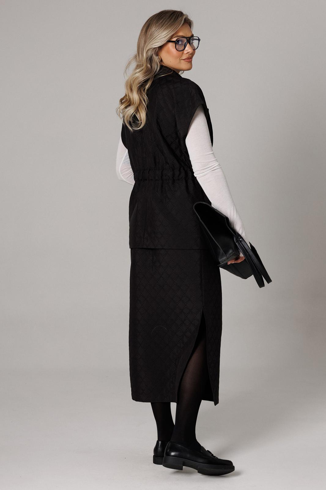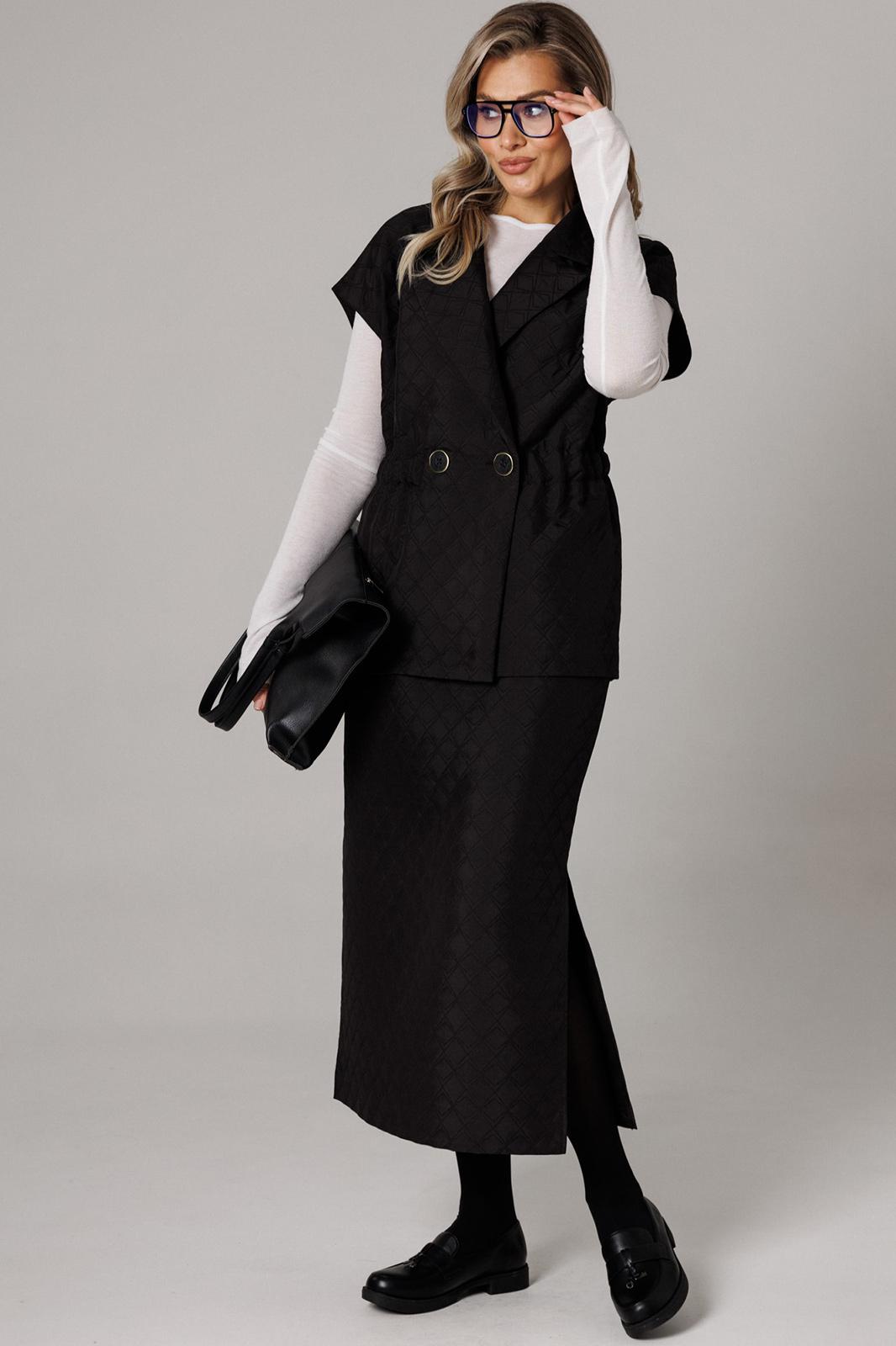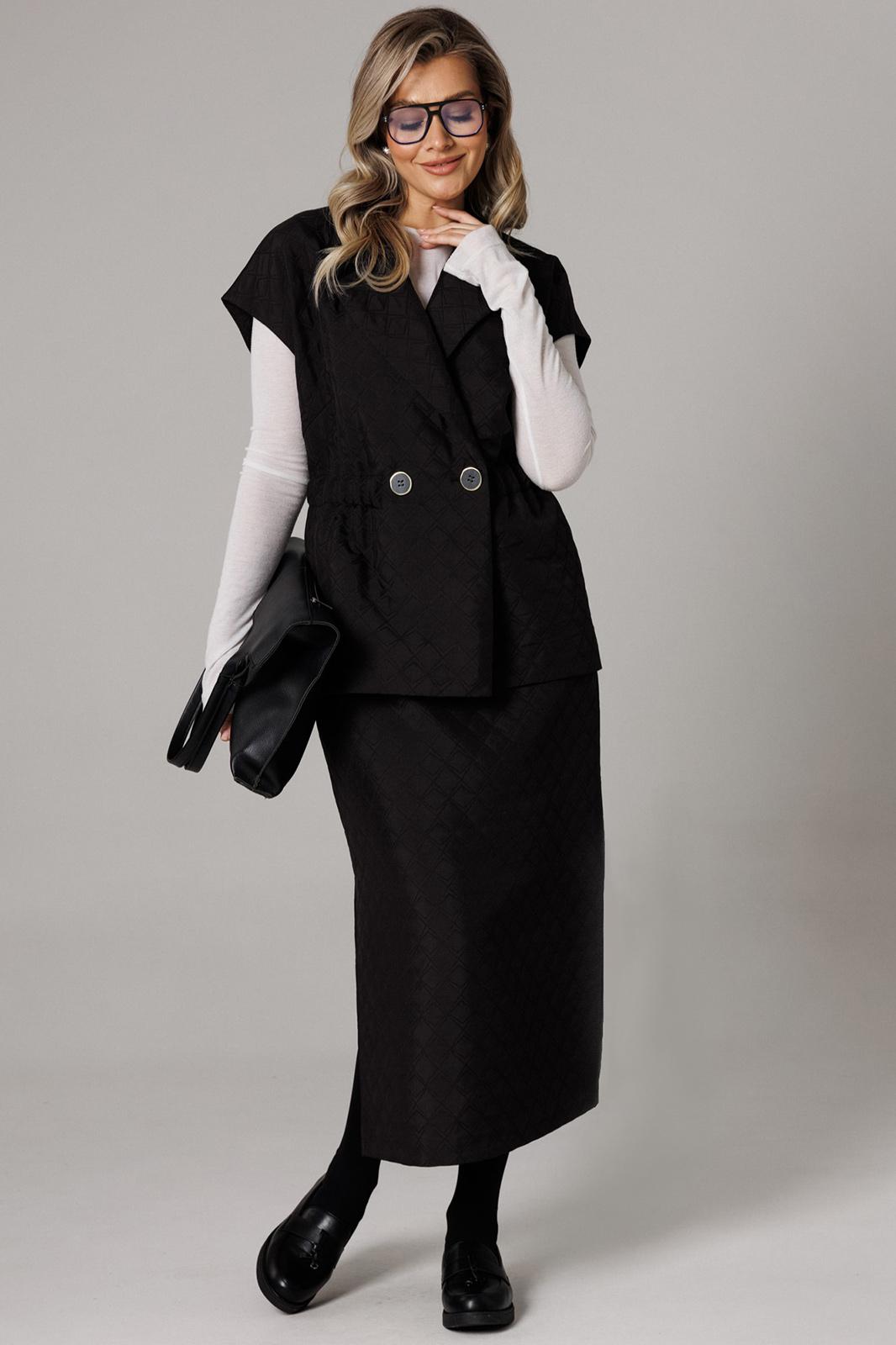 Бренд белорусской женской одежды больших размеров Anastasia представляет костюм двойку. Костюм женский 2-х предметный (жилет, юбка) из стеганной ткани станет отличным дополнением к Вашему гардеробу. Подойдет для повседневной носки (работа, офис, прогулки). Достаточно дополнить его соответствующими предметами из вашего гардероба: блузка, майка, водолазка, гольф, свитер, лонгслив, свитшот. Жилет прямого силуэта, со спущенным плечом. Может быть самостоятельным элементом гордерба. Застежка двухбортная, воротник английского типа. По полочке идет грудовая выточка из бокового шва, по спинке средний шов, по талии кулиска-резинка, по бокам -карманы. Юбка-макси, зауженная к низу, по бокам разрезы. Пояс отрезной на резинке. Благодаря своему крою и фасону костюм подчеркивает женственные формы и скрывает то, что должно быть незаметным. Это повседневный вариант на каждый день для занятий в школе или для офиса, на работу или на прогулку. Наденьте его на деловую встречу, официальное мероприятие, школьное торжество. Модель подойдёт для образа в университет или колледж. Этот предмет одежды подчеркнет вашу элегантность и сделает образ более женственным. Длина по спинке (48-52)-70см, (54-58)-71 см. Длина юбки (48-58) - 88см.