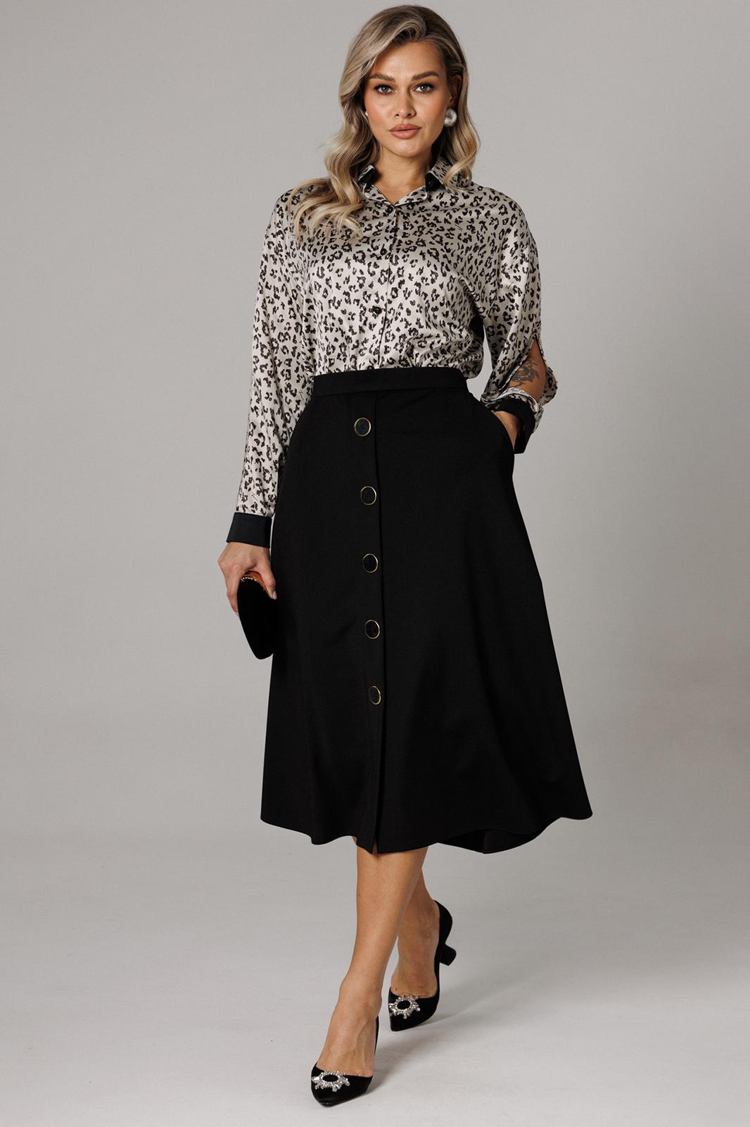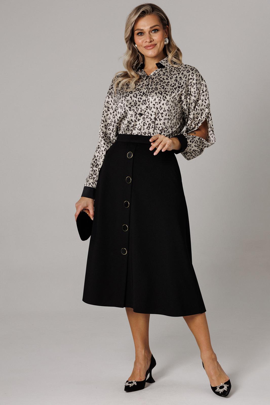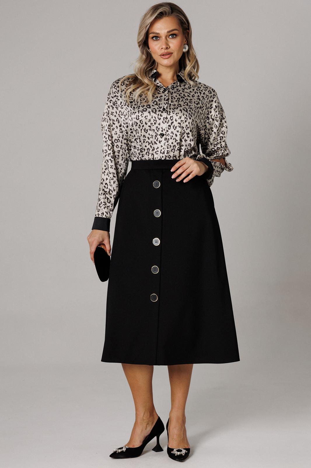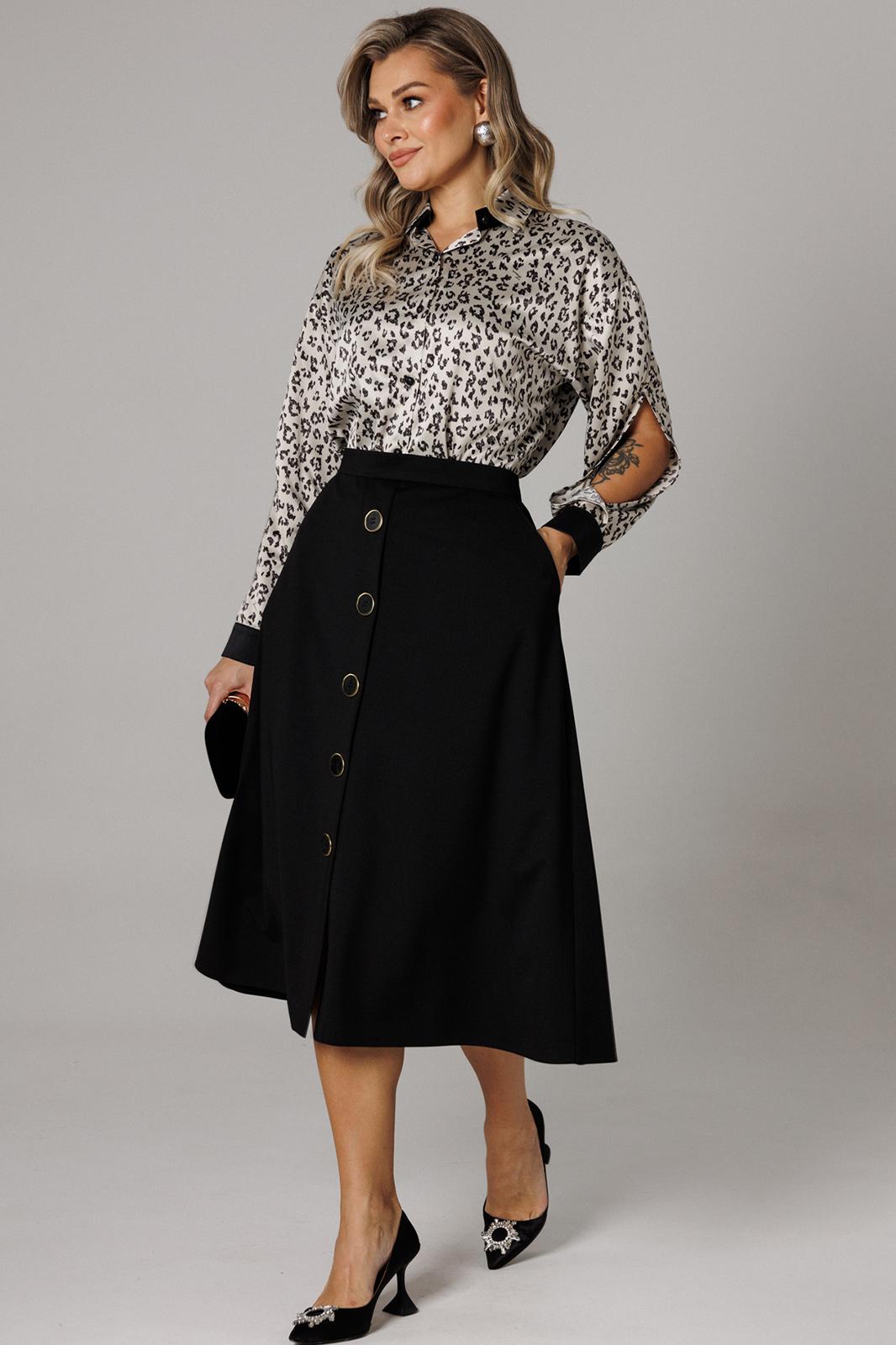 Оригинальный комплект женский 2-х пердментый (блузка, юбка) от бренда Anastasia, идеальный для любого случая. Этот комплект сочетает в себе элегантность и комфорт, что делает его подходящим как для повседновной носки, так и для праздничных мероприятий. Блузка из атласной ткани прямого силуэта со спущенным плечом. По бокам закругленные разрезы. Рукав с запахом и разрезом, на манжете. Застежка – планка на петли и пуговицы. Воротник на отрезной стойке. Стойка и манжета из отделочной ткани. По спинке идет отрезная кокетка. Такой женский офисный стиль можно носить, сочетая с другими вещами гардероба, создавая новые образы. Ткань атласная качественная и очень комфортная. Юбка А-силуэта, длинна миди. По передней части идет застежка-обманка с пуговицами. По бокам карманы. По спинке средний шов, переходящий в застежку молнию. Пояс отрезной . Длина по спинке: (48-52)-70 см, (54-58)-72 см. Длина рукава с манжетой: (48-52)-55 см, (54-58)-57 см. Длина юбки: (48-58)-80 см