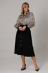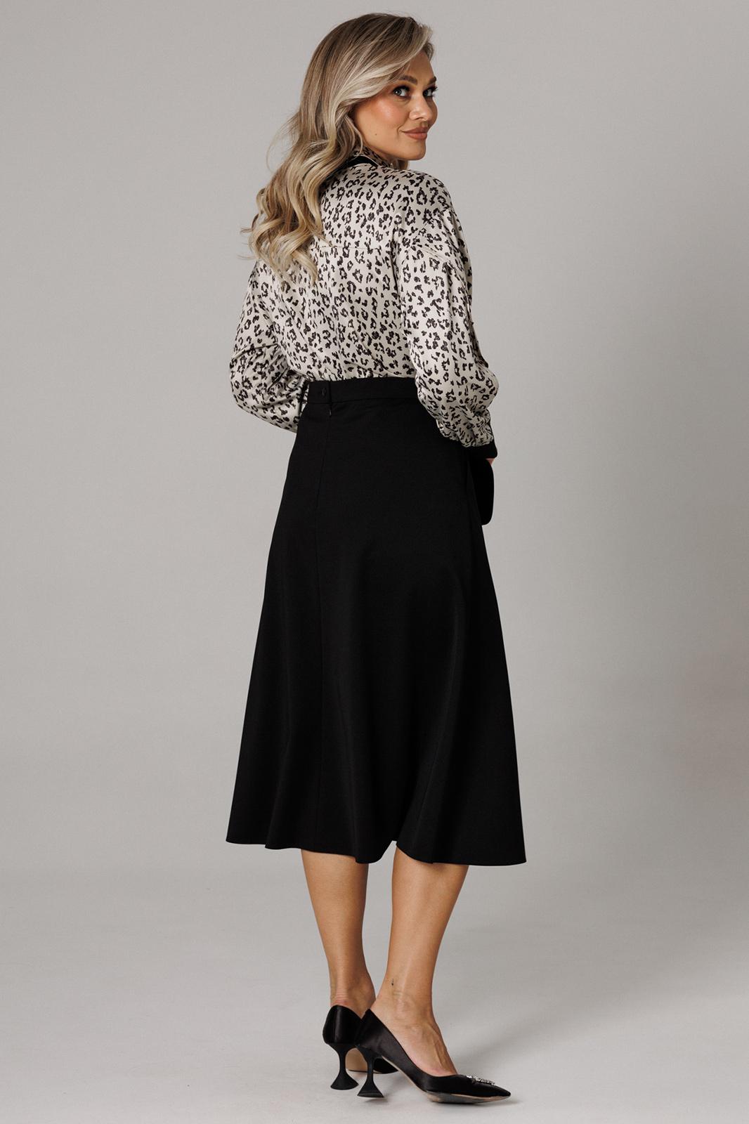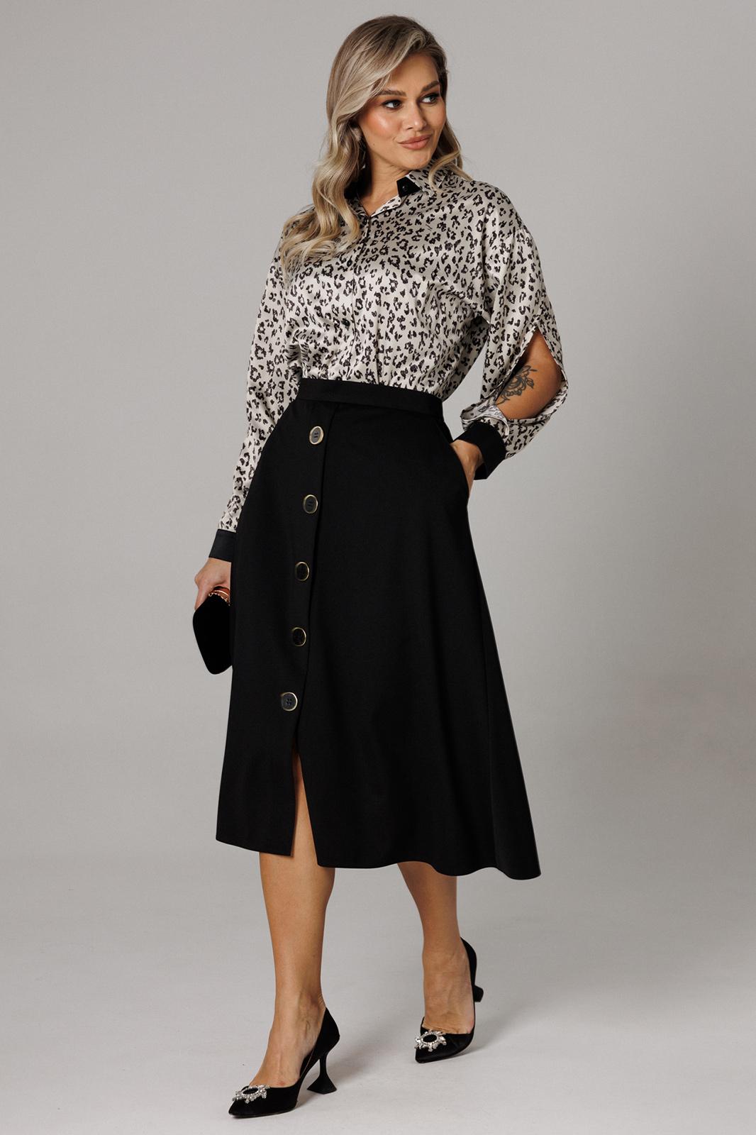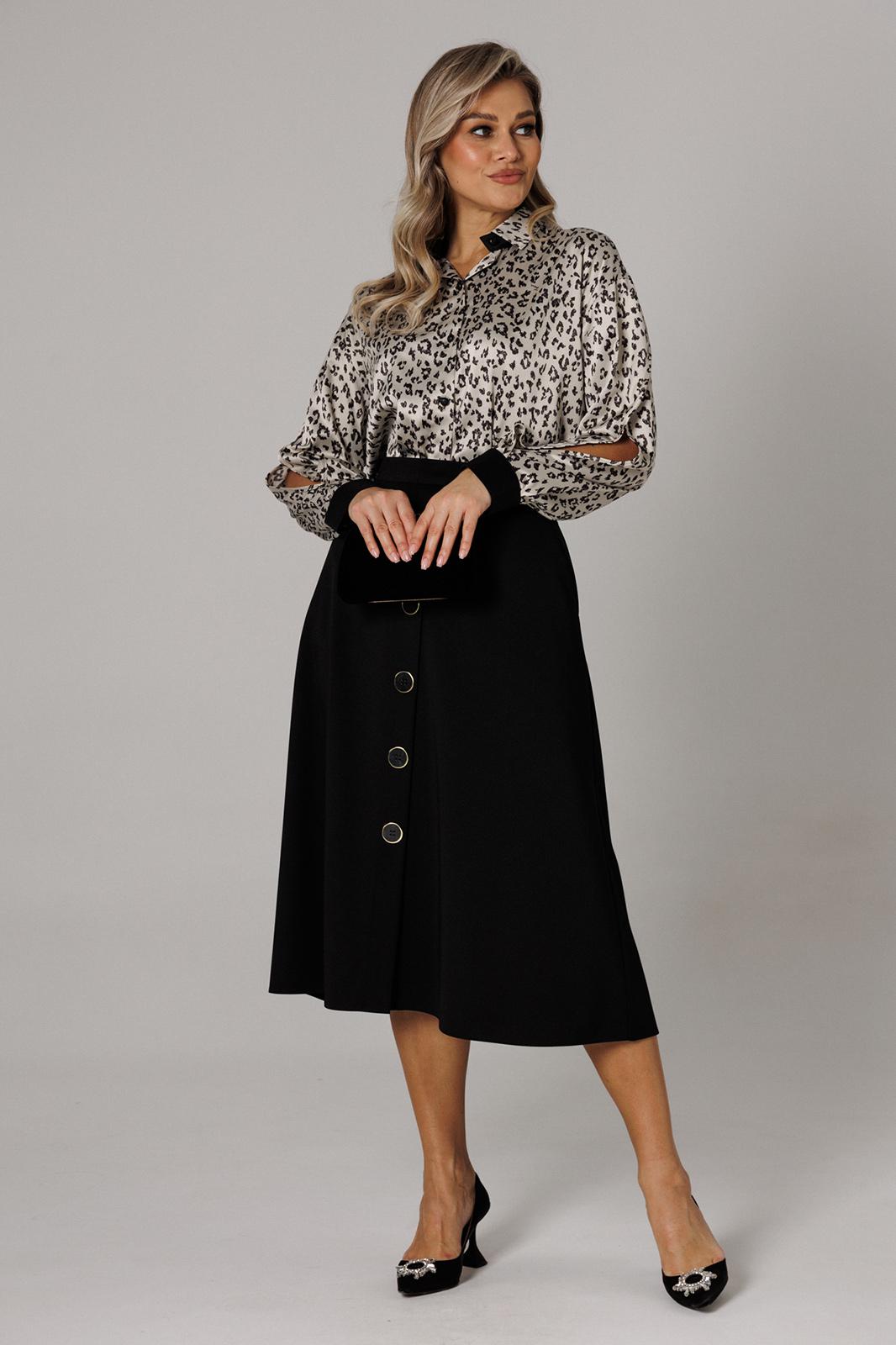 Оригинальный комплект женский 2-х пердментый (блузка, юбка) от бренда Anastasia, идеальный для любого случая. Этот комплект сочетает в себе элегантность и комфорт, что делает его подходящим как для повседновной носки, так и для праздничных мероприятий. Блузка из атласной ткани прямого силуэта со спущенным плечом. По бокам закругленные разрезы. Рукав с запахом и разрезом, на манжете. Застежка – планка на петли и пуговицы. Воротник на отрезной стойке. Стойка и манжета из отделочной ткани. По спинке идет отрезная кокетка. Такой женский офисный стиль можно носить, сочетая с другими вещами гардероба, создавая новые образы. Ткань атласная качественная и очень комфортная. Юбка А-силуэта, длинна миди. По передней части идет застежка-обманка с пуговицами. По бокам карманы. По спинке средний шов, переходящий в застежку молнию. Пояс отрезной . Длина по спинке: (48-52)-70 см, (54-58)-72 см. Длина рукава с манжетой: (48-52)-55 см, (54-58)-57 см. Длина юбки: (48-58)-80 см