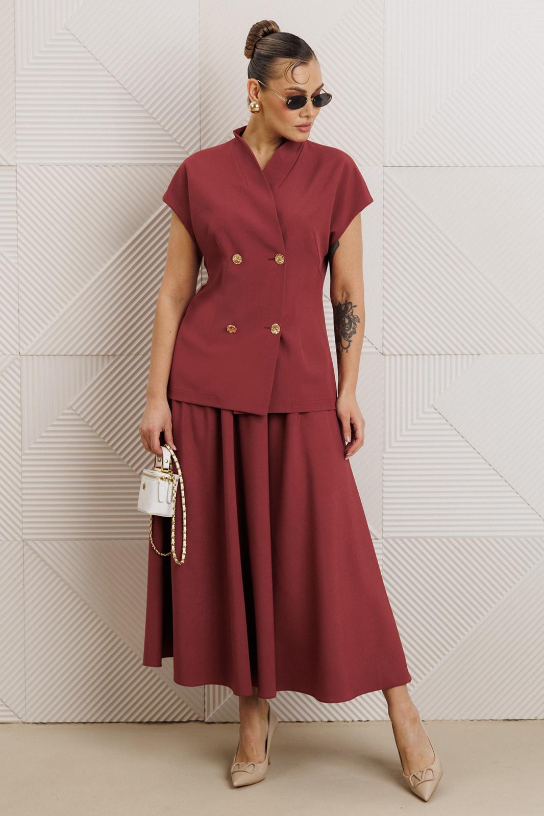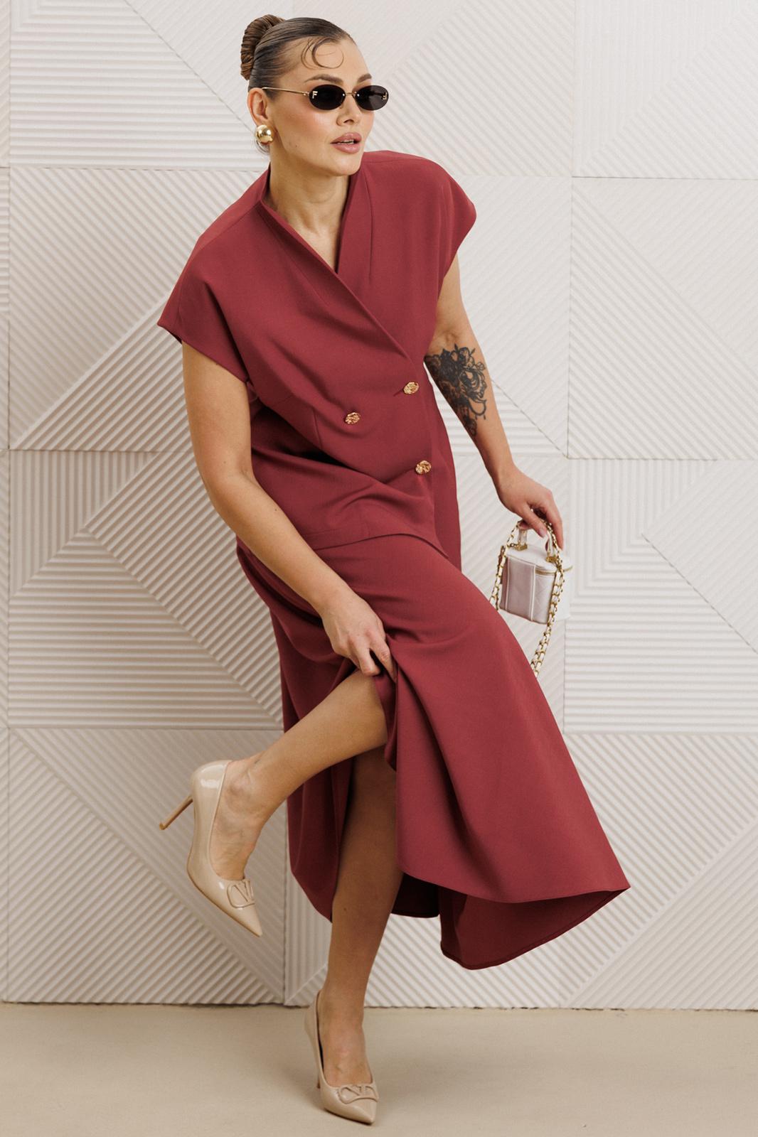 Бренд белорусской женской Anastasia представляет костюм двойку. Костюм женский 2-х предметный (жилет, юбка) из костюмной ткани станет отличным дополнением к Вашему гардеробу. Подойдет для повседневной носки (работа, офис, прогулки). Достаточно дополнить его соответствующими предметами из вашего гардероба: блузка, майка, водолазка, гольф, свитер, лонгслив, свитшот. Или акссесуарами: ремешок или пояс. Жилет полуприлегающего силуэта, со спущенным плечом. Может быть самостоятельным элементом гордерба. Застежка двухбортная. Воротник цельнокроеная стойка. По полочке идет грудовая выточка из бокового шва, по спинке средний шов. Юбка-макси, полусолнце. Пояс отрезной на резинке. По бокам - карманы. Акцентный элемент- золотые пуговицы. Благодаря своему крою и фасону костюм подчеркивает женственные формы и скрывает то, что должно быть незаметным. Это повседневный вариант на каждый день для занятий в школе или для офиса, на работу или на прогулку. Наденьте его на деловую встречу, официальное мероприятие, школьное торжество. Модель подойдёт для образа в университет или колледж. Длина по спинке (48-52)-72см, (54-58)-74 см. Длина юбки (48-58) - 94см.
