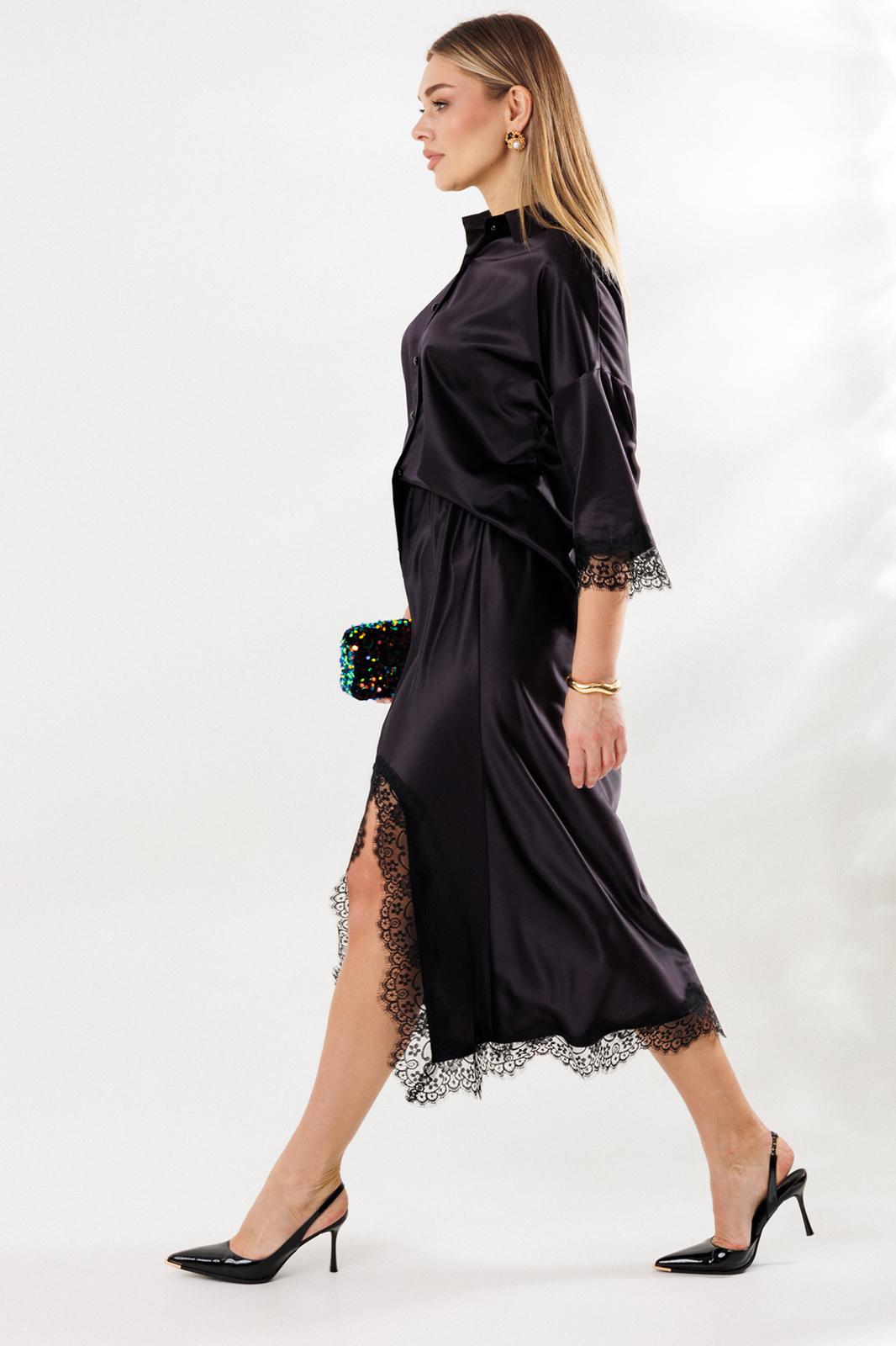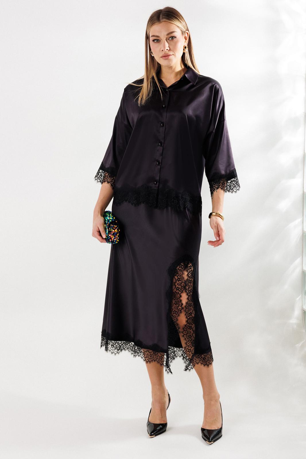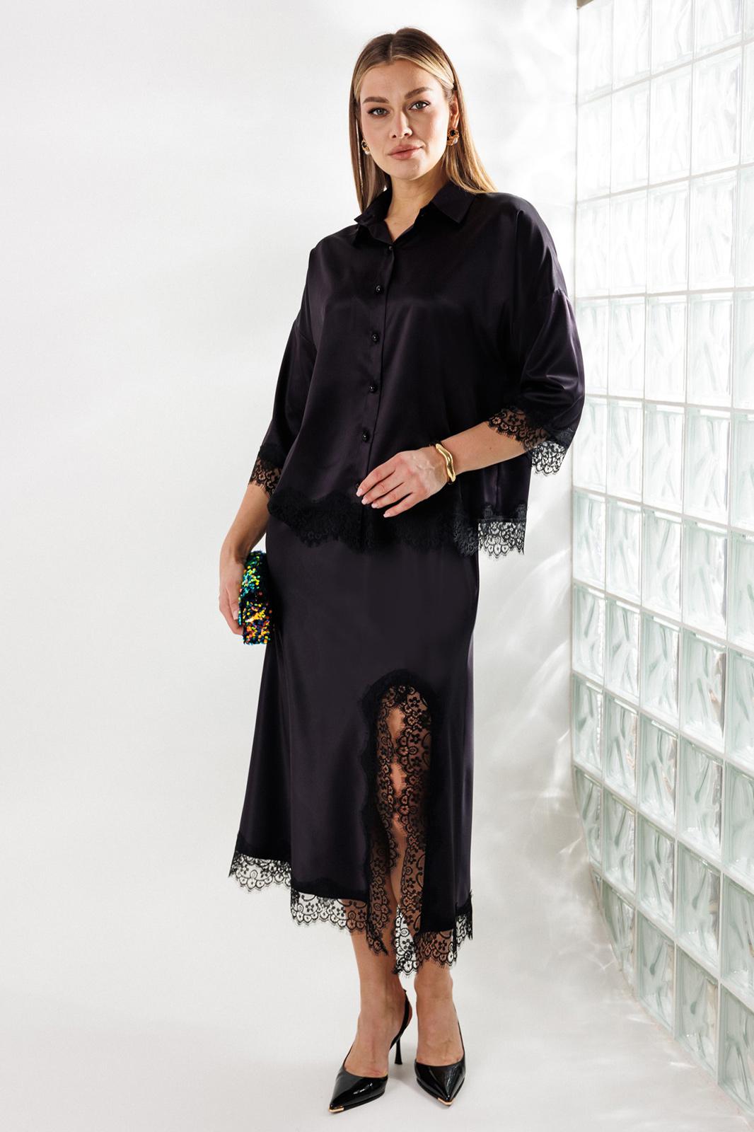 Женский элегантный костюм от Anastasia, подходящий для нарядной и повседневной носки. Костюм женский 2-х предметный из атласной ткани с отделкой из деликатного кружева (блузка, юбка). Ажурное кружево, деликатно украшающее низ костюма, добавляет образу романтичности и утонченности. Отлично подойдет на любой тип фигуры, подчеркнет вашу женственность. Блузка прямого силуэта со спущенным плечом. Застежка- планка на петли и пуговицы. Воротник на отрезной стойке. Рукав одношовный, втачной, 3/4 длины. Юбка косая с разрезом по колену длины миди выполнена из мягкого атласа, который приятно струится по фигуре, создавая женственный и изысканный силуэт. Пояс на резинке. Юбка с кружевом внизу станет идеальным выбором для создания как повседневных, так и праздничных образов. Длина блузки с крудевом (50-54)- 59см, (56-60)- 62см . Длина рукава с кружевом (50-60)- 29см. Длина юбки с кружевом (50-60)- 90 см.