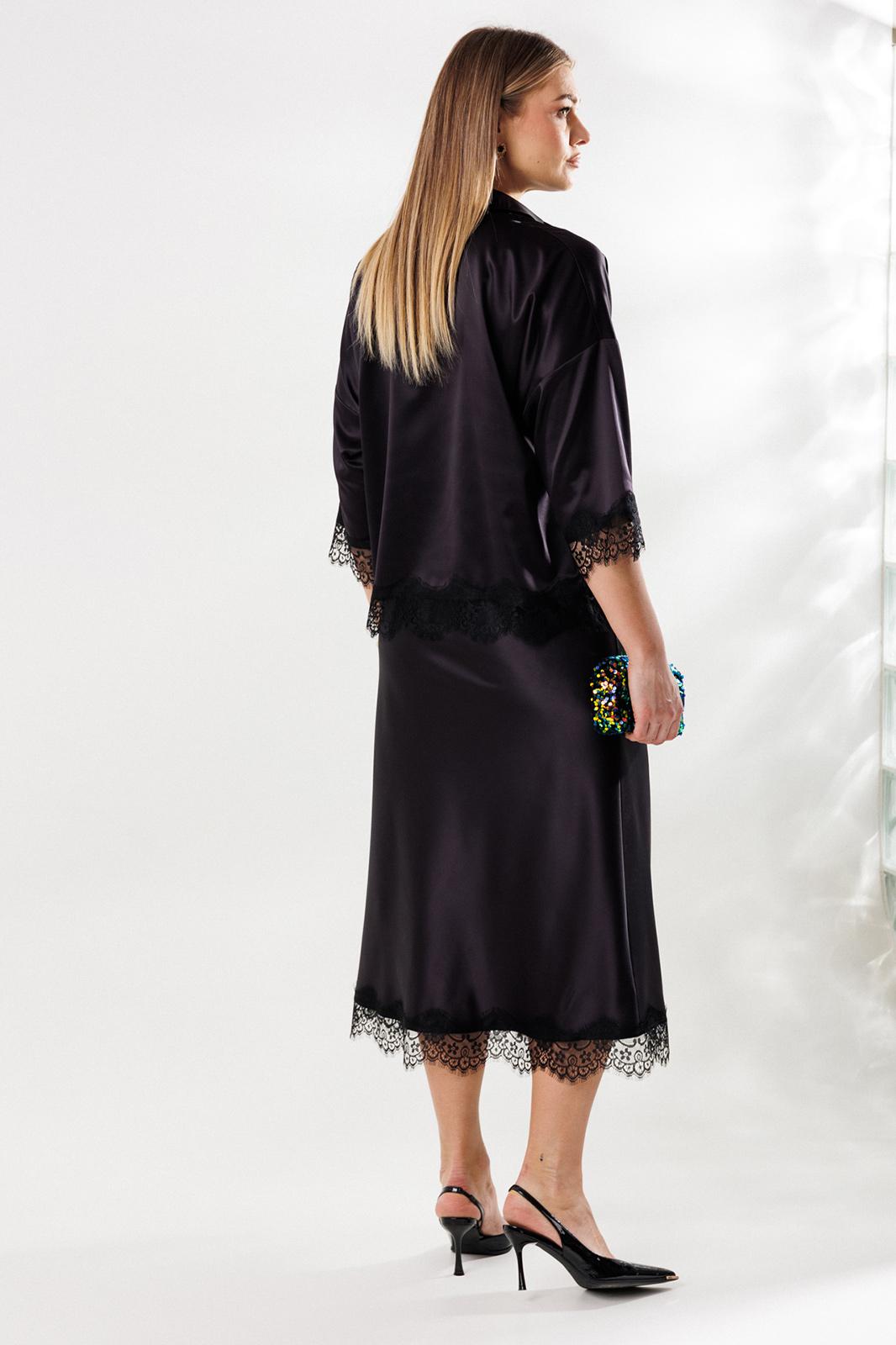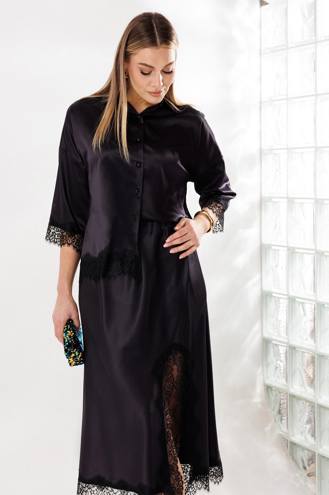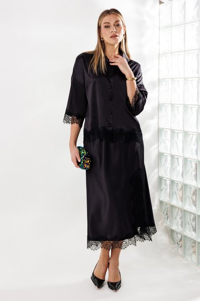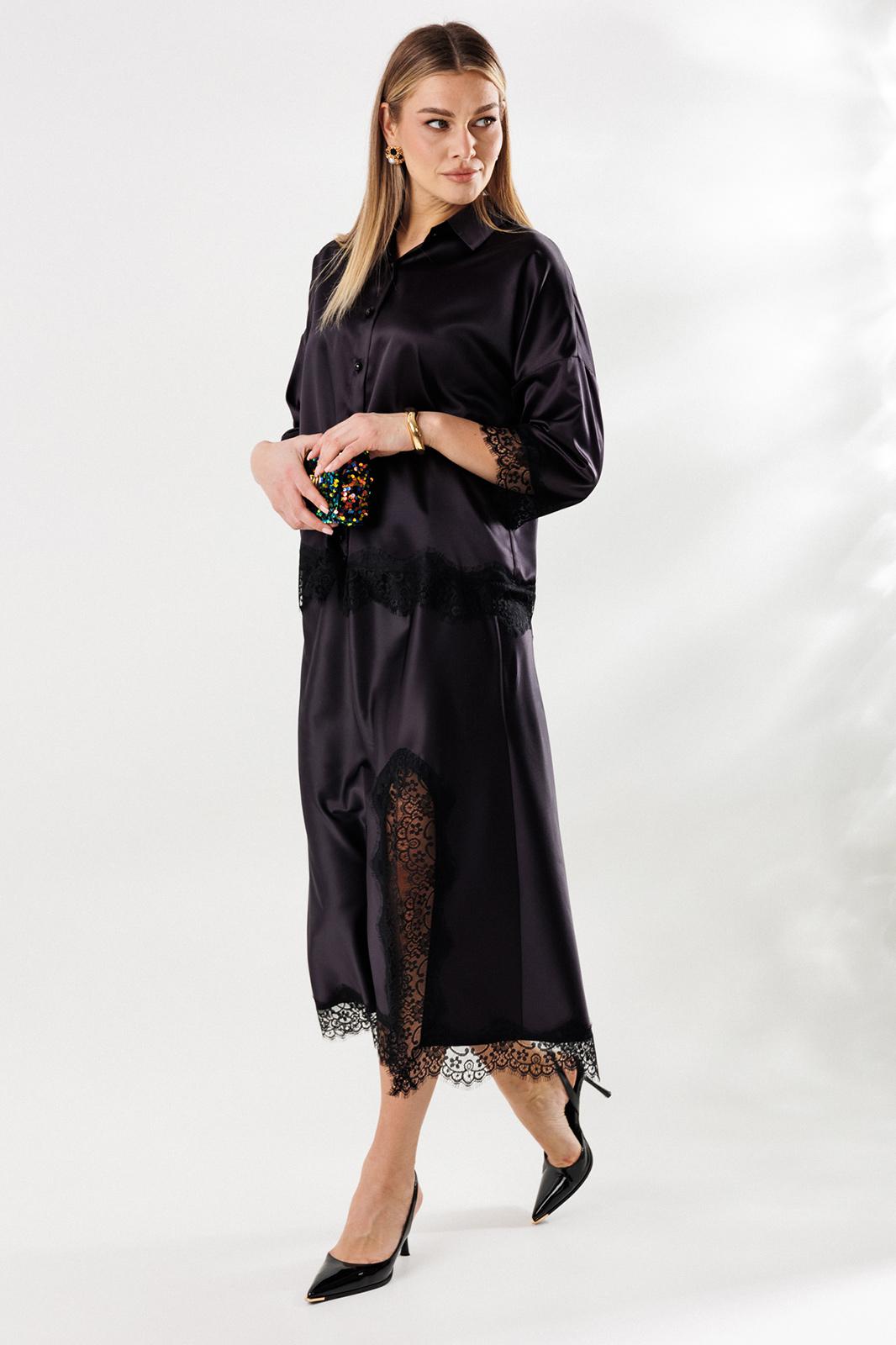 Женский элегантный костюм от Anastasia, подходящий для нарядной и повседневной носки. Костюм женский 2-х предметный из атласной ткани с отделкой из деликатного кружева (блузка, юбка). Ажурное кружево, деликатно украшающее низ костюма, добавляет образу романтичности и утонченности. Отлично подойдет на любой тип фигуры, подчеркнет вашу женственность. Блузка прямого силуэта со спущенным плечом. Застежка- планка на петли и пуговицы. Воротник на отрезной стойке. Рукав одношовный, втачной, 3/4 длины. Юбка косая с разрезом по колену длины миди выполнена из мягкого атласа, который приятно струится по фигуре, создавая женственный и изысканный силуэт. Пояс на резинке. Юбка с кружевом внизу станет идеальным выбором для создания как повседневных, так и праздничных образов. Длина блузки с крудевом (50-54)- 59см, (56-60)- 62см . Длина рукава с кружевом (50-60)- 29см. Длина юбки с кружевом (50-60)- 90 см.