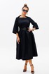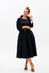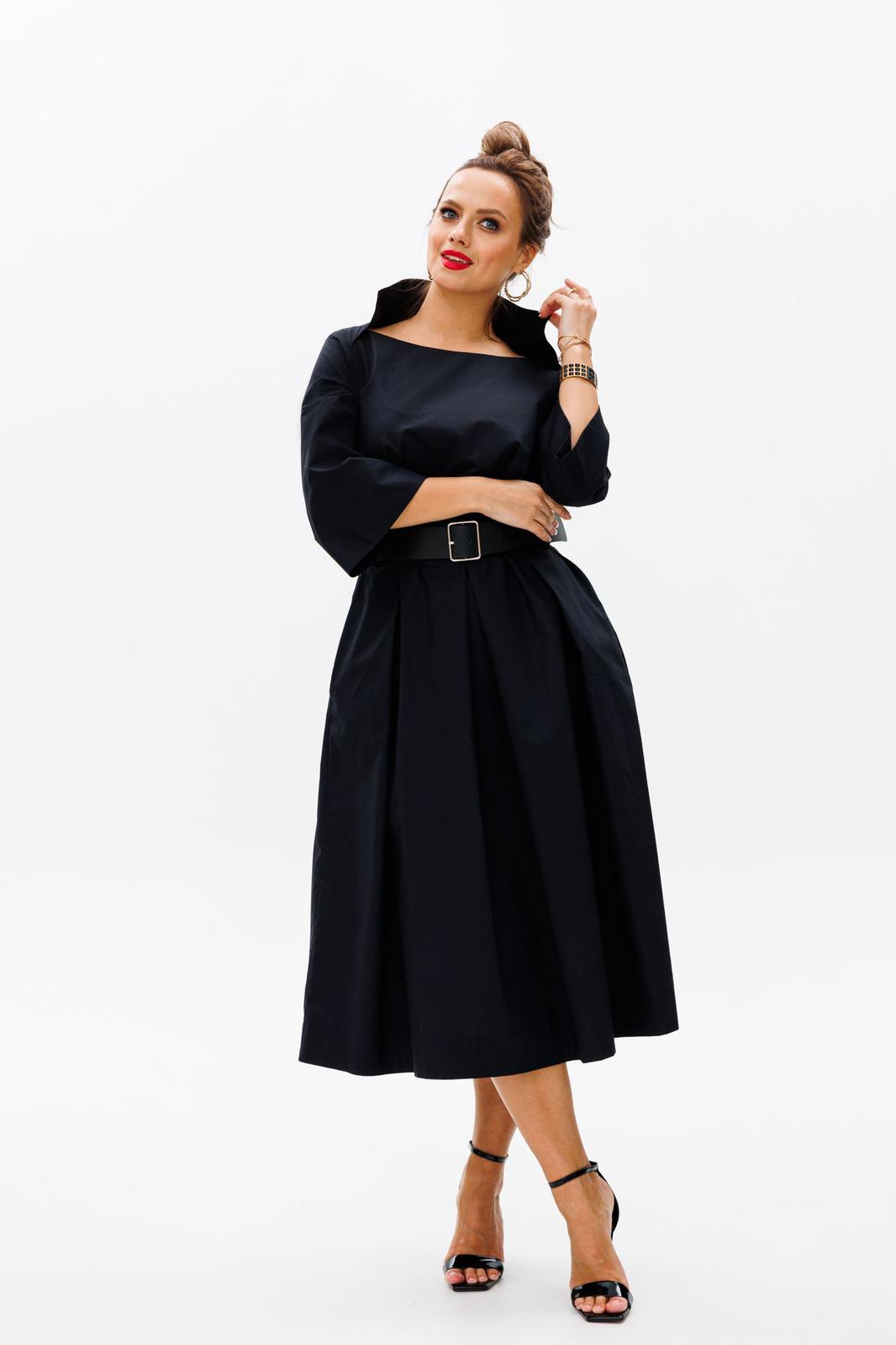 Шикарное черное платье с поясом ремнем. Идеально на любую погоду: под босоноржки либо под сапоги и пальто. Отличный вариант универсального изделия: подойдет как для повседневного и офисного гардероба, так и для праздничного выхода. Отрезное по линии талии. По полочке объем груди создается за счет направленных складок из подреза. Объем юбки создается за счет центральной встречной и 2-х односторонних складок. По бокам в юбке- карманы. Рукав втачной, 3/4 длинны с отворотом. Вырез горловины лодочка с отложным воротником. В комплекте съемный пояс. Длина спинки до подреза -45 см., длина юбки -77см. Длина рукава-44 см.