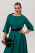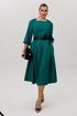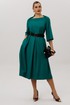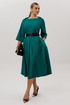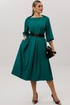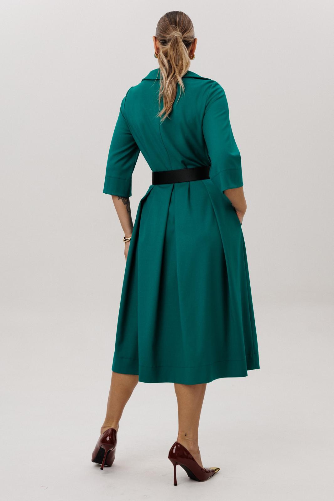 Шикарное платье с поясом ремнем. Отличный вариант универсального изделия: подойдет как для повседневного и офисного гардероба, так и для праздничного выхода. Отрезное по линии талии. По полочке объем груди создается за счет направленных складок из подреза. Объем юбки создается за счет центральной встречной и 2-х односторонних складок. По бокам в юбке- карманы. Рукав втачной, 3/4 длинны с отворотом. Вырез горловины лодочка с отложным воротником. В комплекте съемный пояс. Длина спинки до подреза -45 см., длина юбки -77см. Длина рукава-44 см.