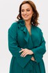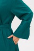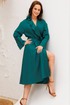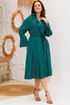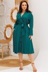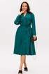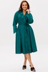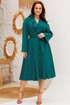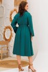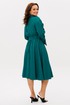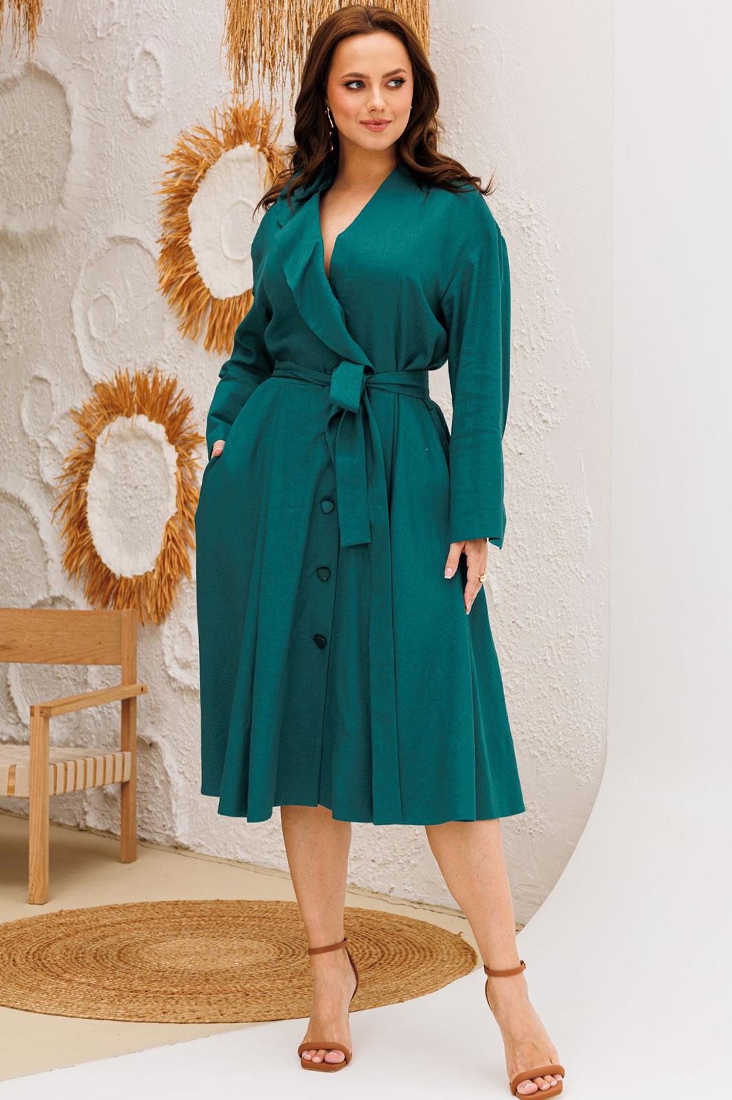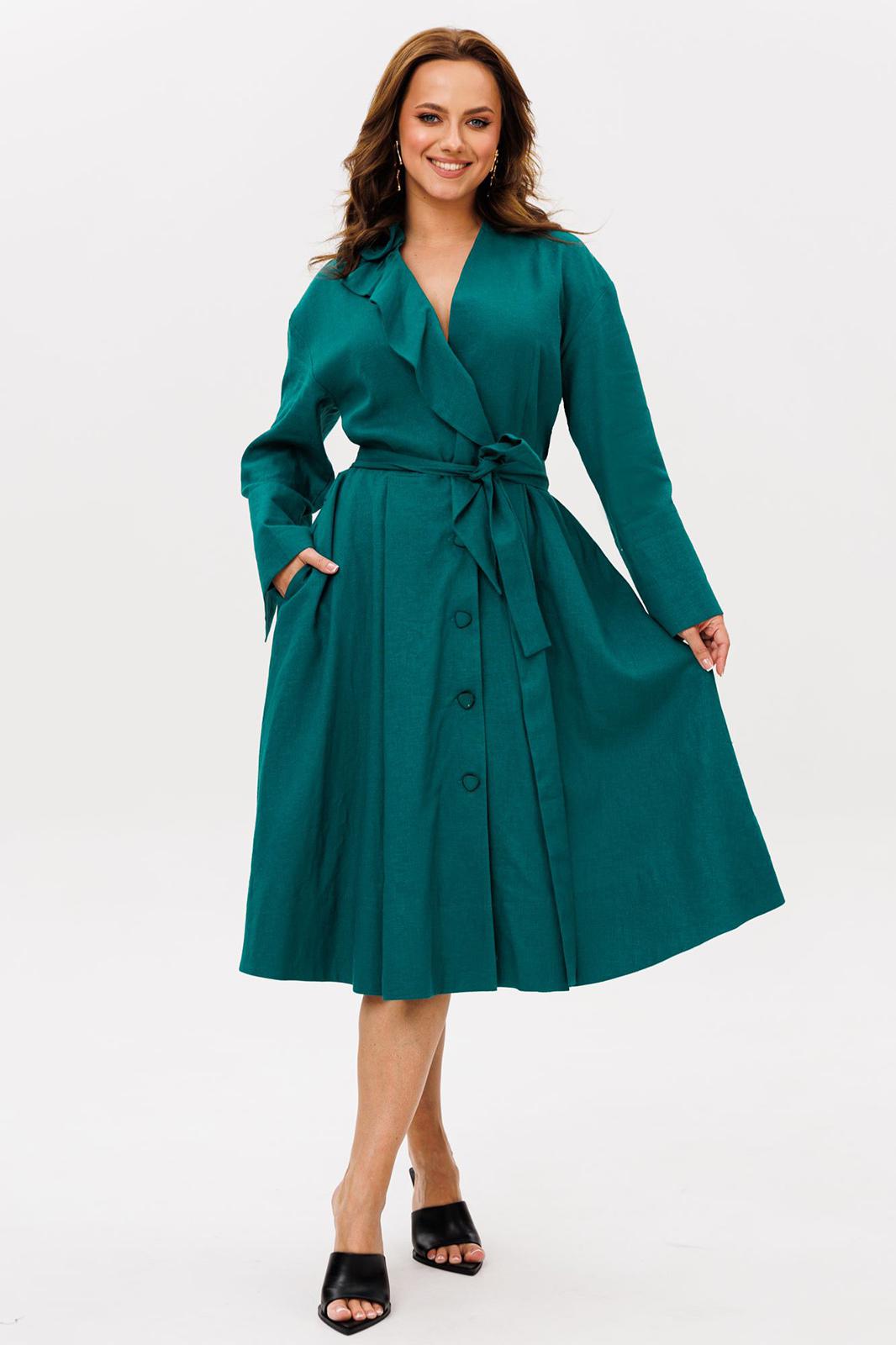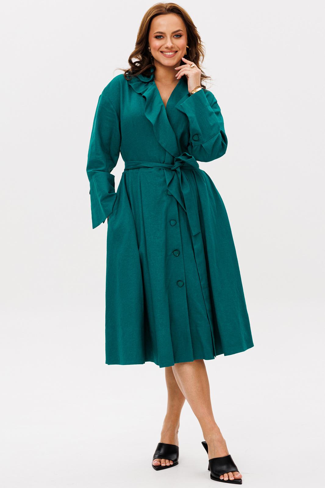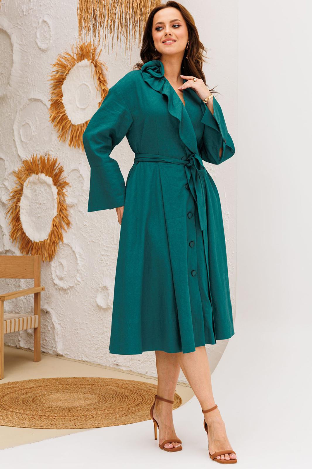 Элегантное женское палтье из натуральной ткани (лен, хлопок) необычного кроя станет изюминкой вашего гардероба. Платье прилегающего силуэта, отрезное по линии талии, по передеу застежка на петли и пуговицы, в верхней части платья по полочке прилегание создается за счет талиевых выточек, по спинке - за счет резинки по линии талии. Юбка-полусолнце с односторонними складками, по бокам карманы. Плечо спущенное, рукав укороченный, на высокой манжете на одну пуговицу. Горловина по полочке выполненна в виде цельнокроеной стойки, переходящей в отрезную по спинке. В качестве декора по краю борта идет жабо, переходящее в цветок. . В комплекте съемный пояс в тон платья. Длина по спинке:-111 см. Длина рукава с манжето -51 см.