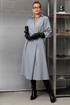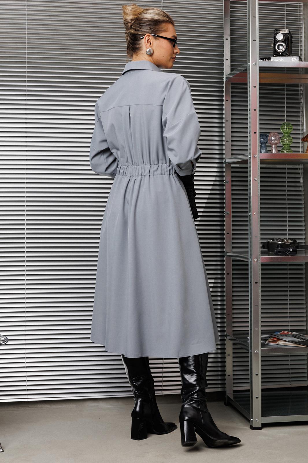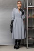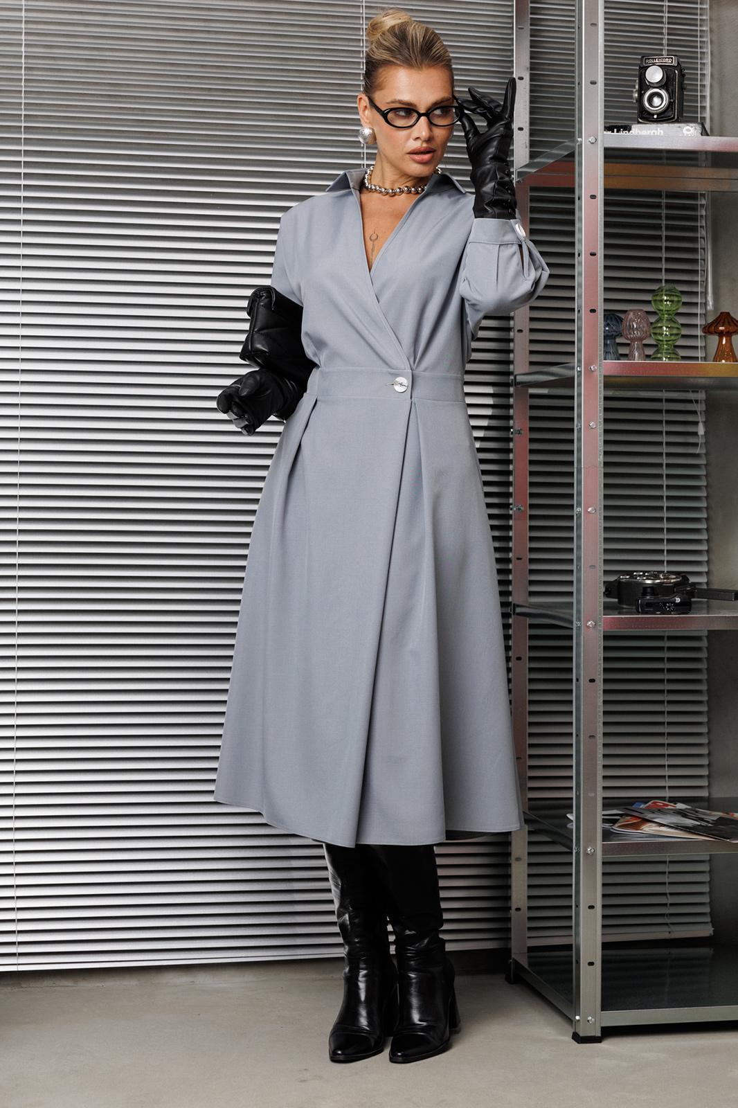 Элегантное женское палтье из костюмной ткани необычного кроя станет изюминкой вашего гардероба. Платье полуприлегающего силуэта, отрезное по линии талии со спущенным плечом. Рукав 3/4 длиный на отрезной манжете. По полочке идут защипы-складки в верхней и нижней частях, запах - на петли и пуговицы по подрезу. По нижней части платья запах идет в виде складки. По спинке кокетка со складкой, по подрезу вставлена резинка. Юбка-полусолнце с односторонними складками по полочке, по бокам карманы. По горловине воротник на отрезной стойке. Платье будет идеально смотреться с туфлями, ботинкаи и сапогами. Длина по спинке: 117см. Длина рукава с манжето 29см.