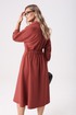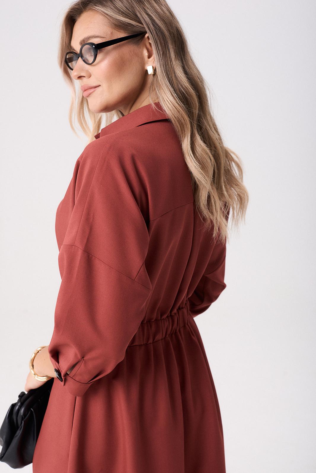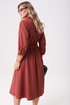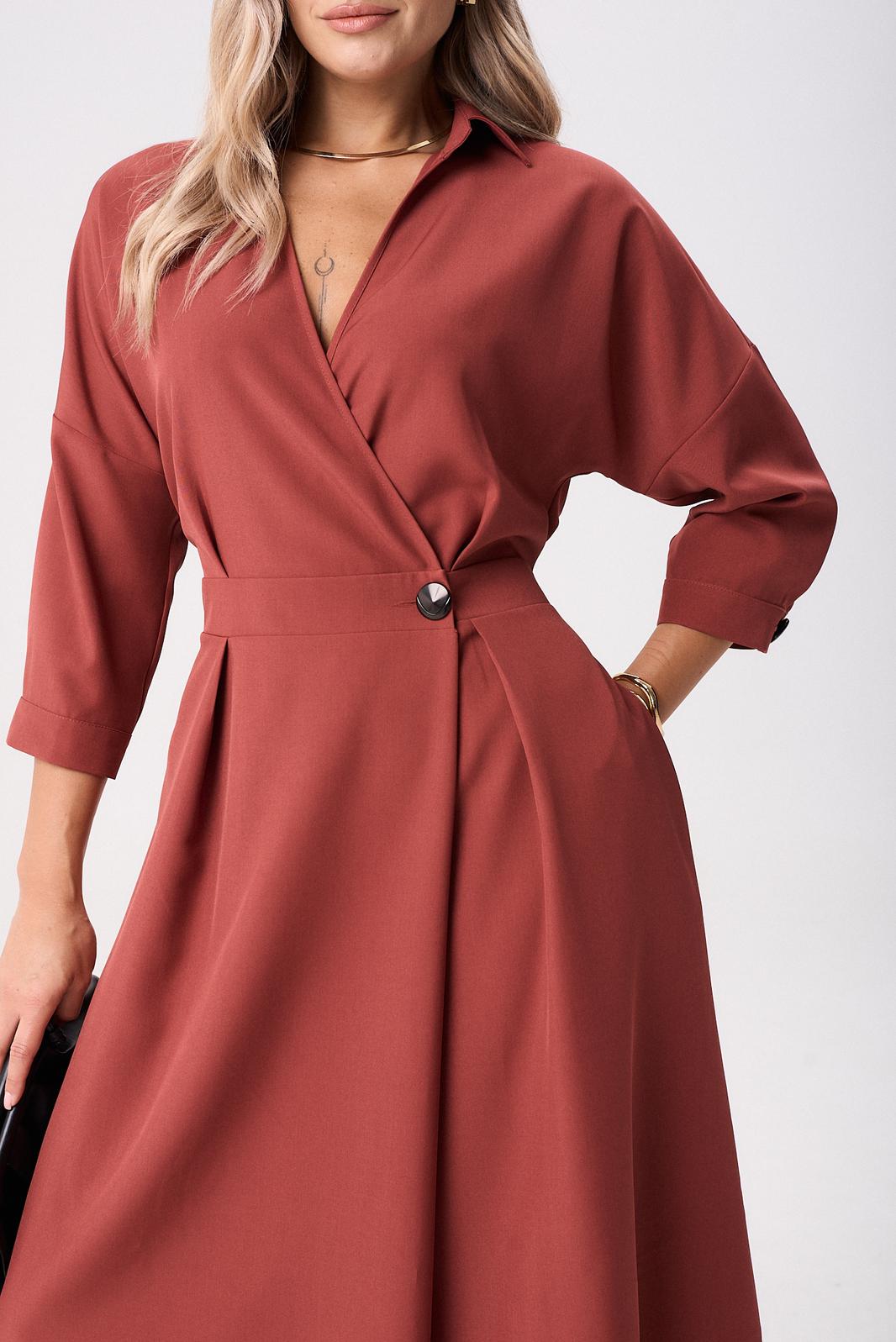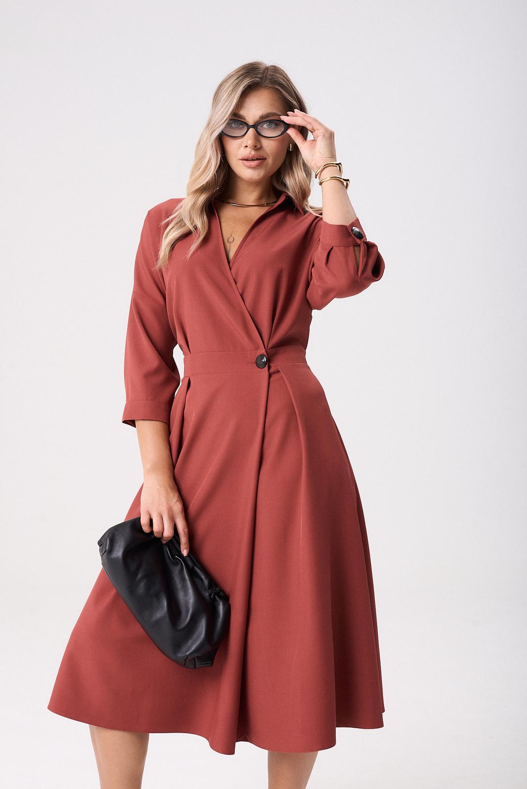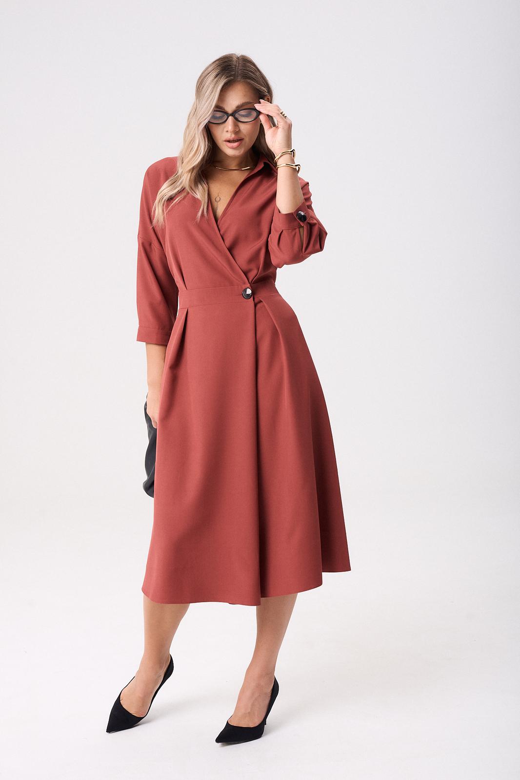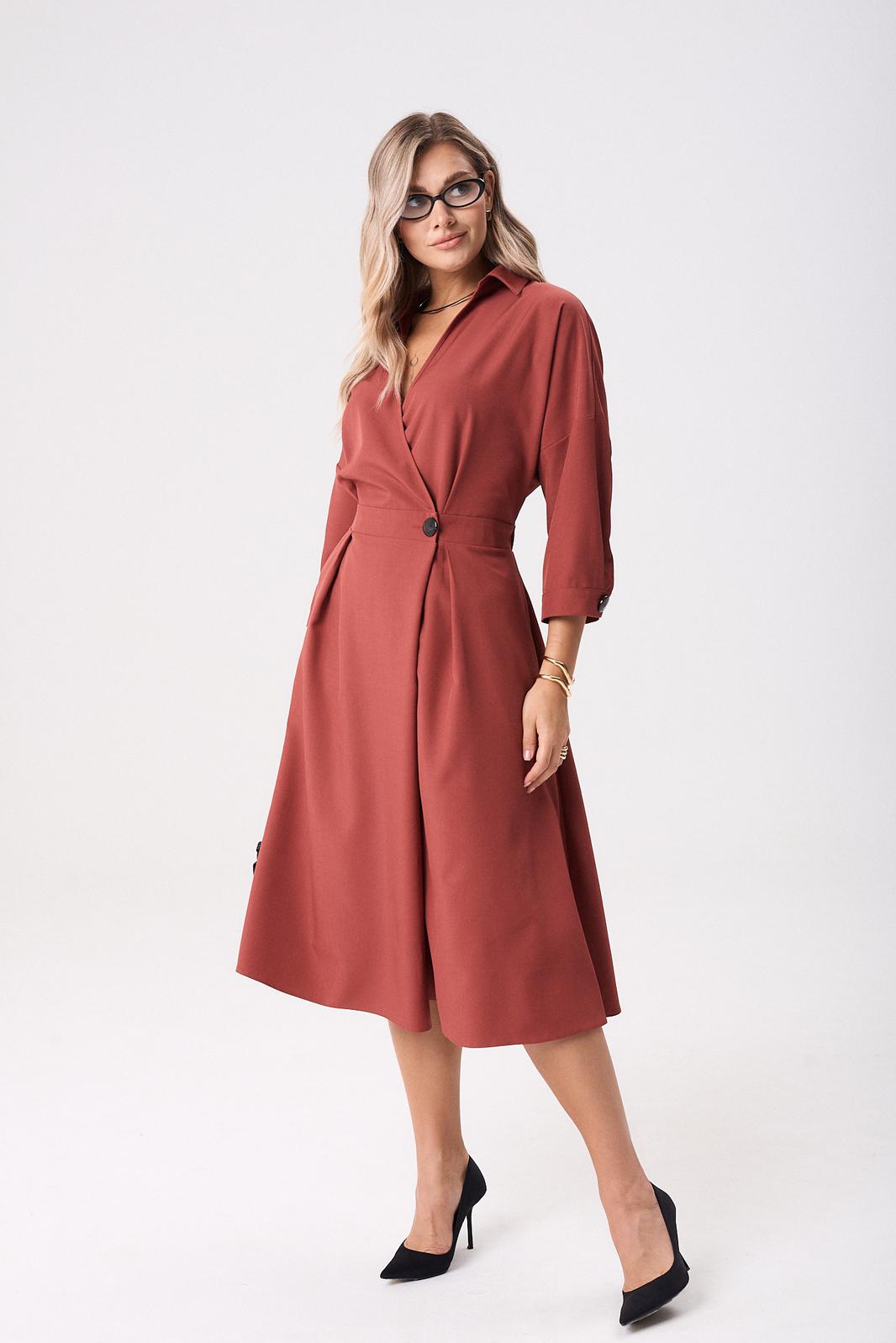 Элегантное женское палтье из костюмной ткани необычного кроя станет изюминкой вашего гардероба. Платье полуприлегающего силуэта, отрезное по линии талии со спущенным плечом. Рукав 3/4 длиный на отрезной манжете. По полочке идут защипы-складки в верхней и нижней частях, запах - на петли и пуговицы по подрезу. По нижней части платья запах идет в виде складки. По спинке кокетка со складкой, по подрезу вставлена резинка. Юбка-полусолнце с односторонними складками по полочке, по бокам карманы. По горловине воротник на отрезной стойке. Платье будет идеально смотреться с туфлями, ботинкаи и сапогами. Длина по спинке: 117см. Длина рукава с манжето 29см.