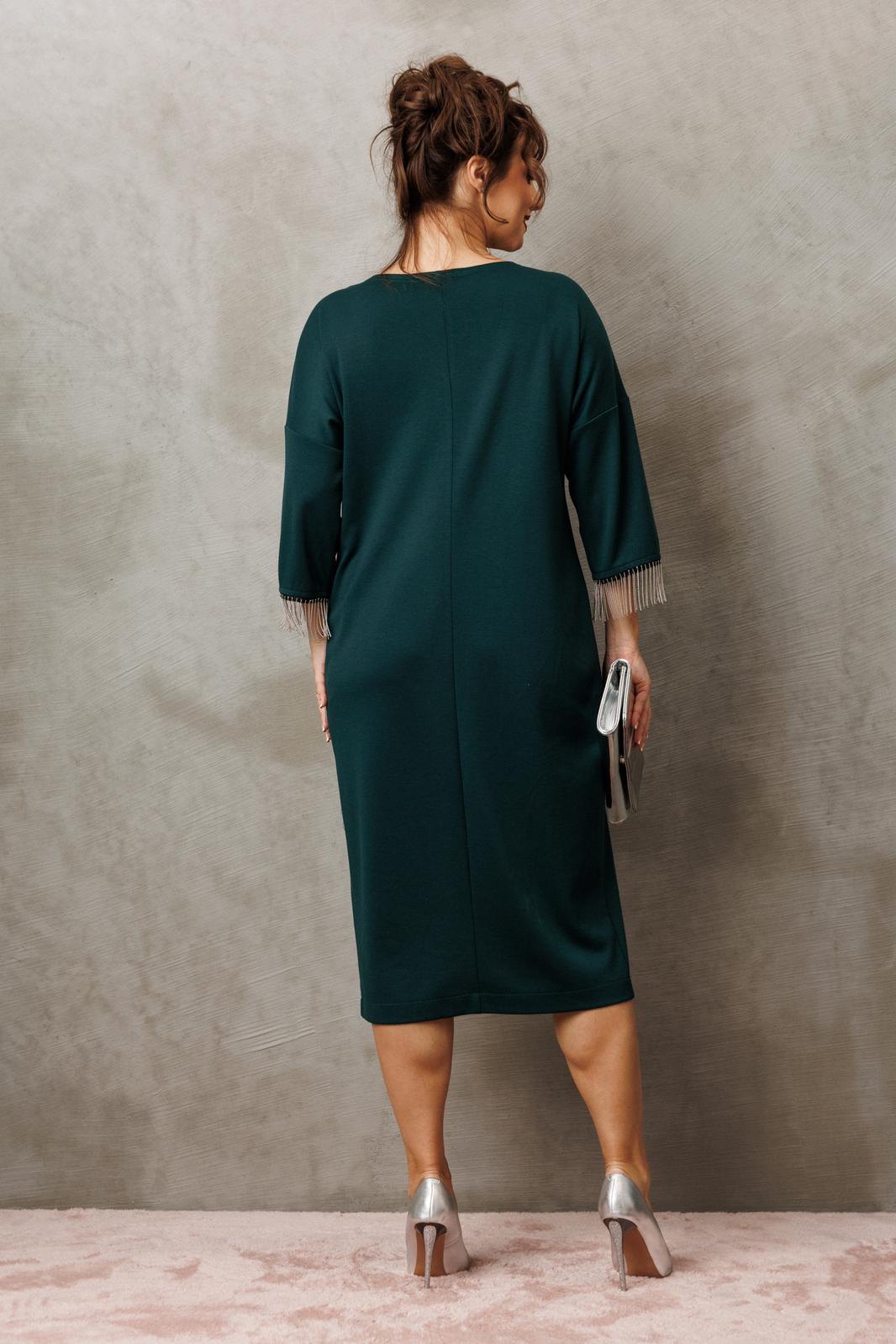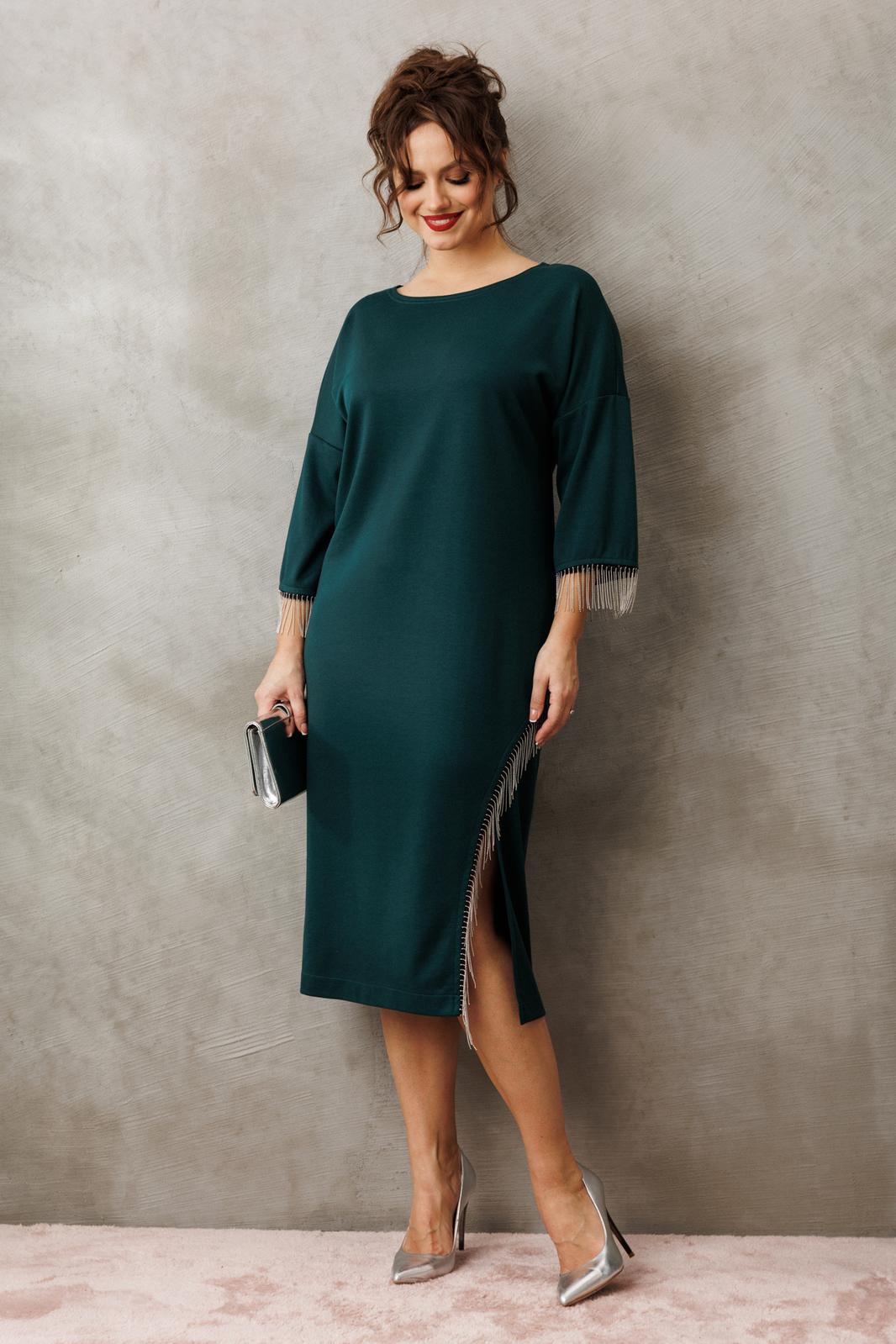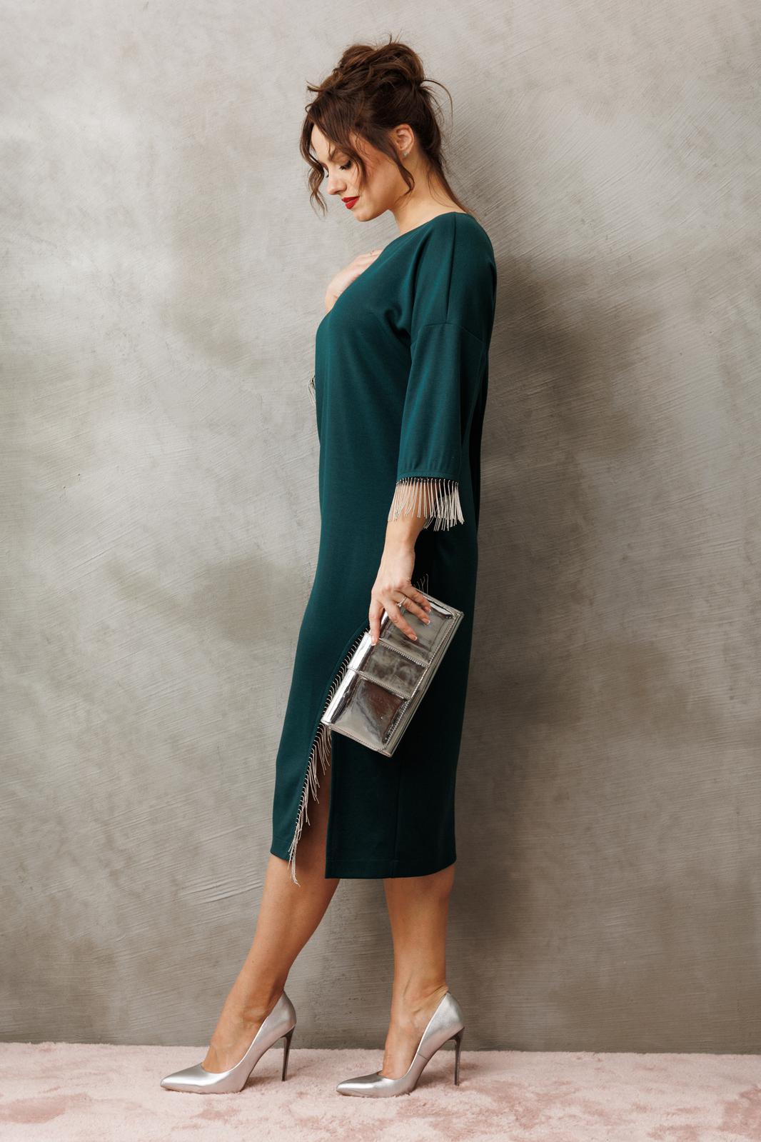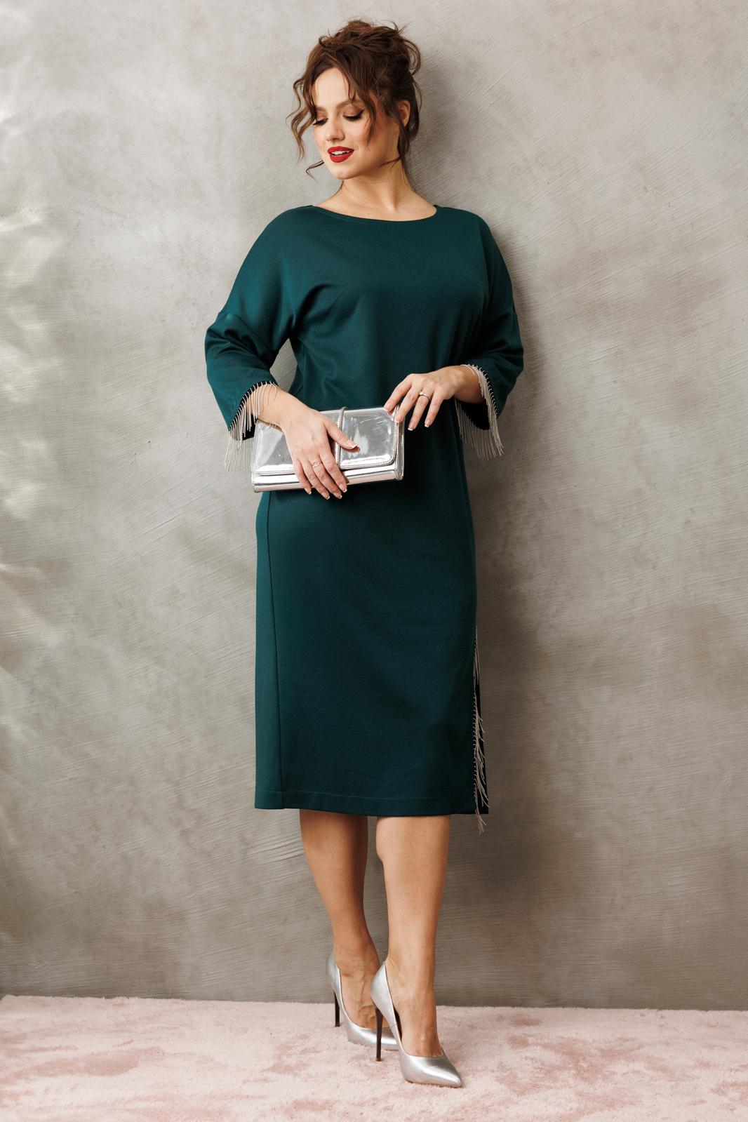 Платье миди — не просто одежда, это заявление о вашем стиле и вкусе. Элегантное праздничное платье прямного силуэта из трикотажного полотна. Ткань не мнется. Благодаря своему крою подойдёт для разных типов фигуры. Оно подчеркнёт вашу индивидуальность и станет отличным дополнением к вашему гардеробу. В нём вы будете чувствовать себя уверенно и комфортно, зная, что выглядите на все сто. Выбирая его, вы выбираете качество, комфорт и стиль. Классическое платье прямого силуэта, со спущенным плечом. По переду идет подрез с разрезом. В качестве декора по подрезу и низу рукава- металлизированная бахрома. По спинке идет средний шов. Такое платье незаменимая вещь в любом гардеробе. Длина платья по спинке (48-52) - 108см, (54-58) - 112 см. Длина рукава: (48-58) - 24 см.
