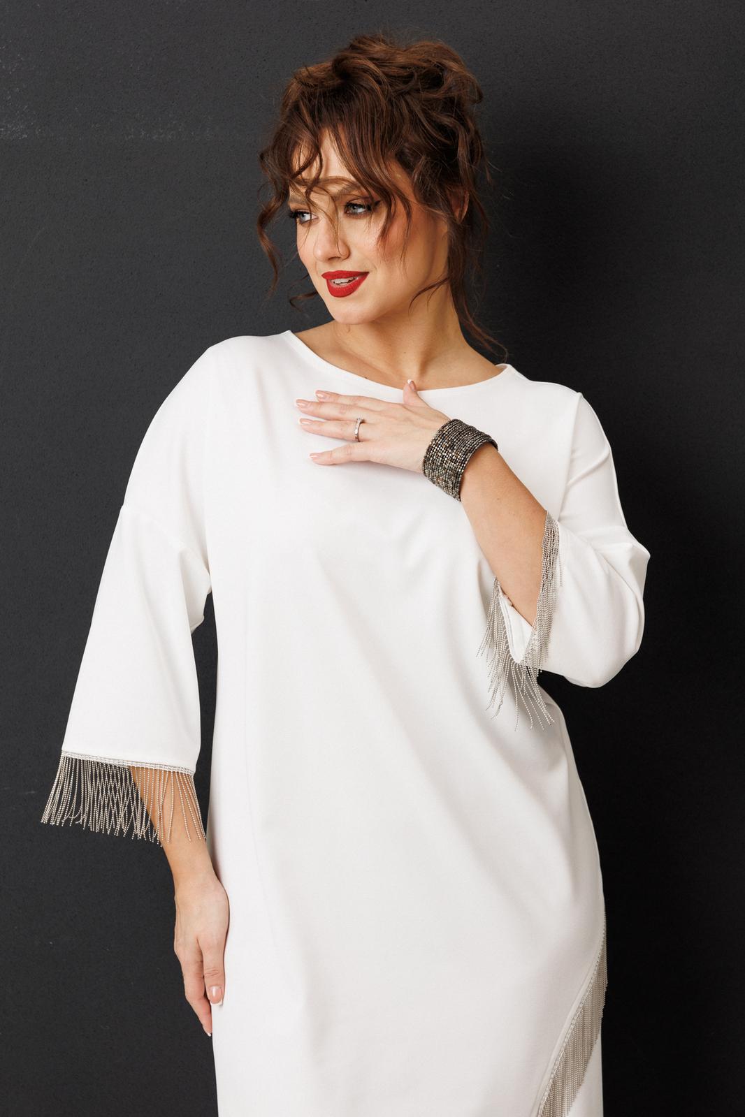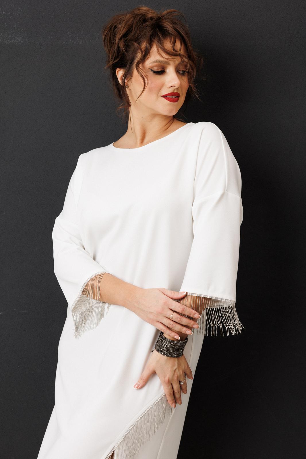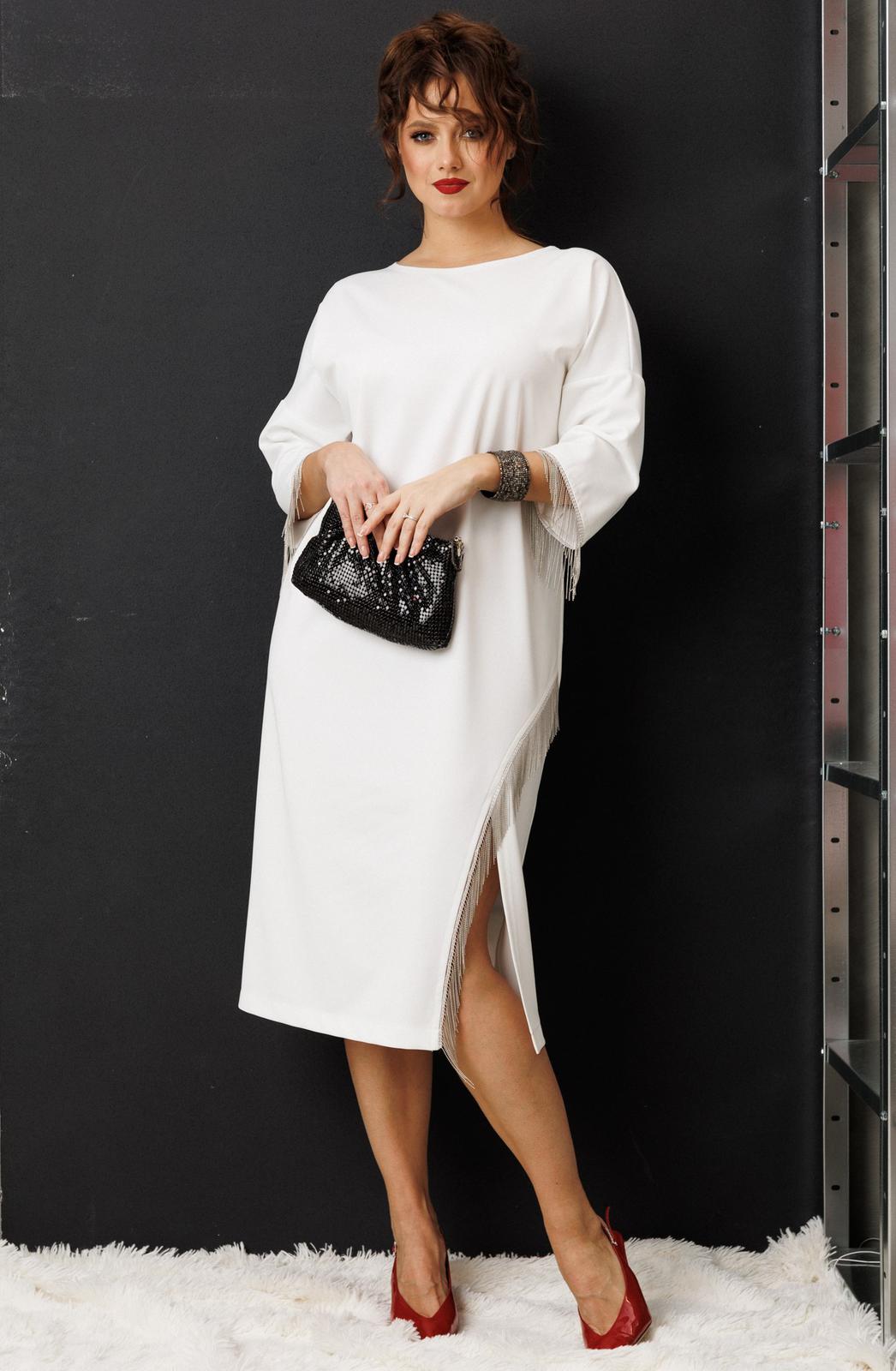 Платье миди — не просто одежда, это заявление о вашем стиле и вкусе. Элегантное праздничное платье прямного силуэта из трикотажного полотна. Ткань не мнется. Благодаря своему крою подойдёт для разных типов фигуры. Оно подчеркнёт вашу индивидуальность и станет отличным дополнением к вашему гардеробу. В нём вы будете чувствовать себя уверенно и комфортно, зная, что выглядите на все сто. Выбирая его, вы выбираете качество, комфорт и стиль. Классическое платье прямого силуэта, со спущенным плечом. По переду идет подрез с разрезом. В качестве декора по подрезу и низу рукава- металлизированная бахрома. По спинке идет средний шов. Такое платье незаменимая вещь в любом гардеробе. Длина платья по спинке (48-52) - 108см, (54-58) - 112 см. Длина рукава: (48-58) - 24 см.