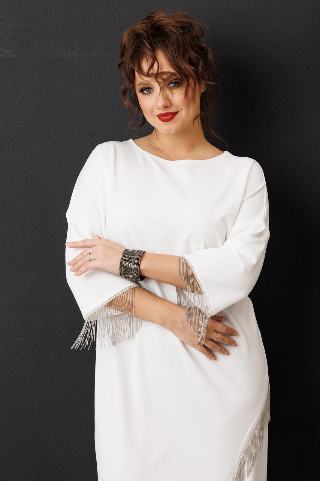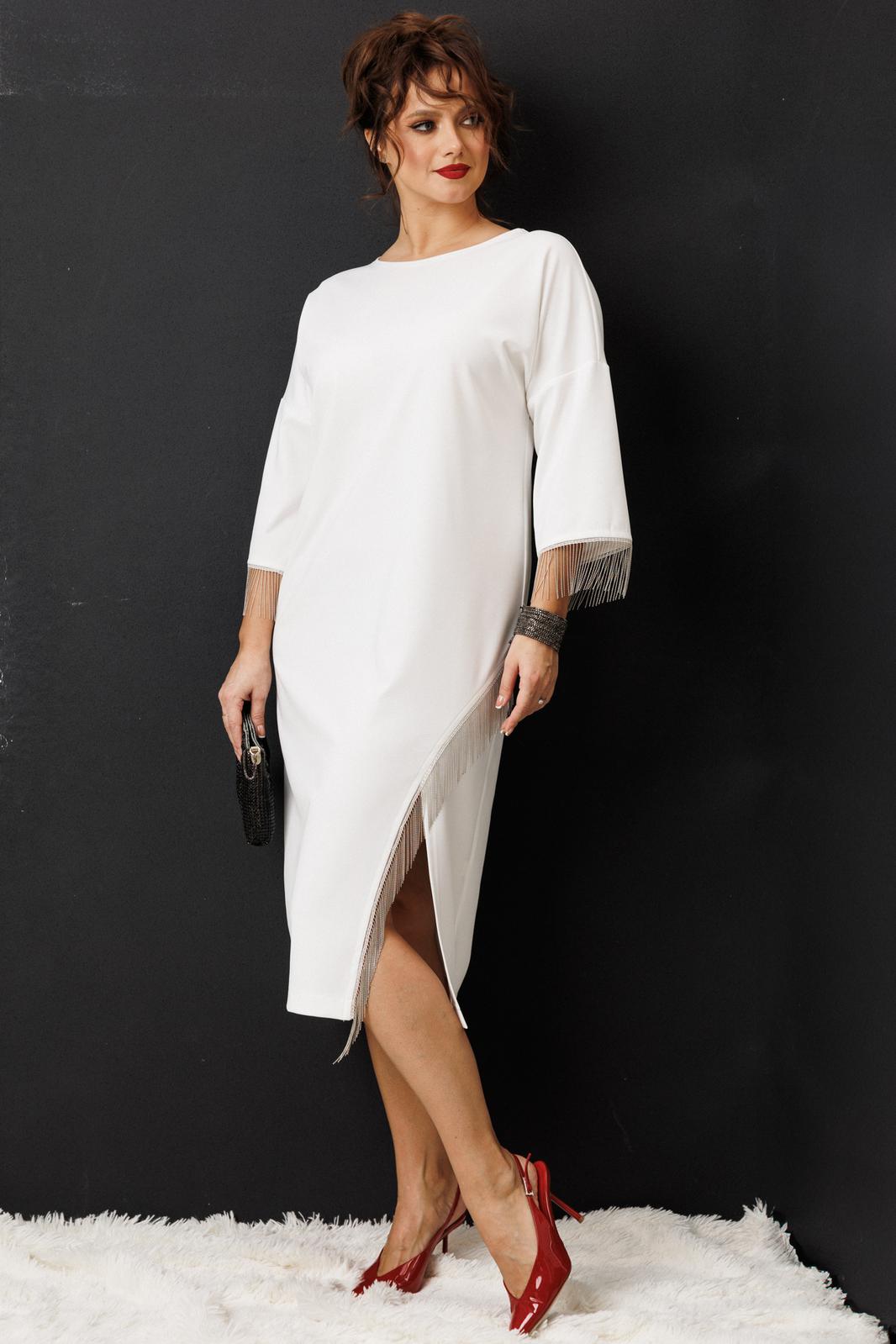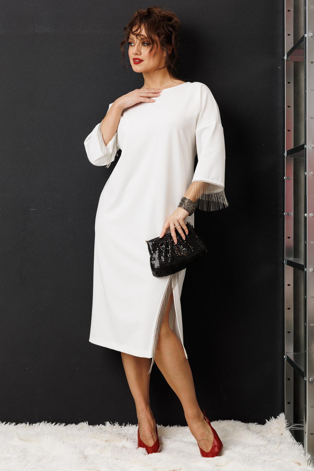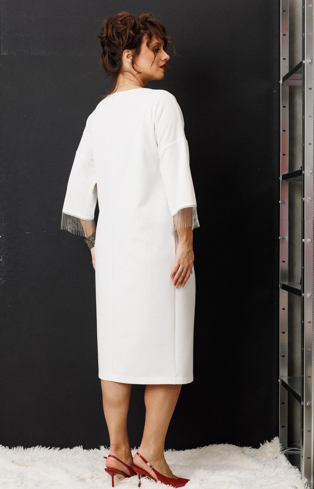 Платье миди — не просто одежда, это заявление о вашем стиле и вкусе. Элегантное праздничное платье прямного силуэта из трикотажного полотна. Ткань не мнется. Благодаря своему крою подойдёт для разных типов фигуры. Оно подчеркнёт вашу индивидуальность и станет отличным дополнением к вашему гардеробу. В нём вы будете чувствовать себя уверенно и комфортно, зная, что выглядите на все сто. Выбирая его, вы выбираете качество, комфорт и стиль. Классическое платье прямого силуэта, со спущенным плечом. По переду идет подрез с разрезом. В качестве декора по подрезу и низу рукава- металлизированная бахрома. По спинке идет средний шов. Такое платье незаменимая вещь в любом гардеробе. Длина платья по спинке (48-52) - 108см, (54-58) - 112 см. Длина рукава: (48-58) - 24 см.