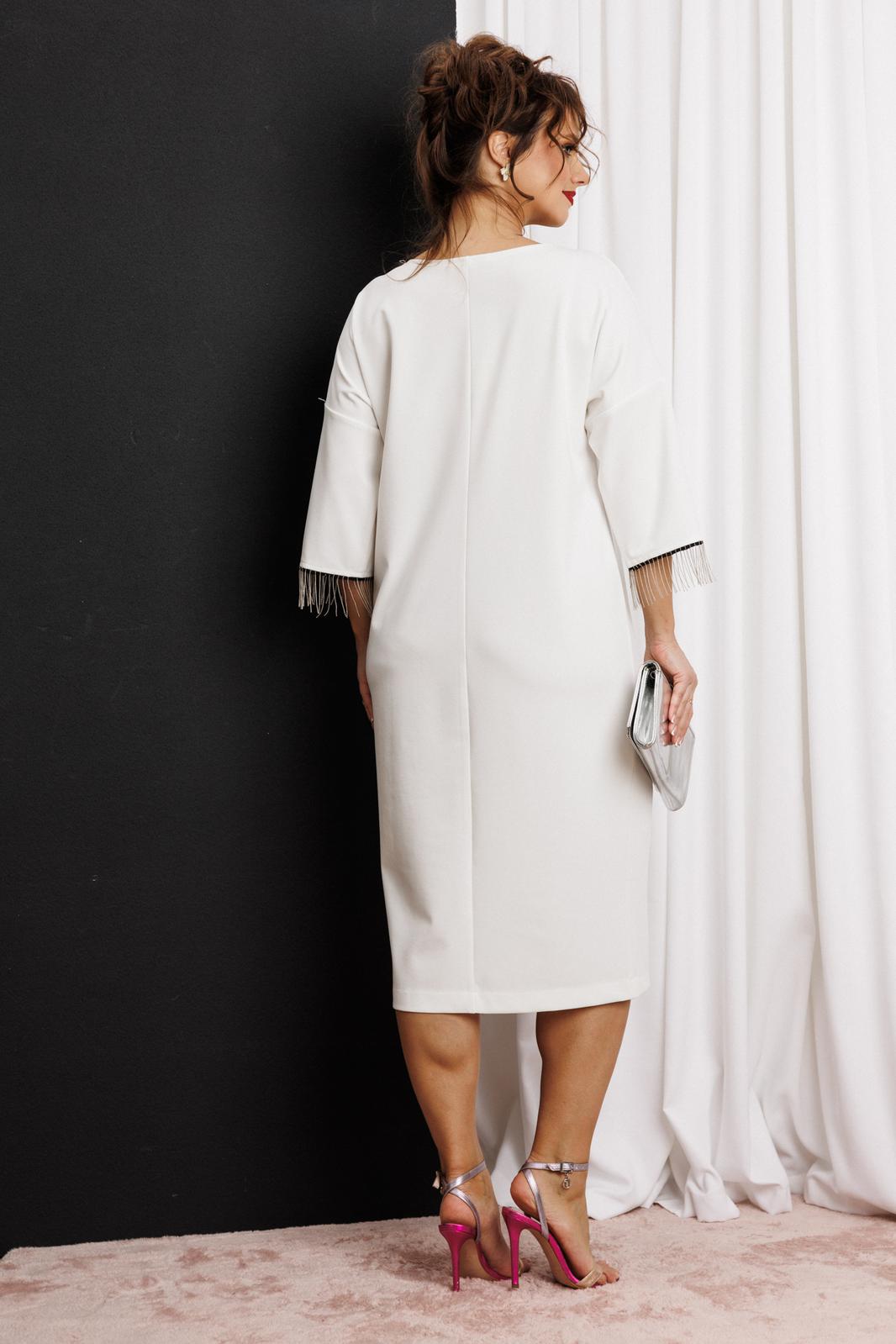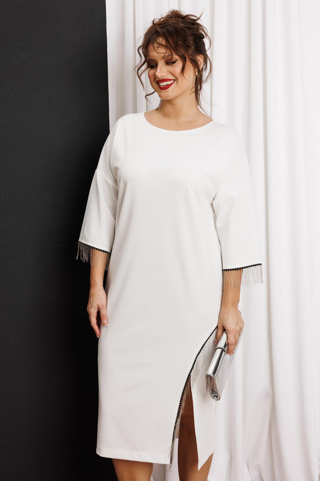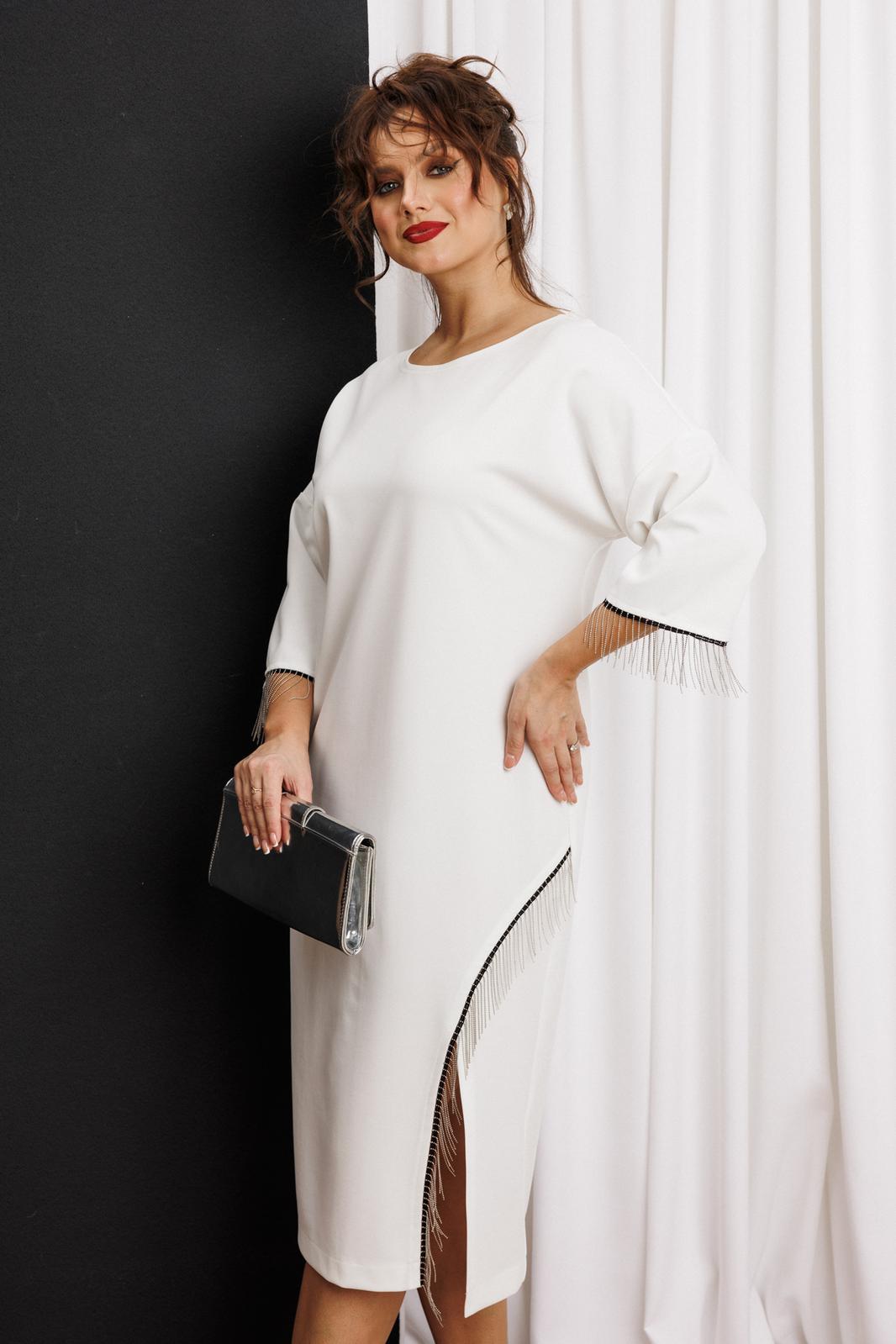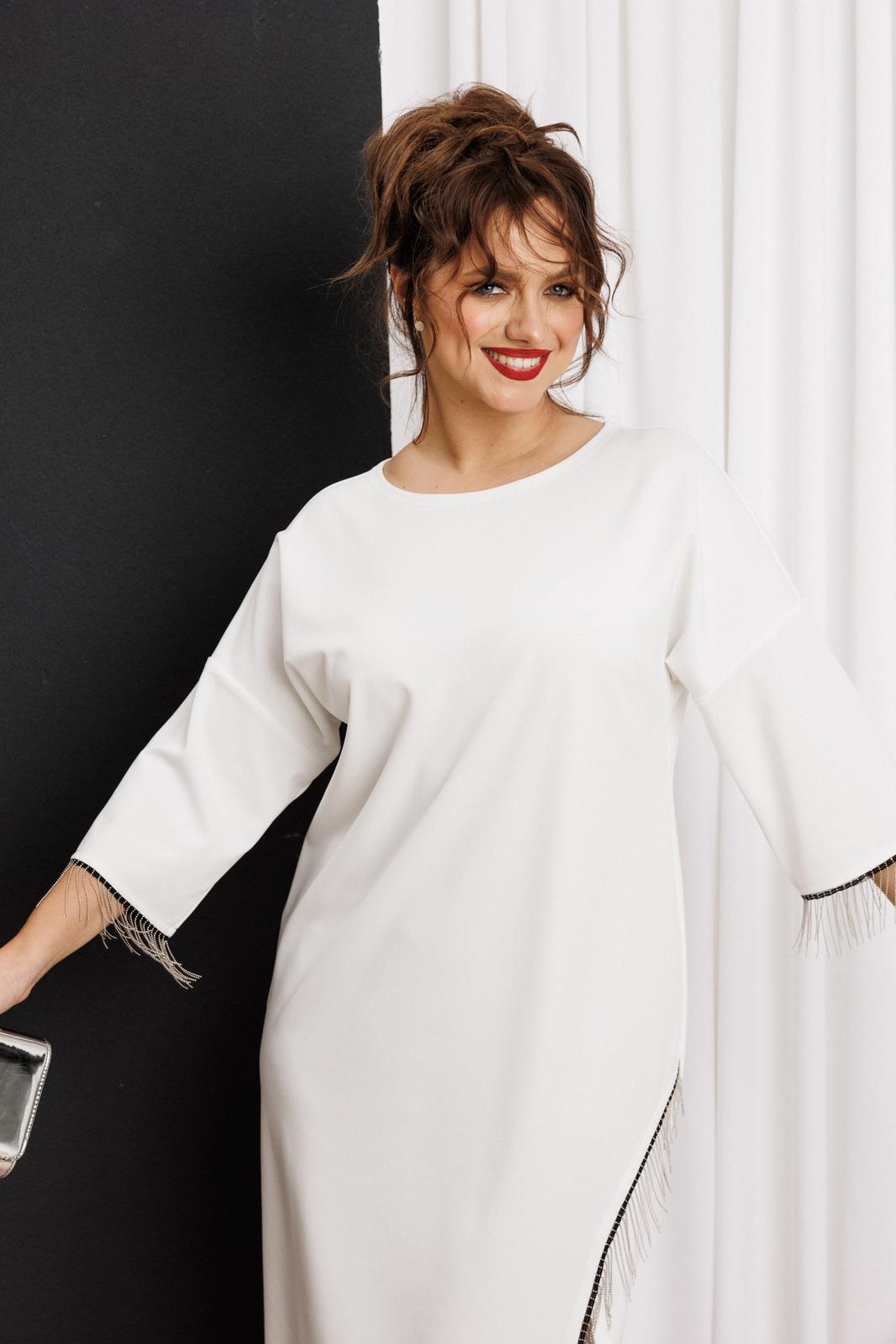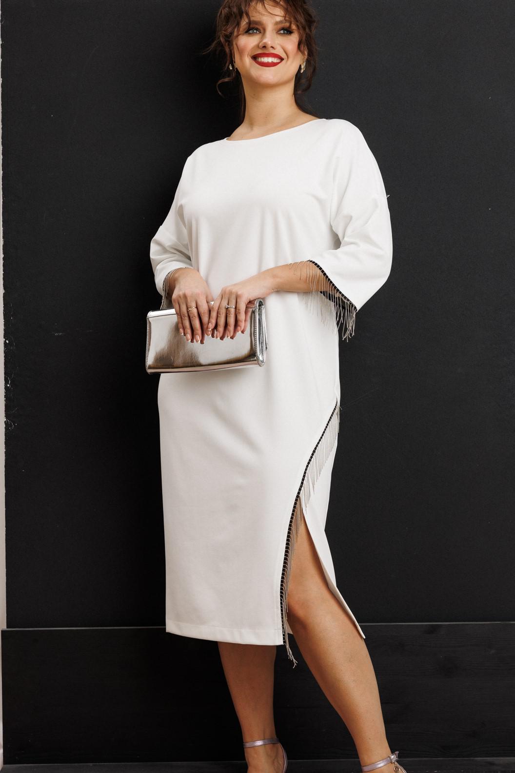Платье миди — не просто одежда, это заявление о вашем стиле и вкусе. Элегантное праздничное платье прямного силуэта из трикотажного полотна. Ткань не мнется. Благодаря своему крою подойдёт для разных типов фигуры. Оно подчеркнёт вашу индивидуальность и станет отличным дополнением к вашему гардеробу. В нём вы будете чувствовать себя уверенно и комфортно, зная, что выглядите на все сто. Выбирая его, вы выбираете качество, комфорт и стиль. Классическое платье прямого силуэта, со спущенным плечом. По переду идет подрез с разрезом. В качестве декора по подрезу и низу рукава- металлизированная бахрома. По спинке идет средний шов. Такое платье незаменимая вещь в любом гардеробе. Длина платья по спинке (48-52) - 108см, (54-58) - 112 см. Длина рукава: (48-58) - 24 см.