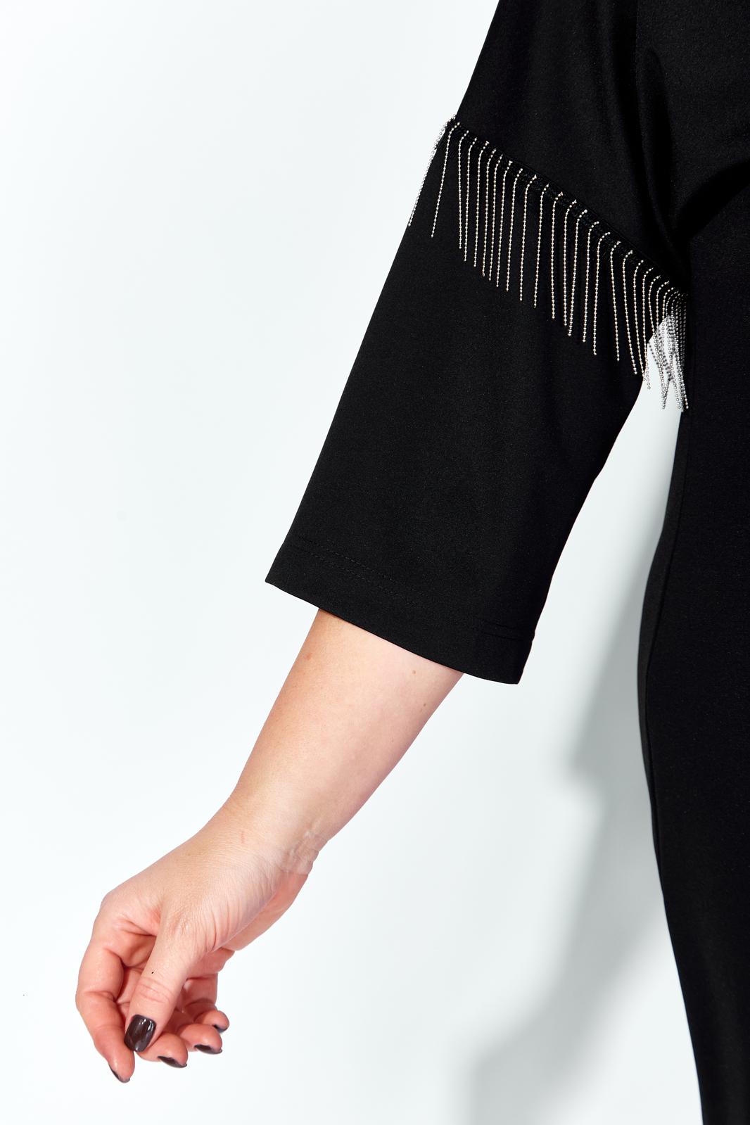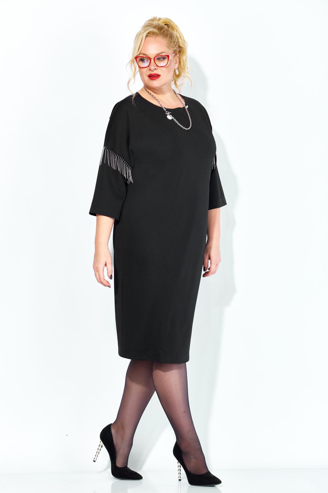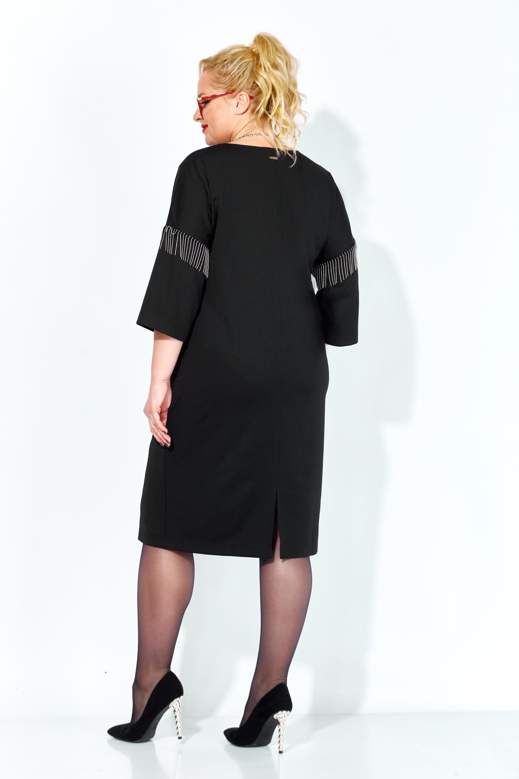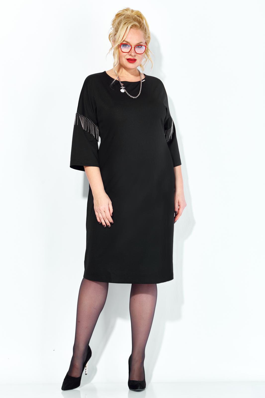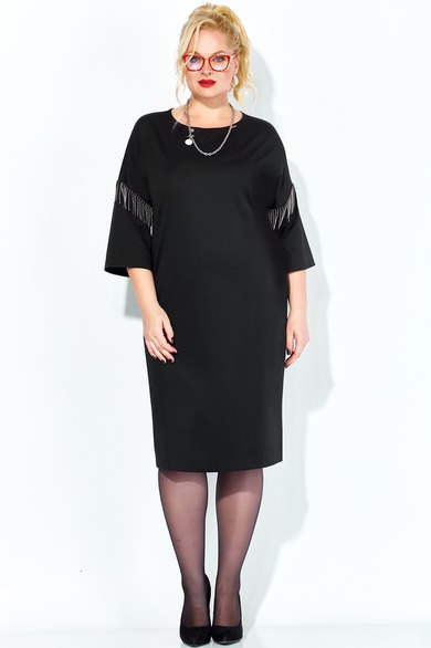 Черное платье миди — не просто одежда, это заявление о вашем стиле и вкусе. Элегантное праздничное платье прямного силуэта из трикотажного полотна. Ткань не мнется. Благодаря своему крою подойдёт для разных типов фигуры. Оно подчеркнёт вашу индивидуальность и станет отличным дополнением к вашему гардеробу. В нём вы будете чувствовать себя уверенно и комфортно, зная, что выглядите на все сто. Выбирая его, вы выбираете качество, комфорт и стиль. Классическое черное платье прямого силуэта, со спущенным плечом. Такое платье незаменимая вещь в любом гардеробе. В качестве декора металлизированная бахрома на рукавах, брендированная нашивака на горловине и спинке. По спинке идет средний шов. Такое платье незаменимая вещь в любом гардеробе. Рекомендуется носить на черное белье. Длина платья по спинке (48-52) - 100см, (54-58) - 104 см. Длина рукава: (48-58) - 26 см.