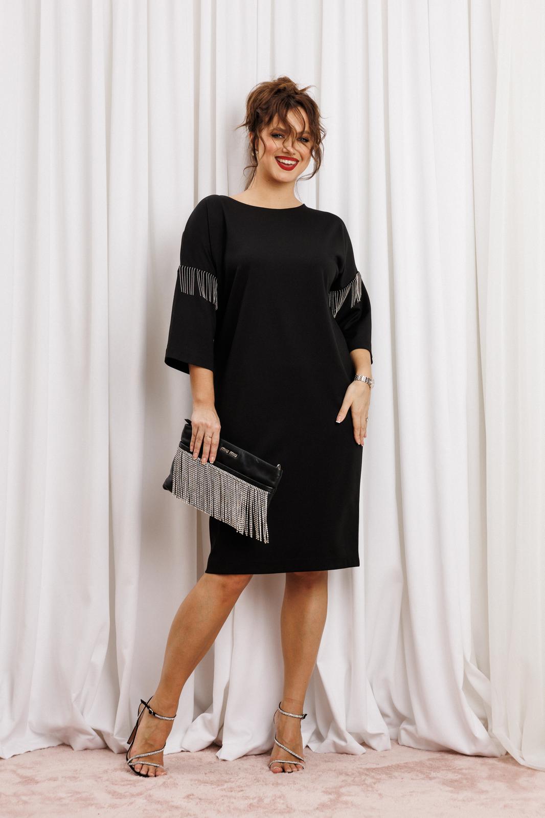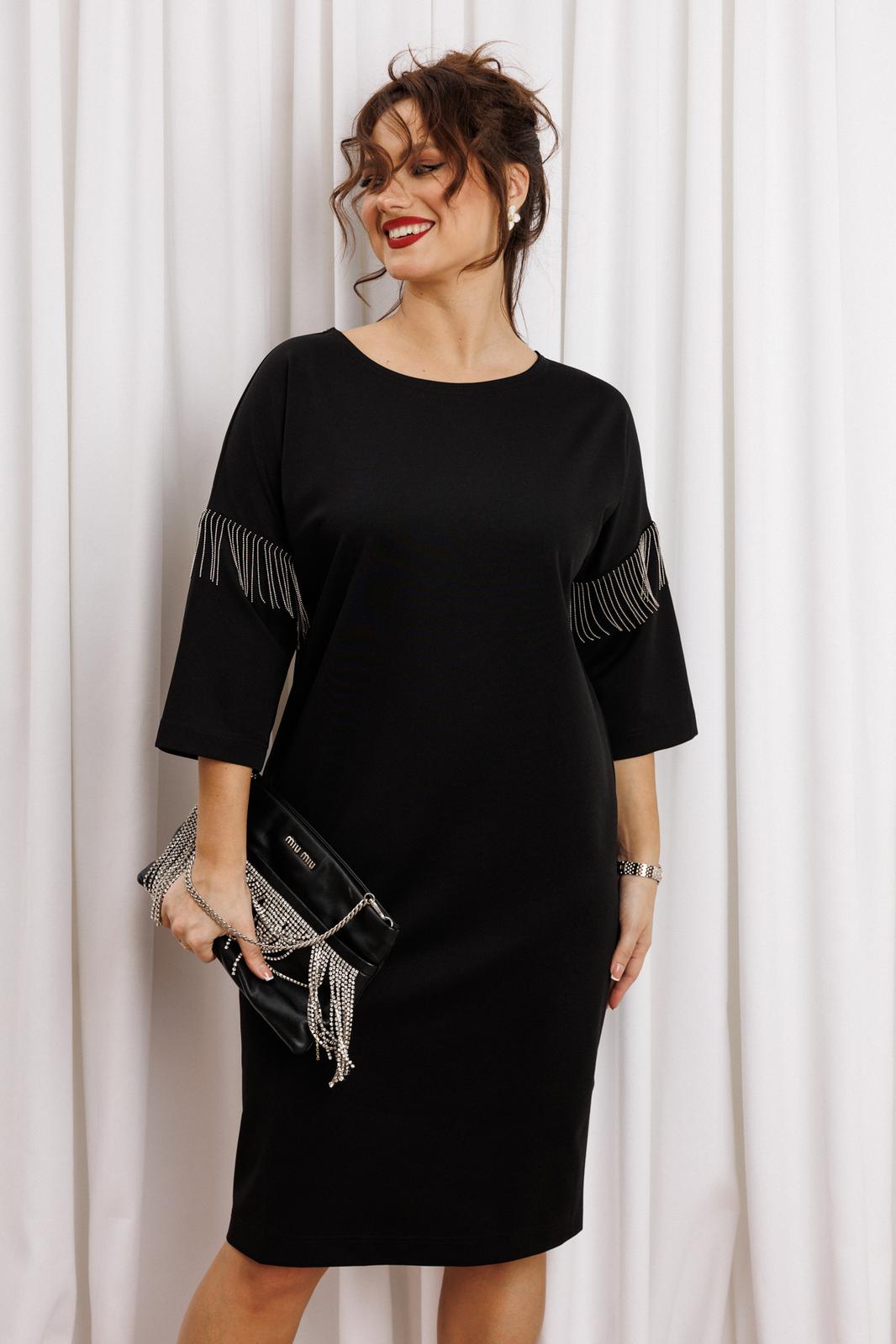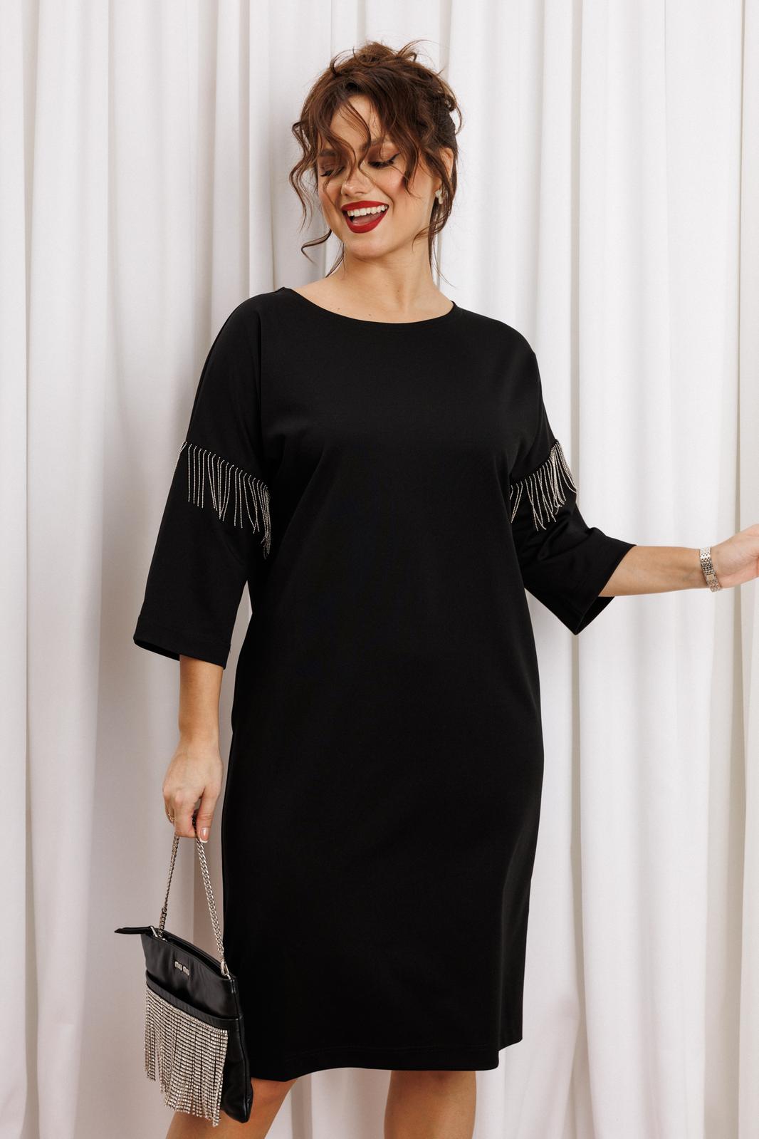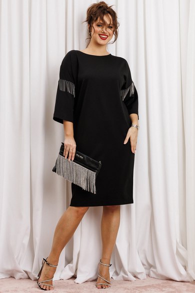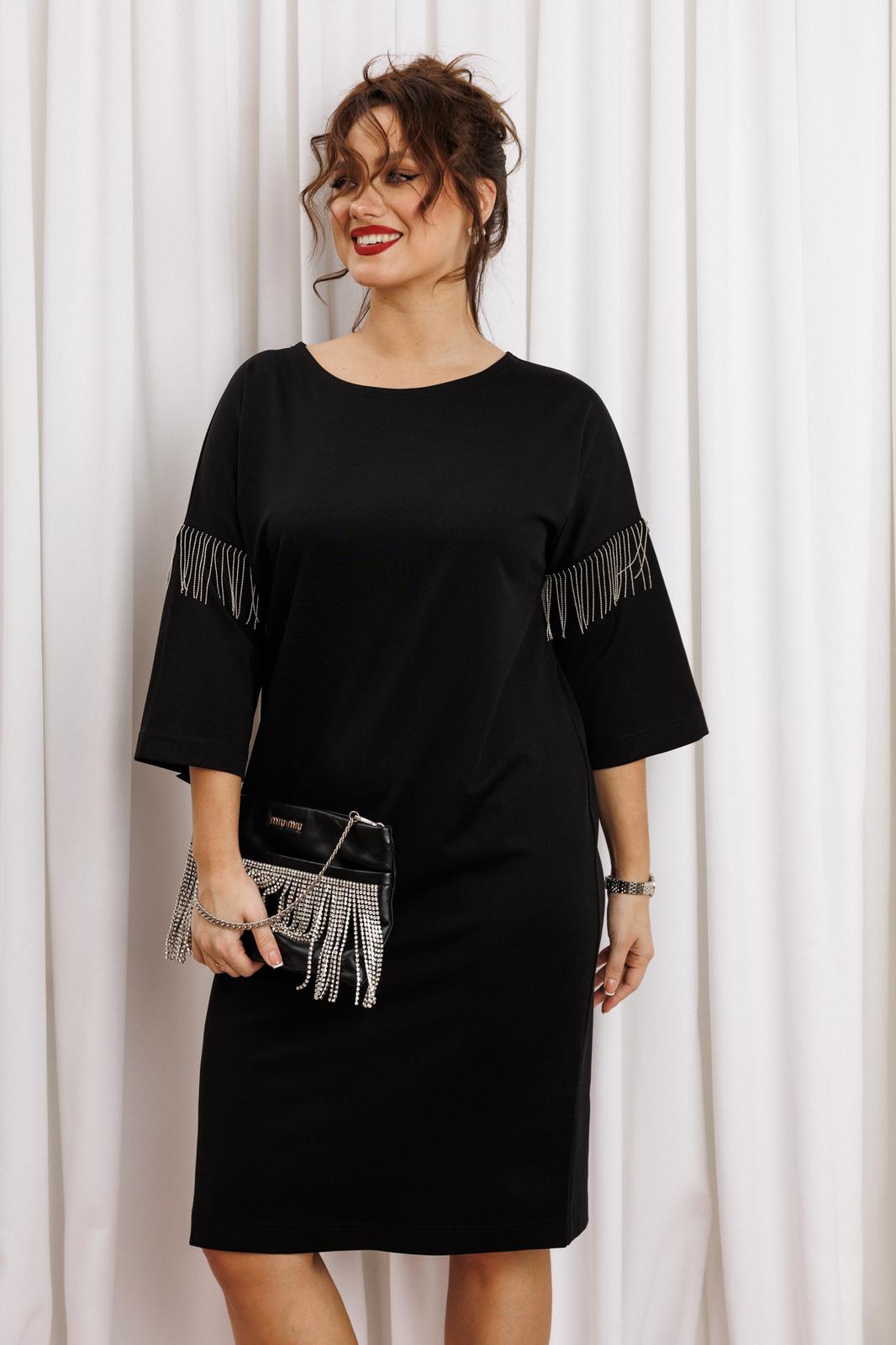 Черное платье миди — не просто одежда, это заявление о вашем стиле и вкусе. Элегантное праздничное платье прямного силуэта из трикотажного полотна. Ткань не мнется. Благодаря своему крою подойдёт для разных типов фигуры. Оно подчеркнёт вашу индивидуальность и станет отличным дополнением к вашему гардеробу. В нём вы будете чувствовать себя уверенно и комфортно, зная, что выглядите на все сто. Выбирая его, вы выбираете качество, комфорт и стиль. Классическое черное платье прямого силуэта, со спущенным плечом. Такое платье незаменимая вещь в любом гардеробе. В качестве декора металлизированная бахрома на рукавах, брендированная нашивака на горловине и спинке. По спинке идет средний шов. Такое платье незаменимая вещь в любом гардеробе. Рекомендуется носить на черное белье. Длина платья по спинке (48-52) - 100см, (54-58) - 104 см. Длина рукава: (48-58) - 26 см.