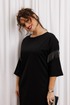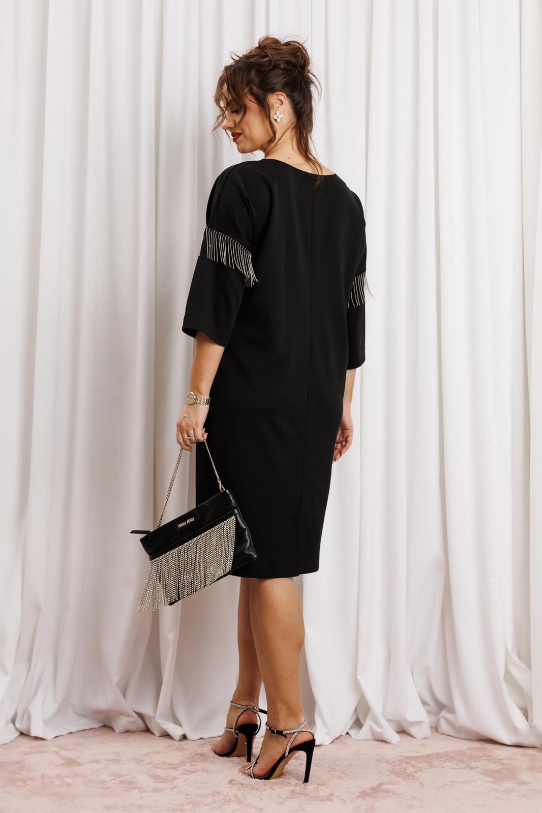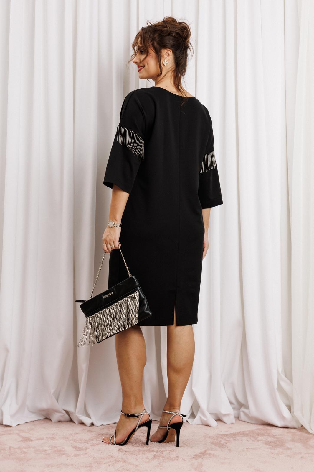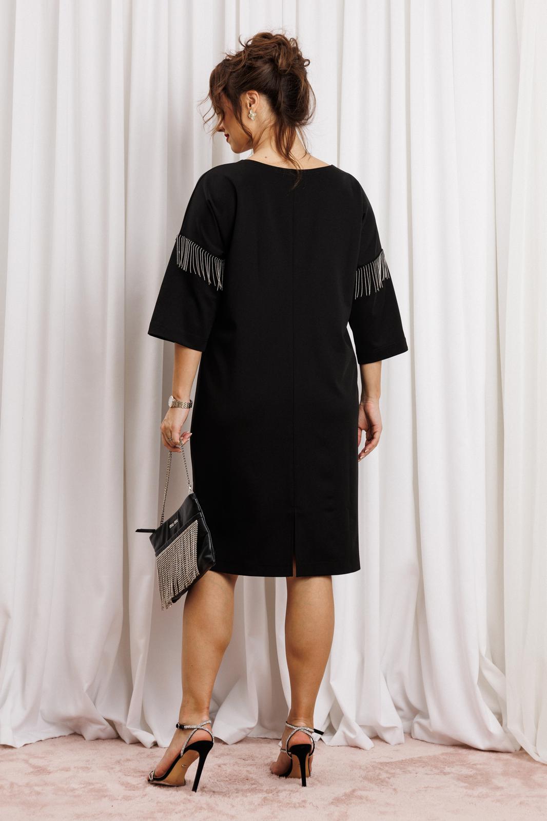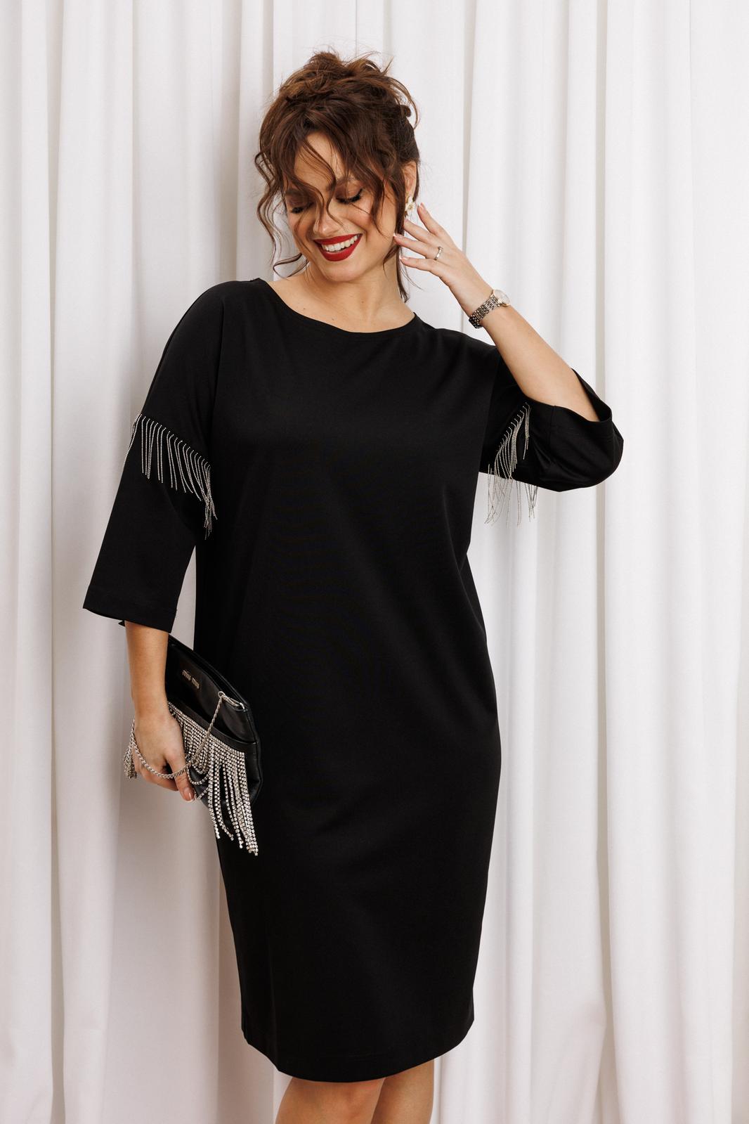 Черное платье миди — не просто одежда, это заявление о вашем стиле и вкусе. Элегантное праздничное платье прямного силуэта из трикотажного полотна. Ткань не мнется. Благодаря своему крою подойдёт для разных типов фигуры. Оно подчеркнёт вашу индивидуальность и станет отличным дополнением к вашему гардеробу. В нём вы будете чувствовать себя уверенно и комфортно, зная, что выглядите на все сто. Выбирая его, вы выбираете качество, комфорт и стиль. Классическое черное платье прямого силуэта, со спущенным плечом. Такое платье незаменимая вещь в любом гардеробе. В качестве декора металлизированная бахрома на рукавах, брендированная нашивака на горловине и спинке. По спинке идет средний шов. Такое платье незаменимая вещь в любом гардеробе. Рекомендуется носить на черное белье. Длина платья по спинке (48-52) - 100см, (54-58) - 104 см. Длина рукава: (48-58) - 26 см.