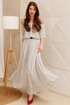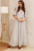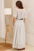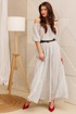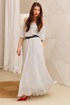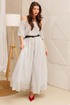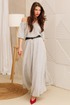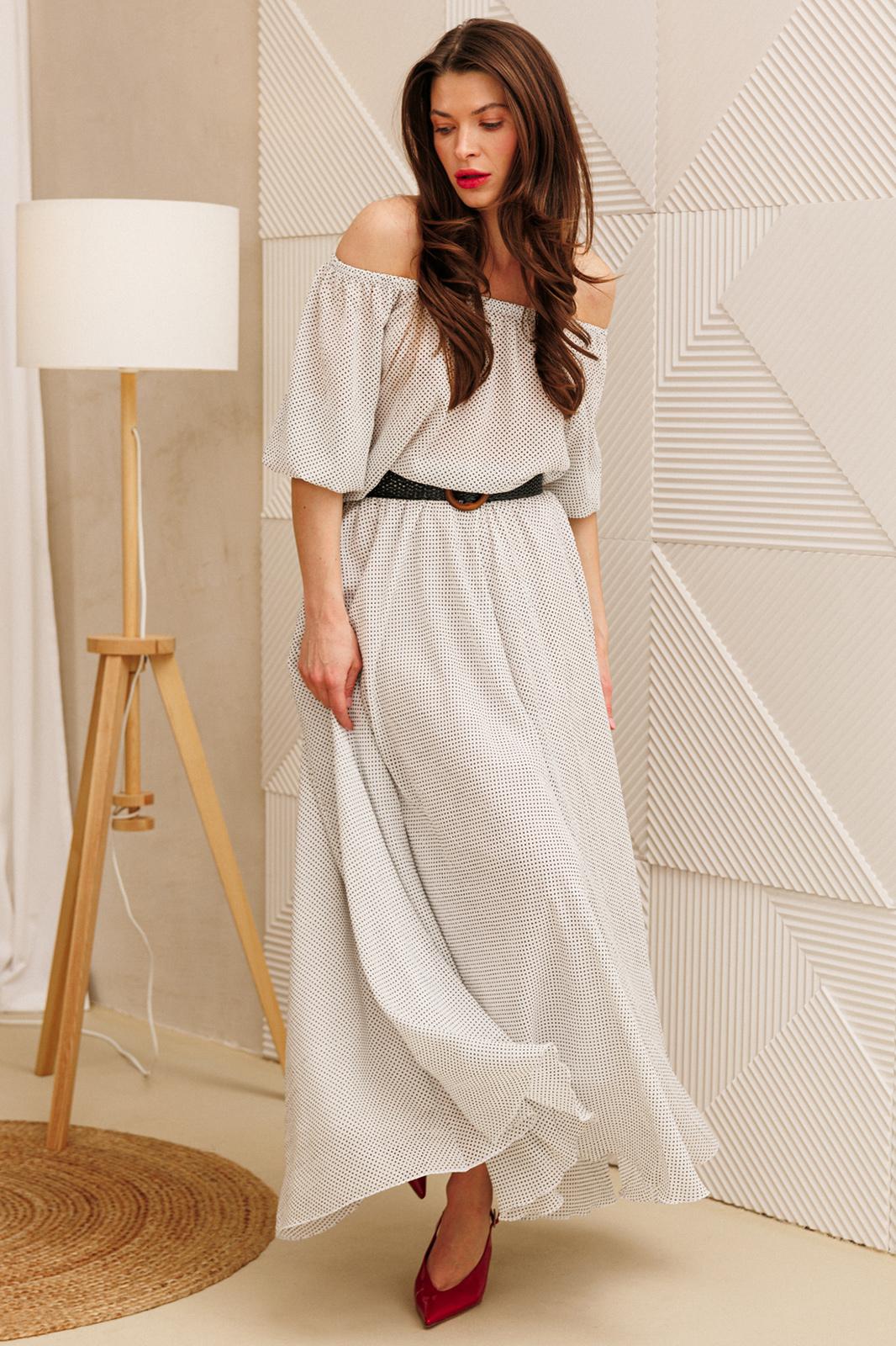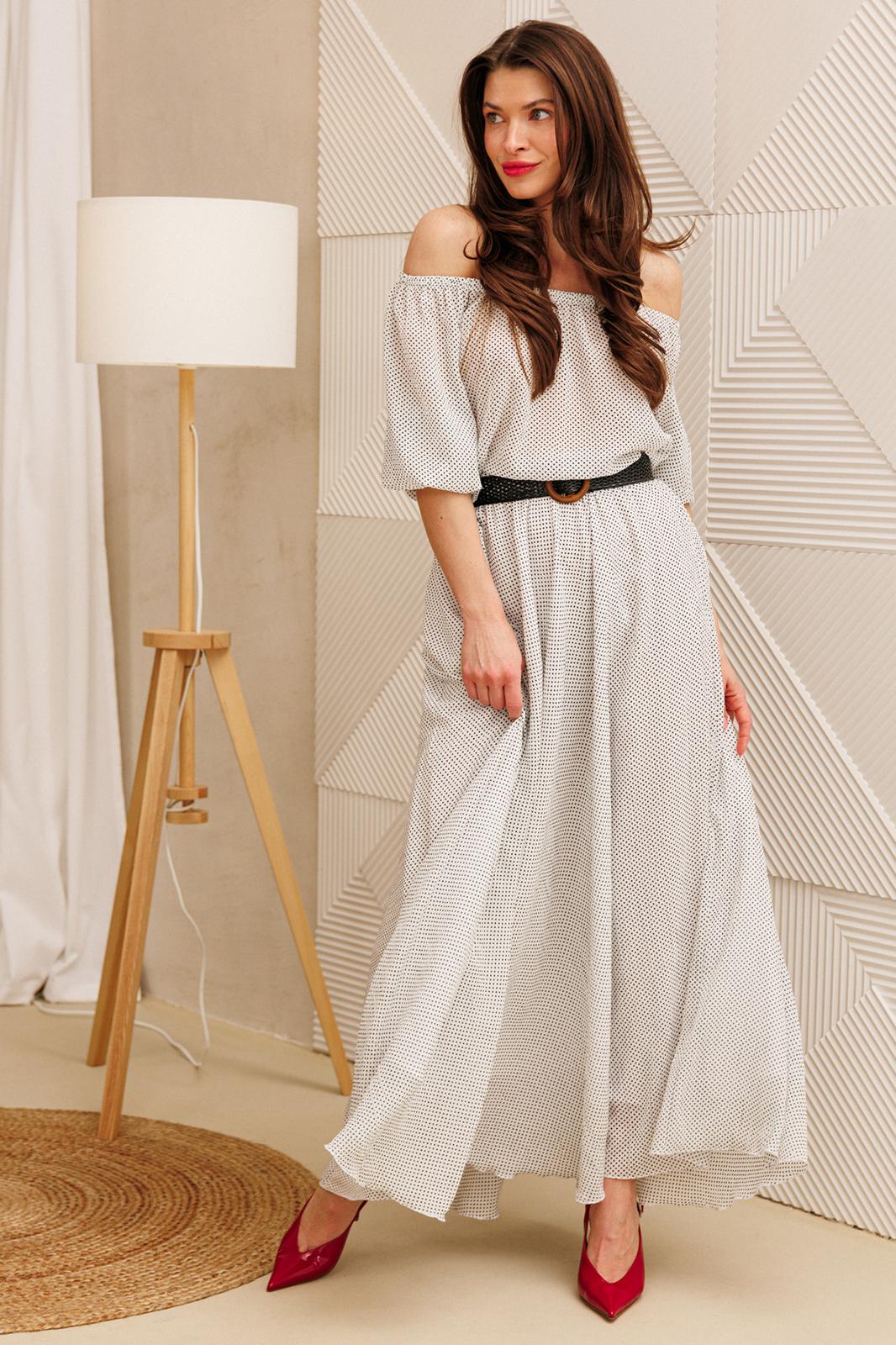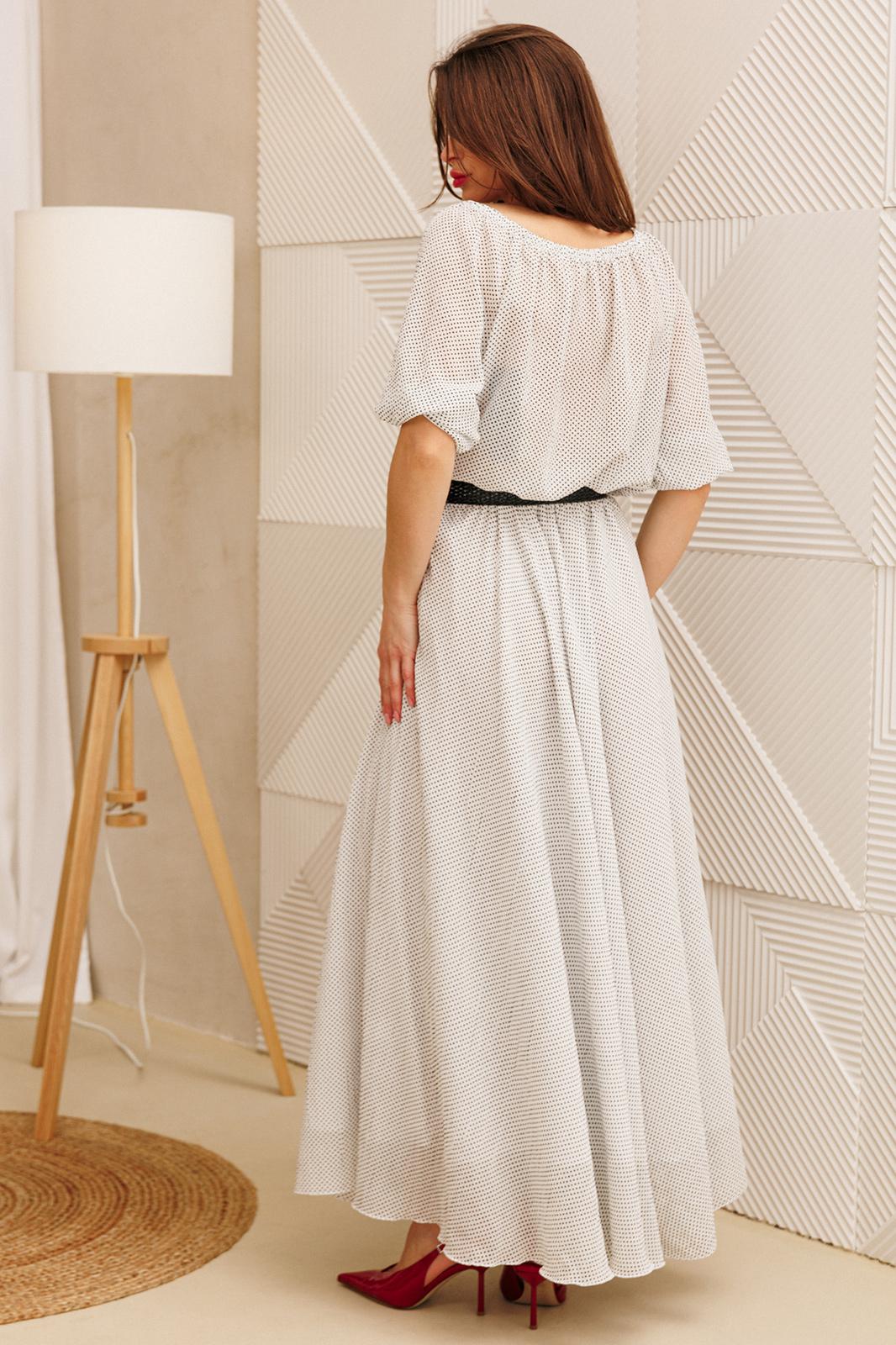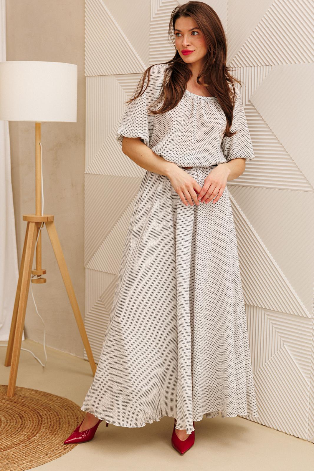 Платье макси из жатого шифона в горошек свободного силуэта - лучший выбор на лето. Рукав реглан 3/4 длины, низ на резинке. Горловина собрана на резинку. Платье отрезное по линии талии, на резинке. Юбка полусолнце на хлопковой подкладке. В комплект входит съемный пояс. Длина юбки: 93см . Длина рукава: 43см. Длина спинки: 42см.