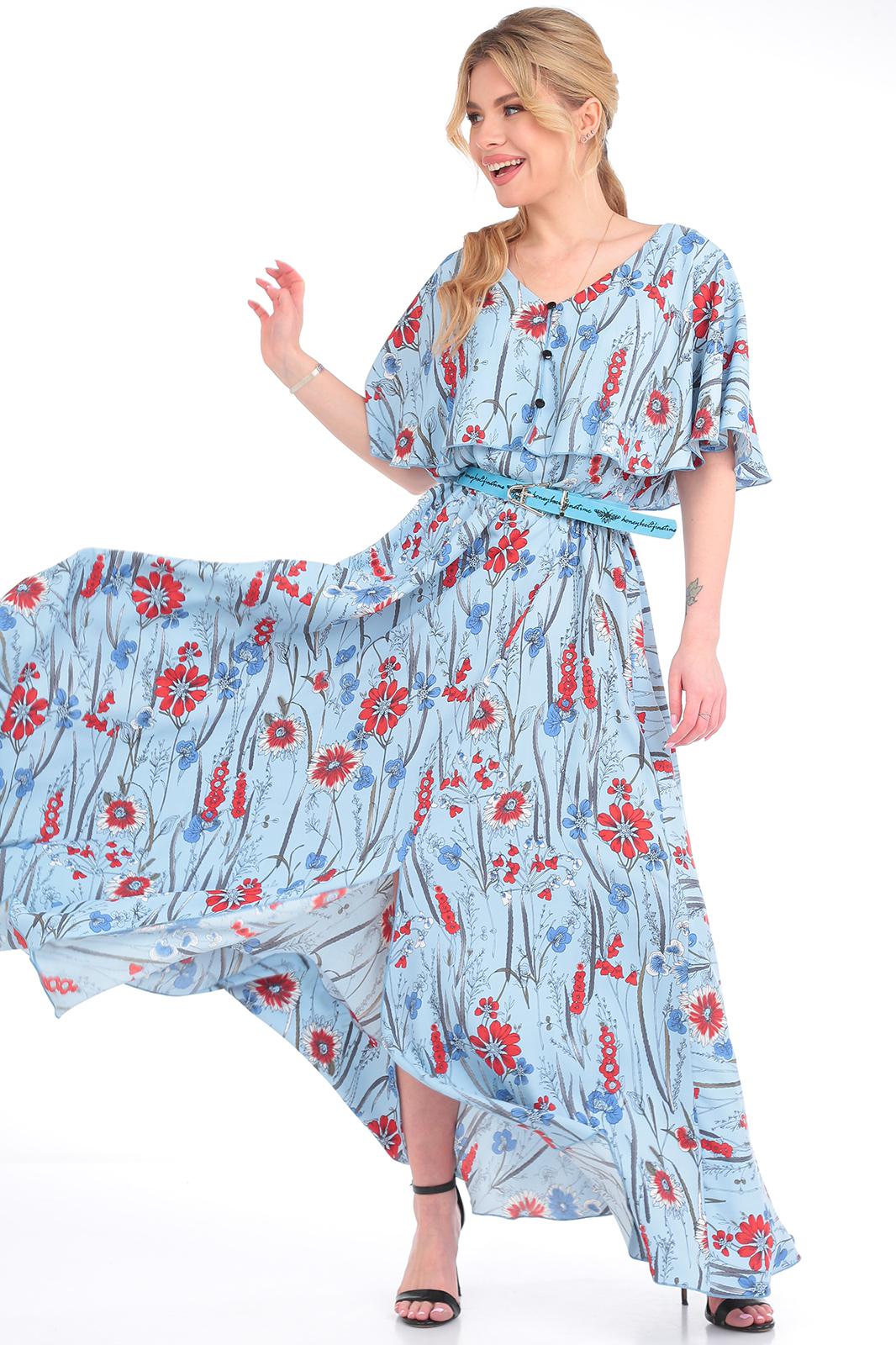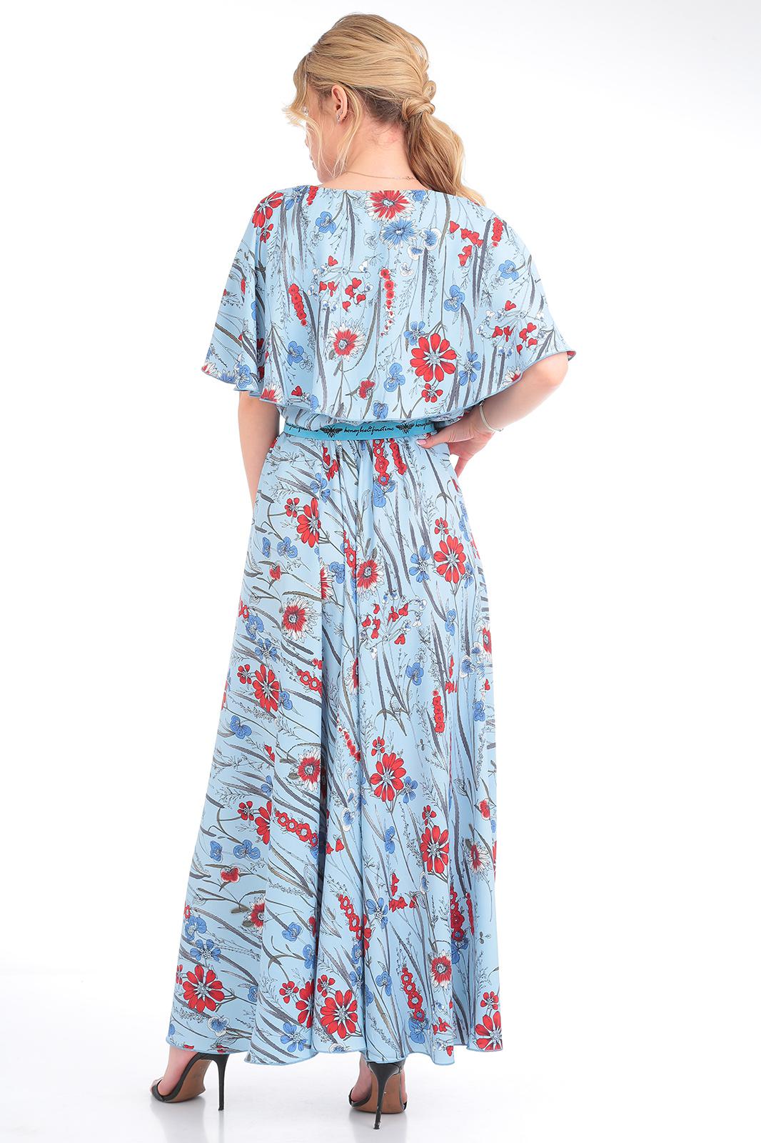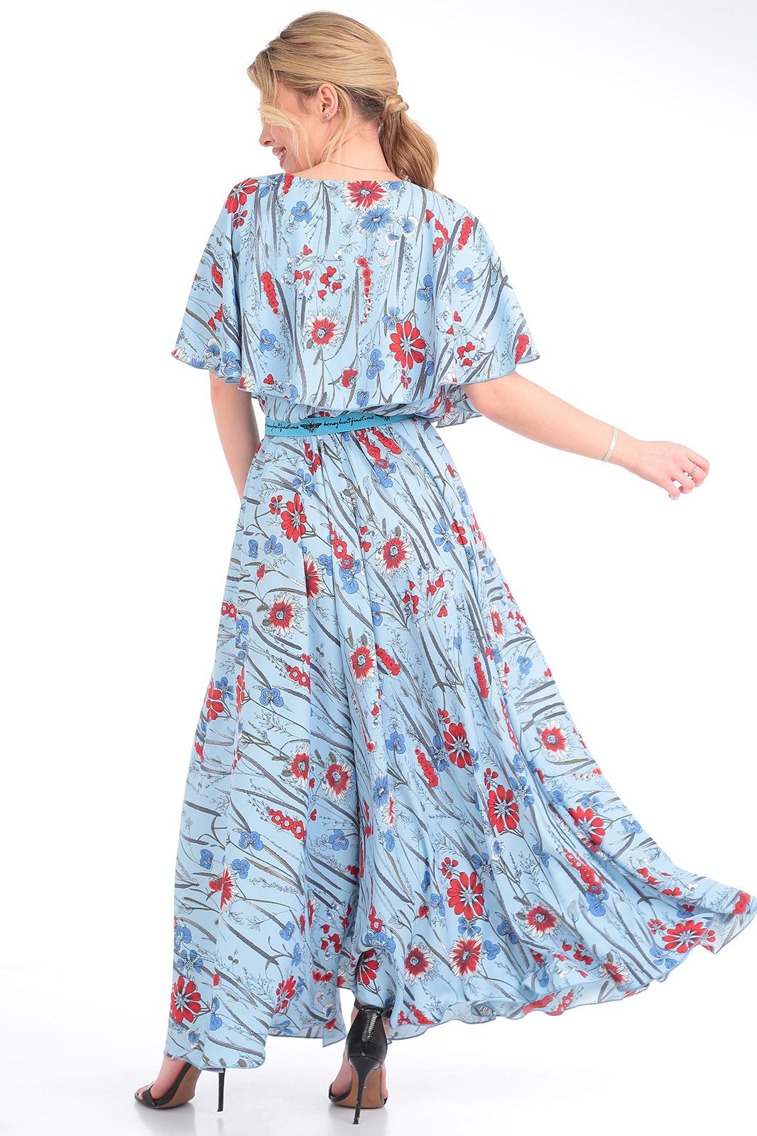 Платье женское из текстильной ткани, отрезное по линии талии , на резинке. Юбка фасона солнце, по полочке идет по линии колена разрез. В верхней части платья идет отлетная кокетка по спинке и полочке в виде пелерины, по кокетке идет отделка в виде пуговиц, вырез V-образной формы. К платью идет съемный пояс. Длина юбки:-100см. Длина кокетки (от горловины)-37см. Длина спинки:-45см.