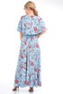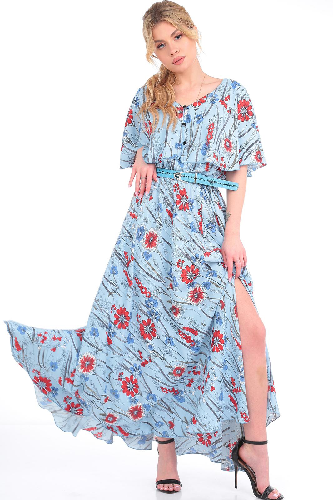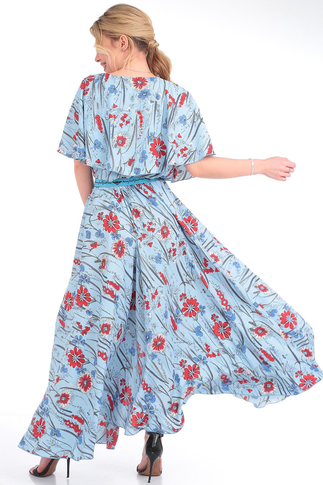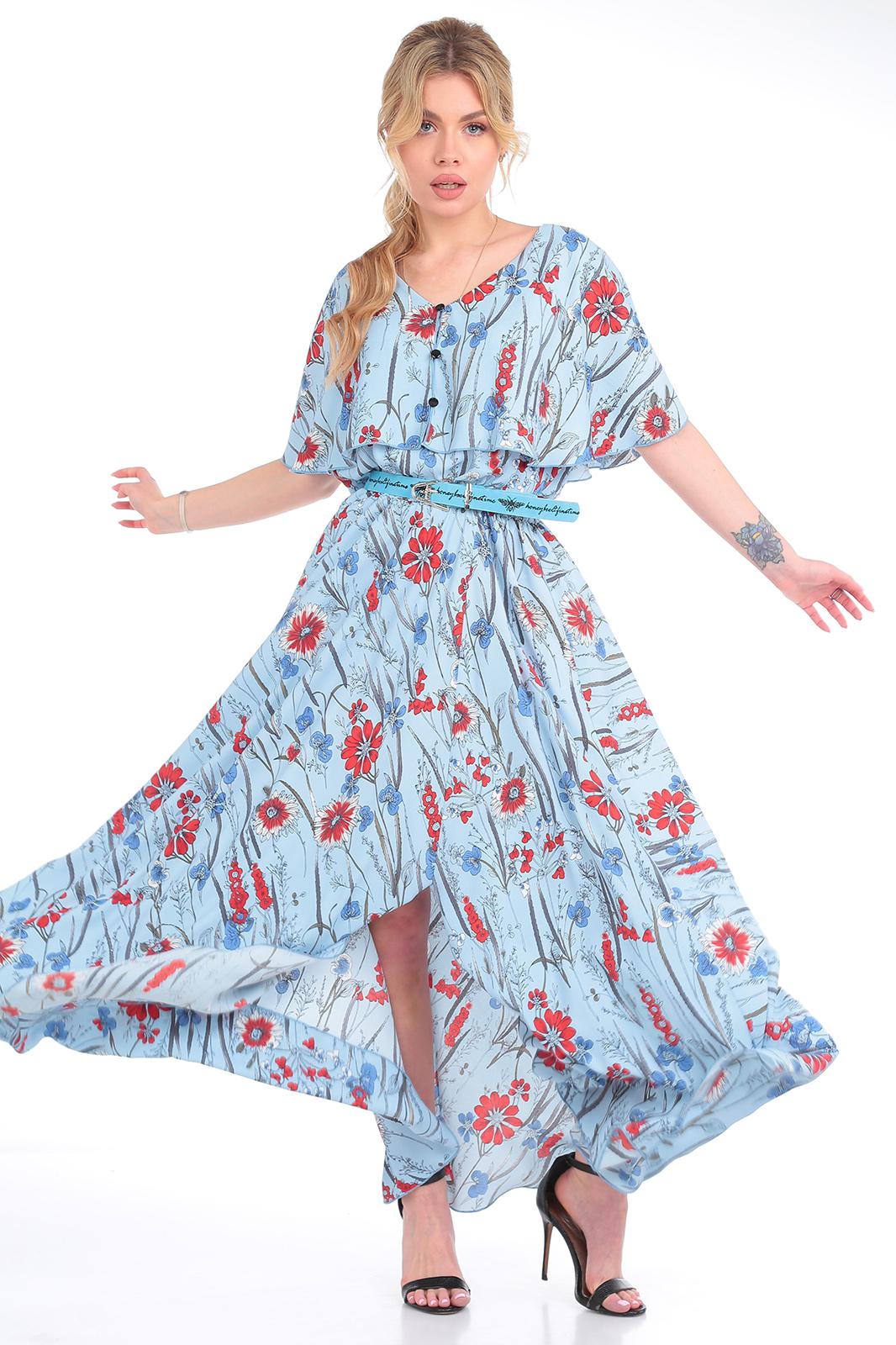 Платье женское из текстильной ткани, отрезное по линии талии , на резинке. Юбка фасона солнце, по полочке идет по линии колена разрез. В верхней части платья идет отлетная кокетка по спинке и полочке в виде пелерины, по кокетке идет отделка в виде пуговиц, вырез V-образной формы. К платью идет съемный пояс. Длина юбки:-100см. Длина кокетки (от горловины)-37см. Длина спинки:-45см.