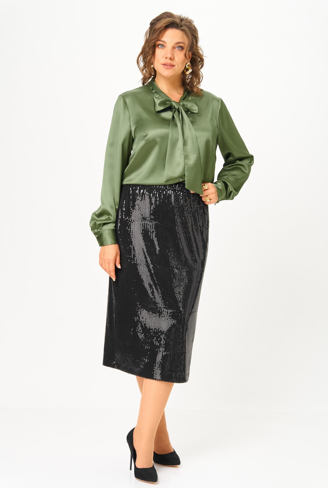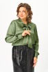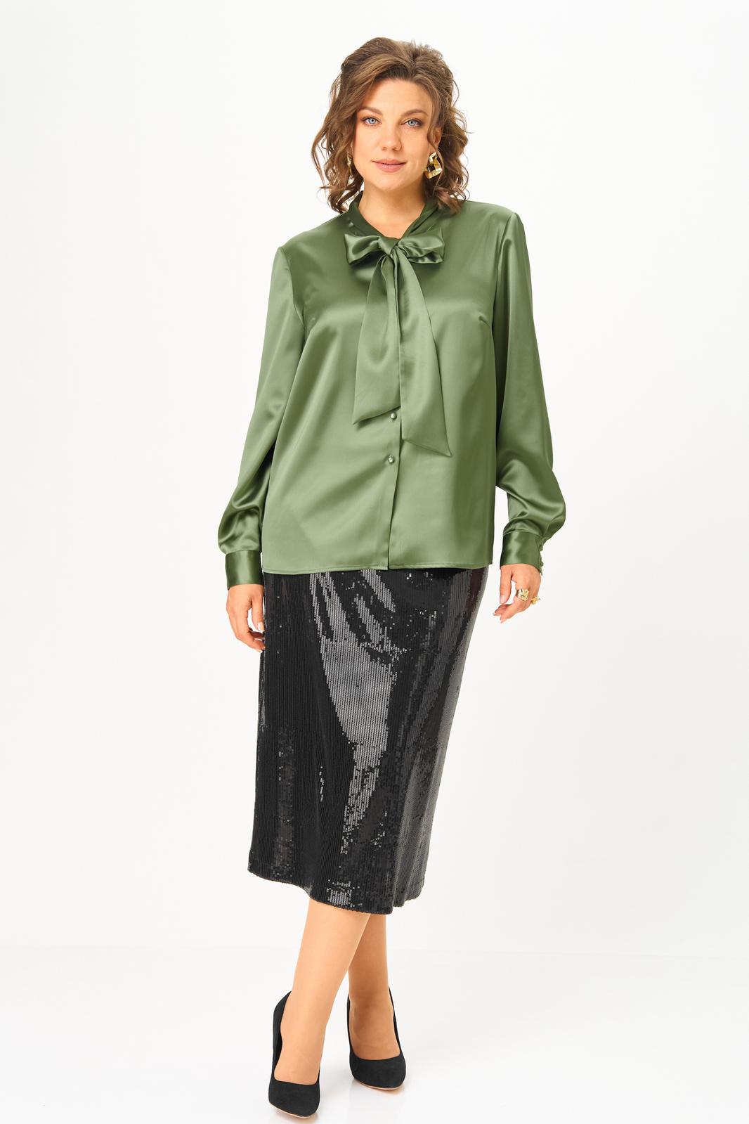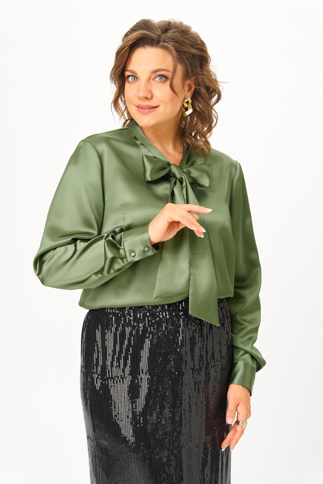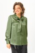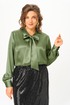 Оливковая женская блузка-рубашка из лёгкой атласной ткани с изысканным бантом над вырезом представляет собой гармоничное сочетание деловой элегантности и романтичного шарма. Прямой свободный силуэт обеспечивает комфорт в течение всего дня, сохраняя при этом аккуратный и утончённый вид. Треугольный вырез с изящными завязками, превращающимися в модный бант на груди, добавляет образу ноту женственности, делая его одновременно строгим и нежным. Длинный рукав с элегантной манжетой на пуговице позволяет регулировать посадку. Лёгкий тонкий атлас добавляет луку воздушности, сохраняя при этом необходимую для офиса сдержанность. Особенностью этой модели является её универсальность - представленная в больших размерах, она подчёркивает достоинства фигуры разного типа. Блузка-рубашка одинаково хорошо смотрится как в строгом деловом ансамбле, так и в более романтичных повседневных, праздничных и стильных образах.