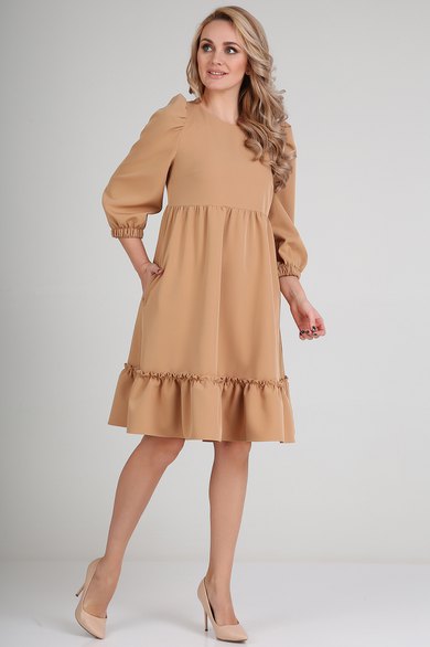Платье женское. Модное платье силуэта - бэбидолл. Такой силуэт достигается подрезом по лифу выше линии талии, и присборенной юбкой. Выполнено из костюмной ткани. Рукав втачной, со сборкой по окату. Длина рукава 3/4, внизу собран на резинке. Внизу платья широкая рюша. Застежка на потайную молнию в среднем шве спинки. Платье с карманами в боковых швах.