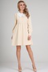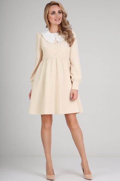 Платье женское. Милое платье свободного силуэта - бэбидолл. Такой силуэт достигается подрезом по лифу выше линии талии, и присборенной юбкой. Выполнено из костюмной ткани. Спереди отрезные наклонные кокетки. От кокеток сборка. Застежка на цельнокроеную планку с петлями и пуговицами. Горловина округлая, на обтачке. Рукав втачной, широкий, со сборкой по окату. Длинный, присборенный на манжет. Манжет широкий, на две пуговицы. Платье с карманами в боковых швах. В комплекте с платьем съемный воротник из хлопка, с рюшей по краю воротника.