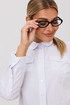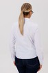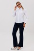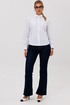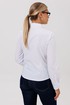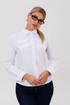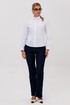 Воротник сорочечного типа и застежка на пуговицы, оформленная притачными планками с декоративной отделкой, подчеркивают классический стиль. Длинные рукава завершаются манжетами, а прорежка на них выделена сложной технологической обработкой с использованием отделочной детали.