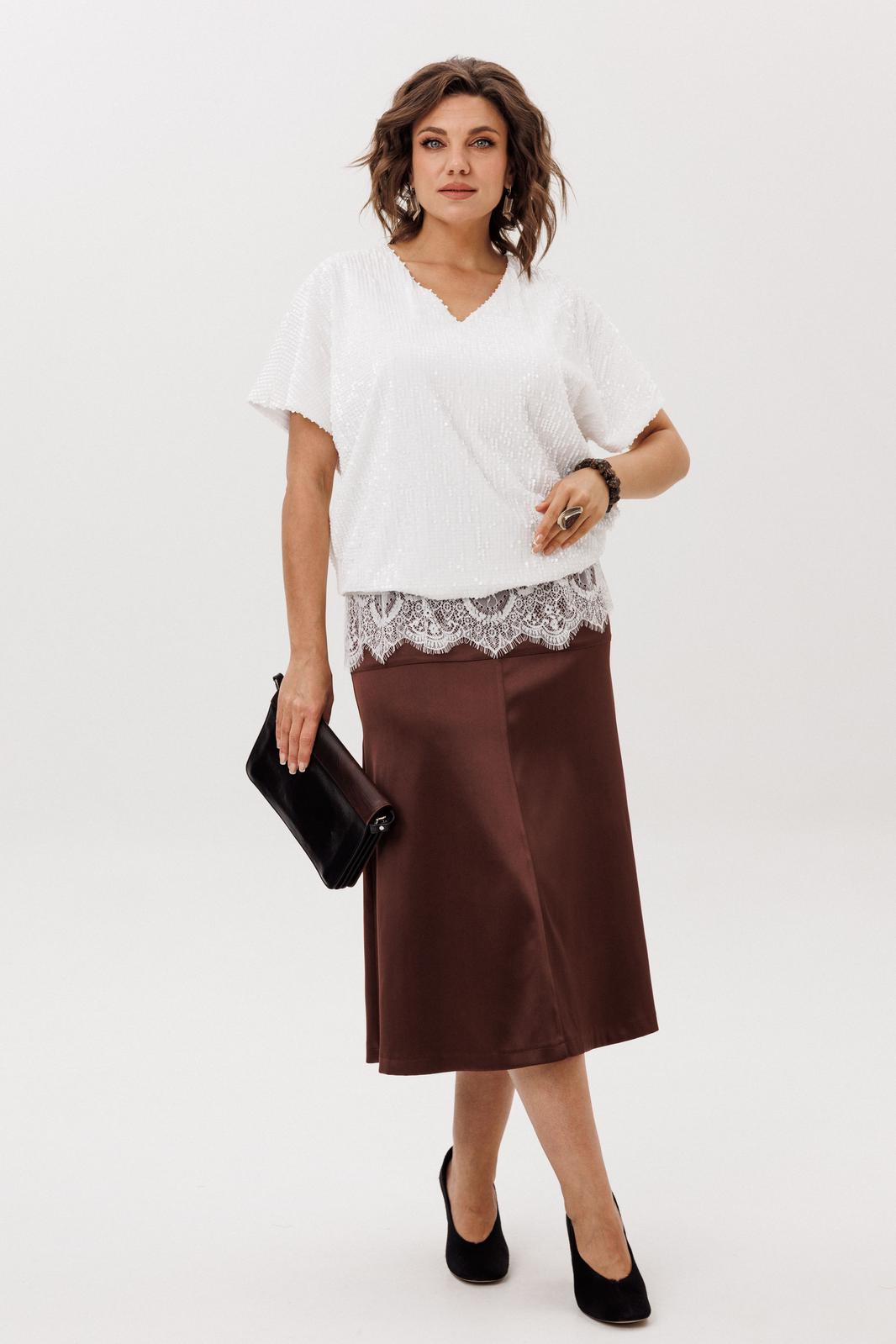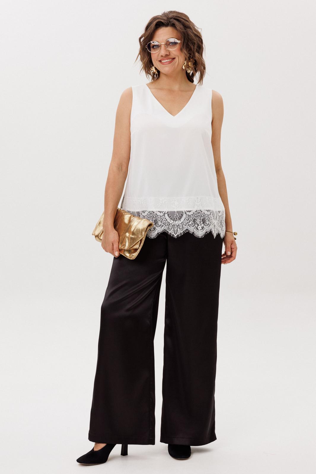 На модели в топе цвета «кристаллики льда» атласные брюки 1737, юбка 1510, блузон в пайетки 1522 и жакет 1661.