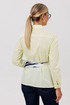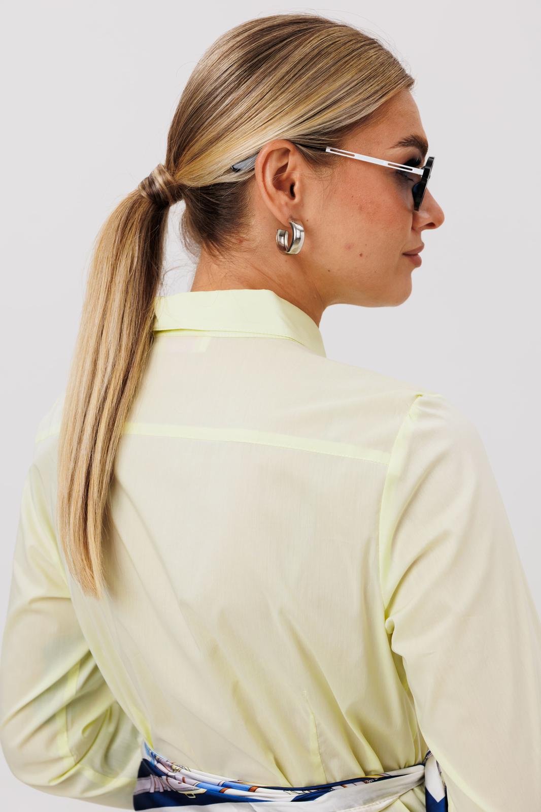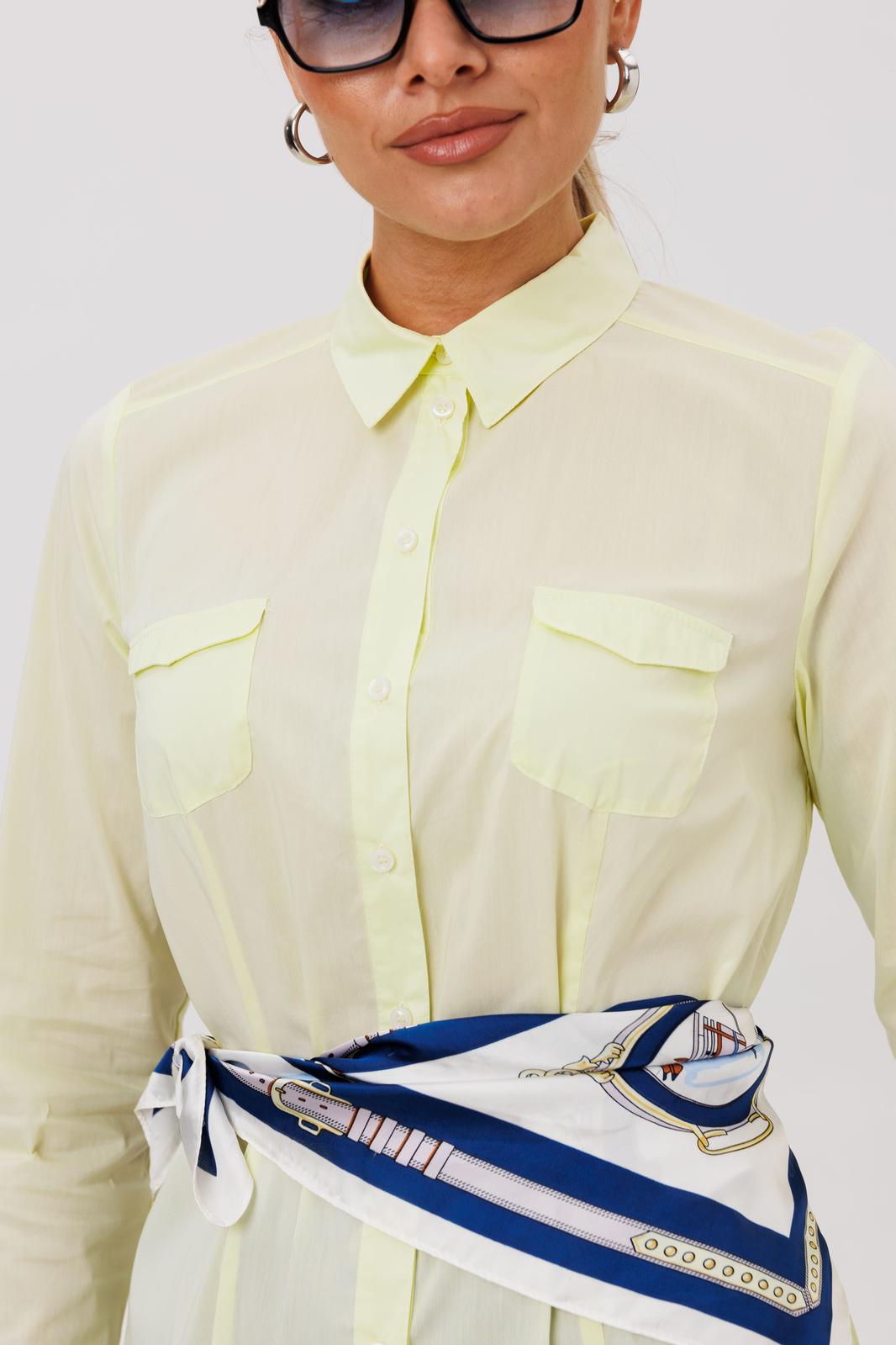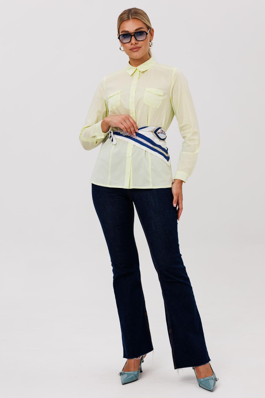 Блузка застегивается на пуговицы по цельнокроеной планке и завершается воротником на стойке. Рукава являются втачными и заканчиваются манжетами с застежкой на пуговицу, что позволяет регулировать их ширину с помощью специальной паты. Эта модель станет универсальным элементом гардероба, подходящим для повседневной носки, учебы или соблюдения дресс-кода.