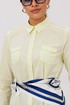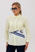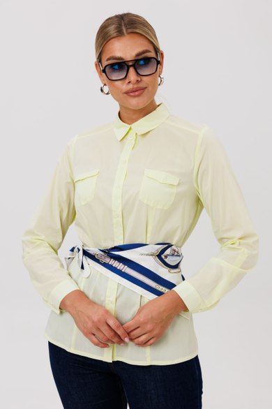Классическая блуза отличается строгим и лаконичным дизайном. Ее передняя часть оформлена нагрудными вытачками, идущими от низа, и дополнена накладными карманами с закругленными краями. Спинка модели имеет талевые вытачки и цельнокроеную кокетку, которая плавно переходит на полочку, обеспечивая идеальную посадку по фигуре.
