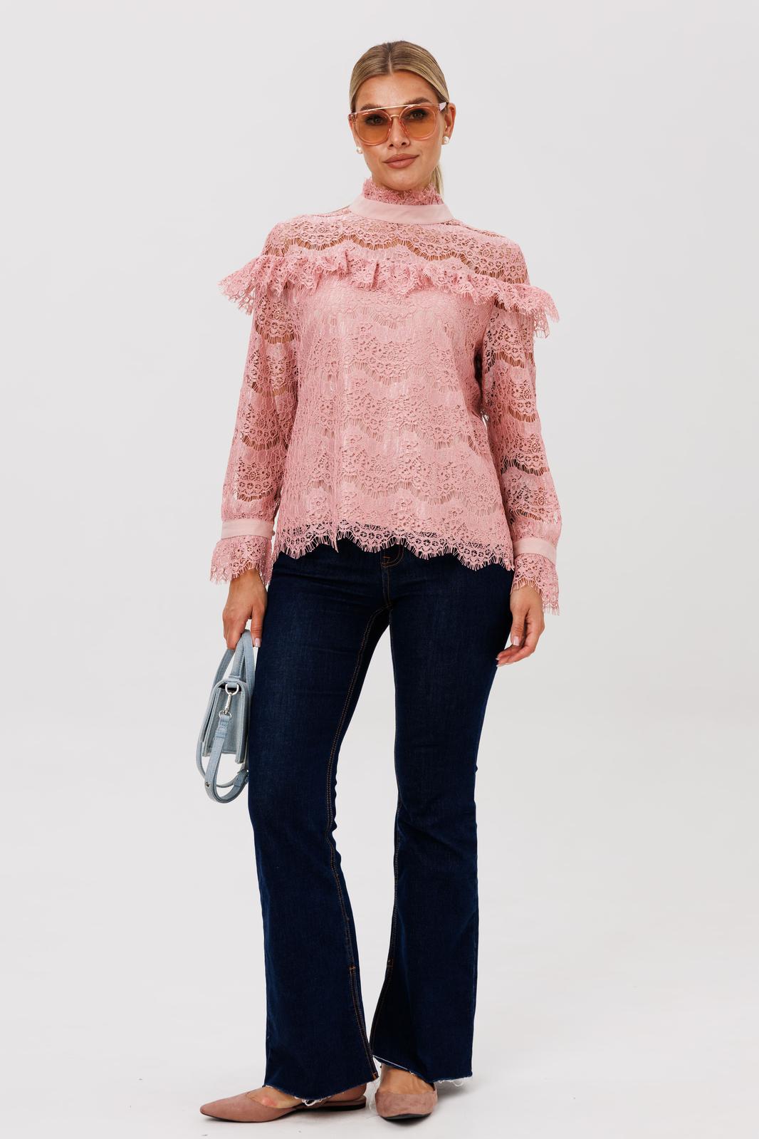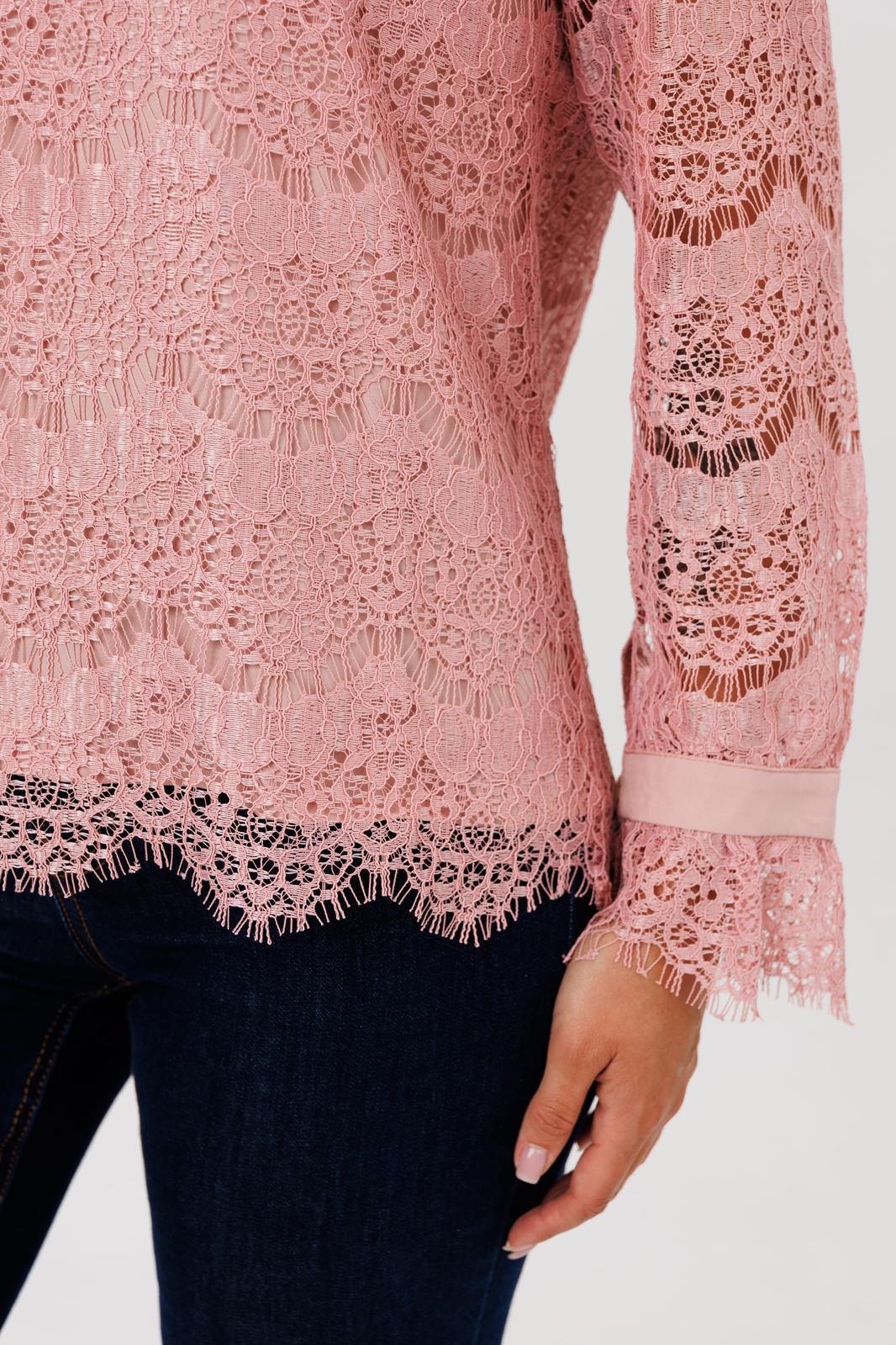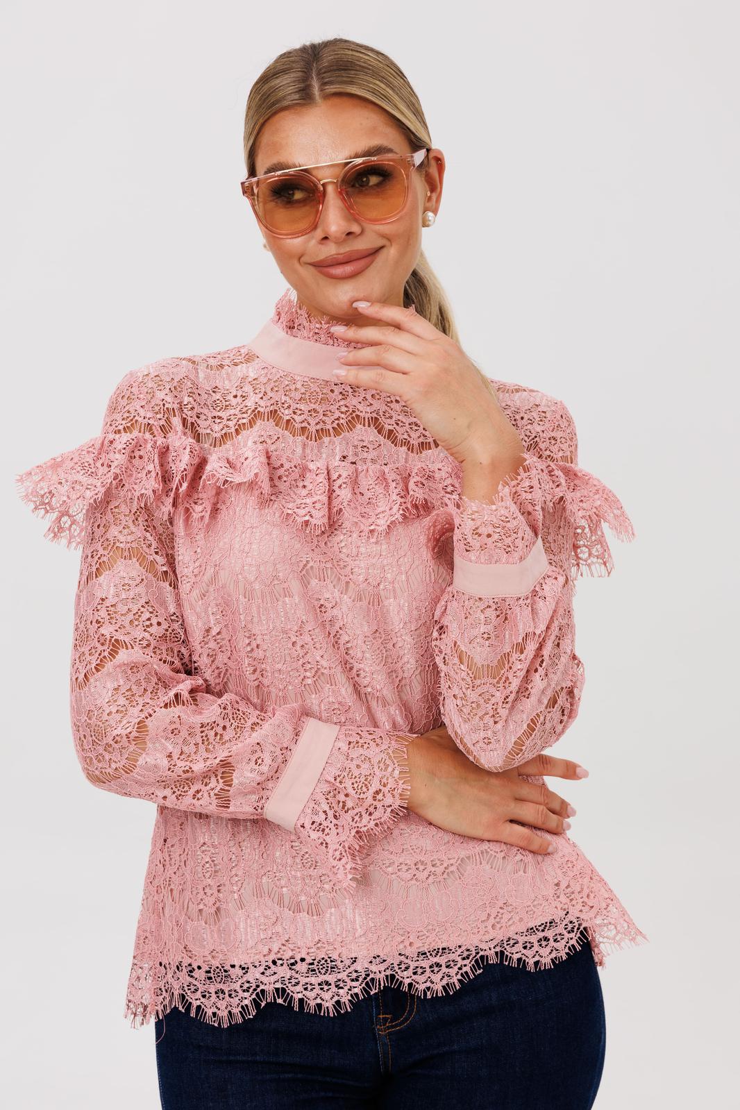 Кокетливая блуза с нотками романтизма выполнена из плотного кружевного полотна. Её прямой силуэт украшен изысканными конструкторскими деталями: отрезные кокетки по переду и спинке мягко подчеркнуты воланом, а воротник-стойка и королевские манжеты на рукавах декорированы ажурной кружевной отделкой. Застёжка на пуговицы, расположенная по задней стойке, добавляет модели особый шарм.